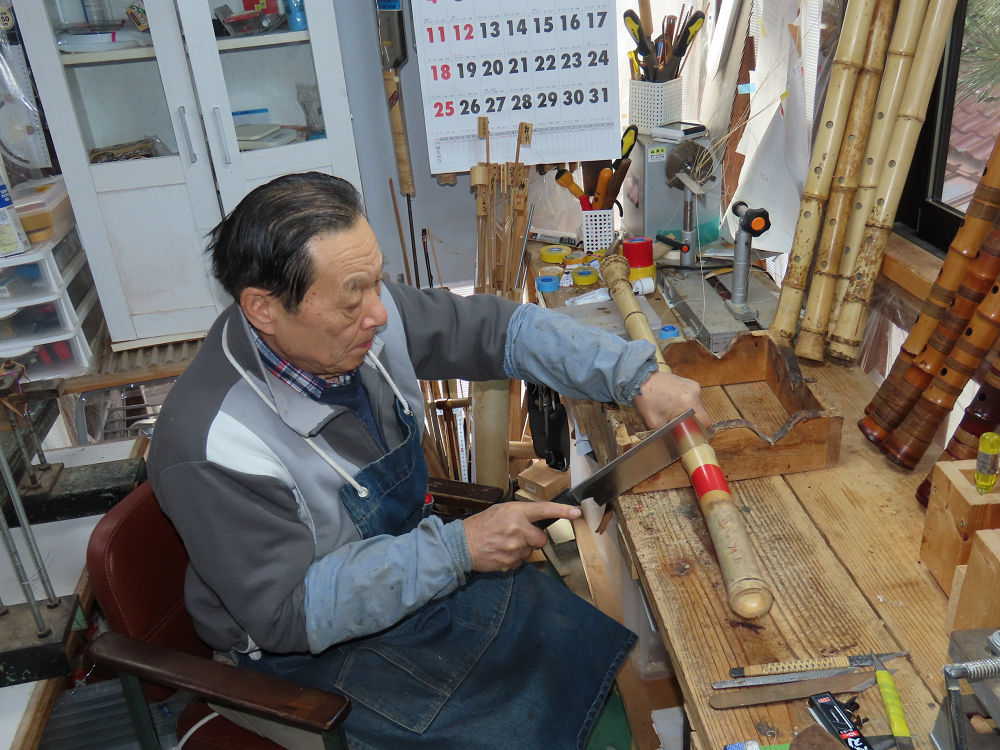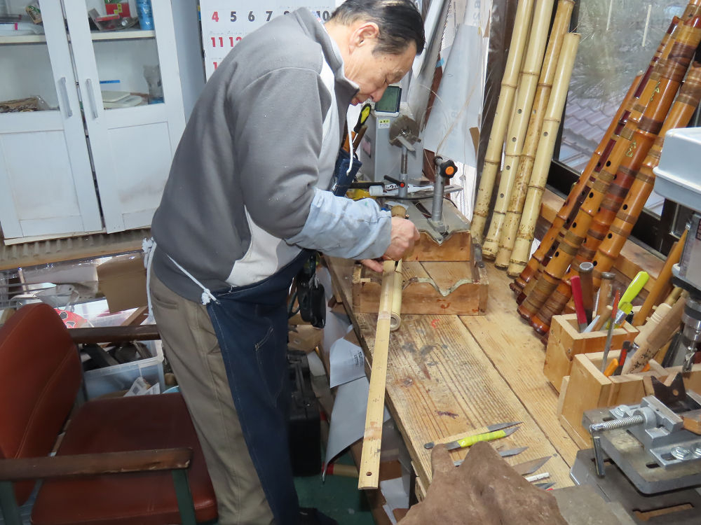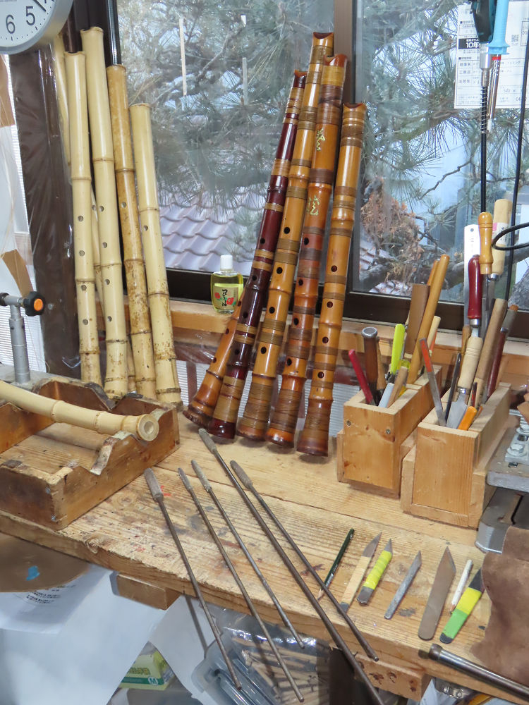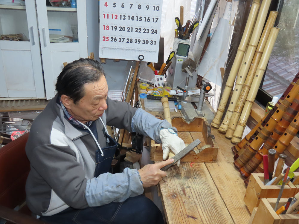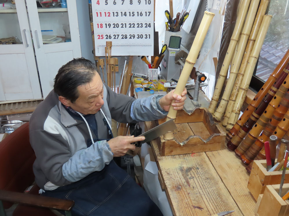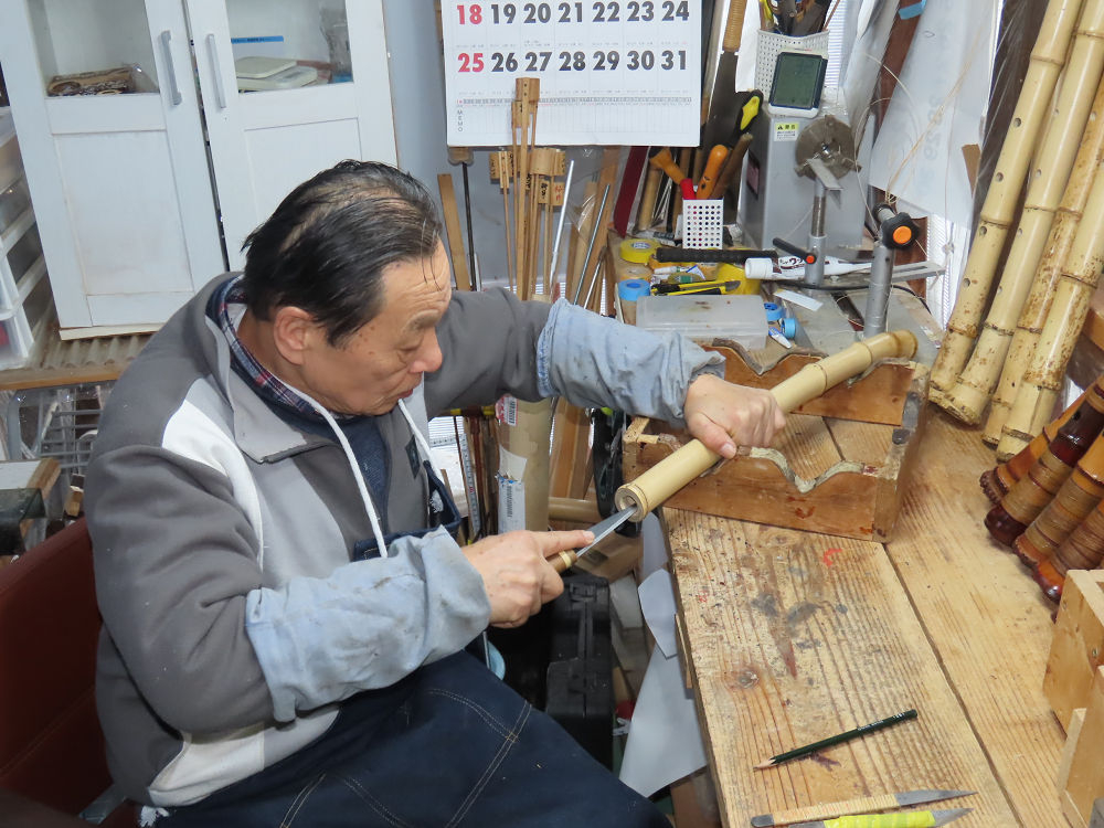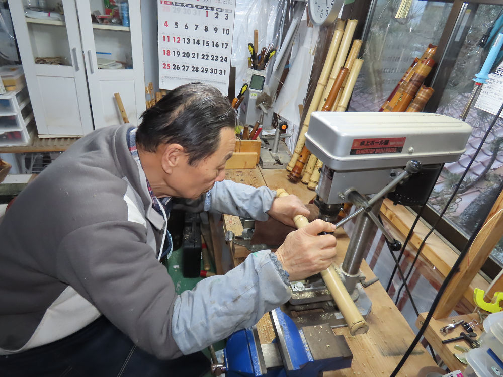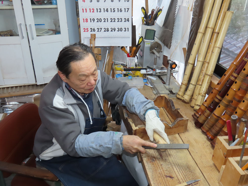 1月2日、3日、4日と雪降りの鳥取県、島根県の温泉に妻と車で出かけました。高速道も通行止めの前に通過することが出来ました。今日から、尺八製作の仕事初めです。先ずは31本の青竹の油抜き作業、午前10時に樫炭に着火して、しばらくしてから備長炭を入れ、火が着くのを待ってから、油抜きを開始しました。今回の備長炭、質が良くなく、着火の時に、粉じん爆発を繰り返すので、近所では、爆竹を鳴らしていると、思ったかも知れません。その合間に裏山では人家に高梁市の天然記念物の猿が出たようで、市の職員が爆竹を鳴らす音が、山に響いていました。31本の油抜きが完了したのは、日没の午後5時30分でした。岡本竹外先生に入門してから、地無し尺八の製作を始めて、46年が過ぎました。入門して7年目に吹き込んだ本曲のテープがありますが、琴古流式の歌口を吹く奏法であることがわかりました。逆複式丹田呼吸法がやっと出来たのは、入門して20年してから、やっと師匠の指導が完成したと思ったら、岡本先生が亡くなりました。若い時に製作した地無し尺八は、歌口を吹いて鳴らす姿でした。岡本竹外先生が50年間愛用された琴古流・大久保甲童作の2尺3寸管、先生が亡くなった後、明暗蒼龍会二代目会長の高橋峰外氏が20年間使用されました。高橋峰外氏が亡くなり、私が引き継ぎましたが、管尻内部も加工され、歌口を吹いて鳴らす尺八で、息受けも無く、なんとか使用したいと、桜井無笛作の地無し管を参考に、修正をして、やっと息受けの良い地無し管になりました。現在、製作しました地無し管は500本ばかりありますが、丹田で鳴らして、息受けが満点の地無し尺八は数本だけです。材質が良く、重たい竹材であっても、息受けが良くないと、歌口を吹く尺八になってしまいます。そんな夢のような地無し尺八を製作するために、今年もまた、竹堀に出かける予定です。