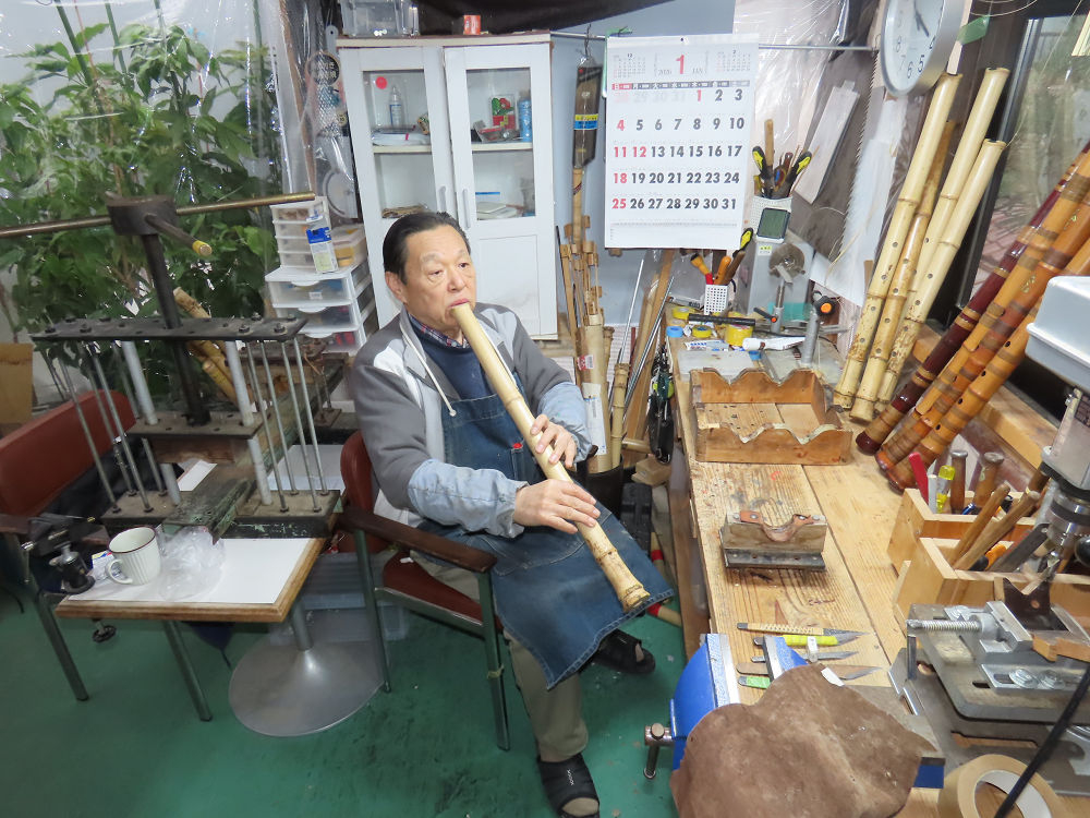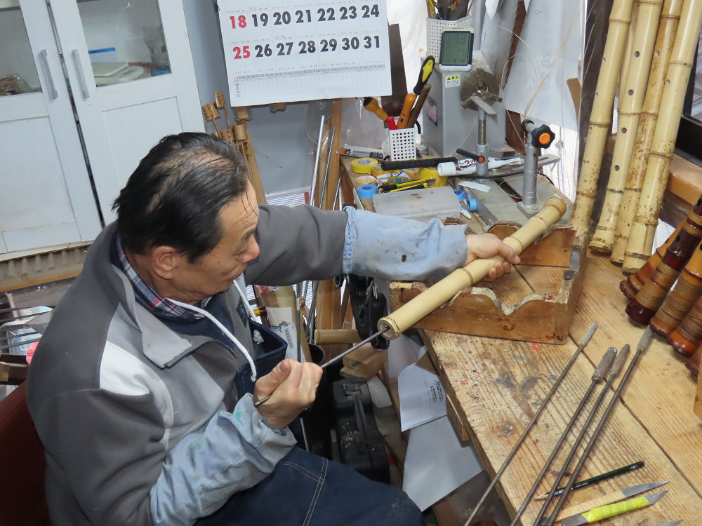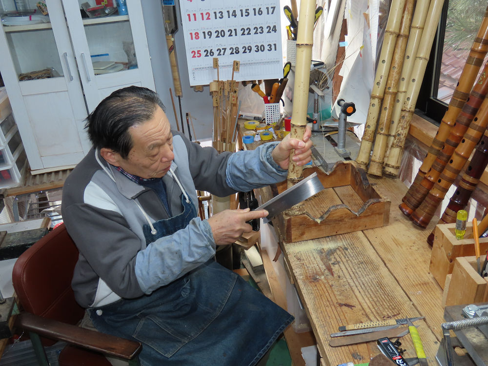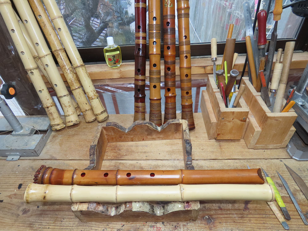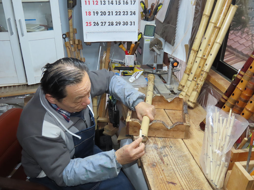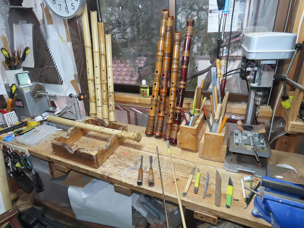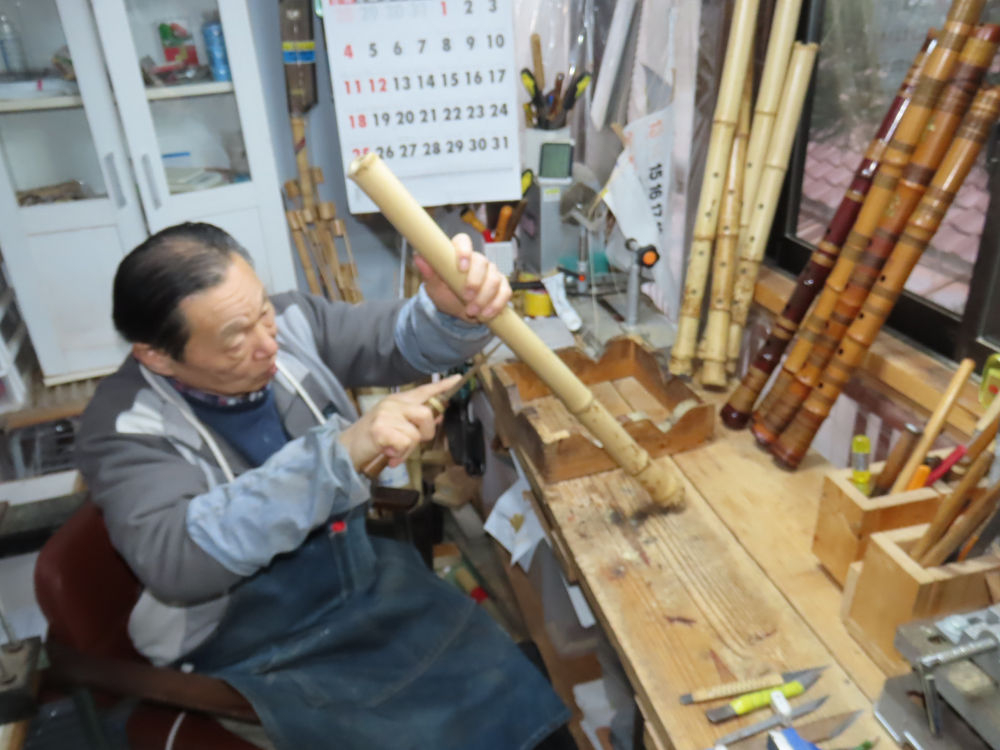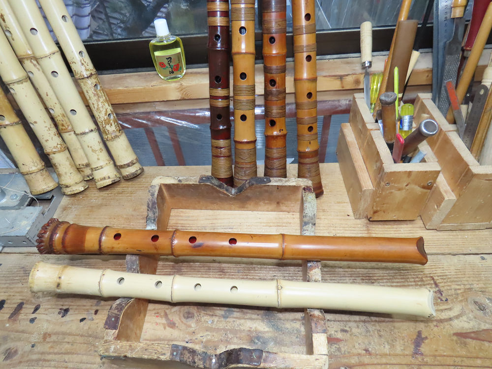1月2日、3日、4日と雪降りの鳥取県、島根県の温泉に妻と車で出かけました。高速道も通行止めの前に通過することが出来ました。今日から、尺八製作の仕事初めです。先ずは31本の青竹の油抜き作業、午前10時に樫炭に着火して、しばらくしてから備長炭を入れ、火が着くのを待ってから、油抜きを開始しました。今回の備長炭、質が良くなく、着火の時に、粉じん爆発を繰り返すので、近所では、爆竹を鳴らしていると、思ったかも知れません。その合間に裏山では人家に高梁市の天然記念物の猿が出たようで、市の職員が爆竹を鳴らす音が、山に響いていました。31本の油抜きが完了したのは、日没の午後5時30分でした。岡本竹外先生に入門してから、地無し尺八の製作を始めて、46年が過ぎました。入門して7年目に吹き込んだ本曲のテープがありますが、琴古流式の歌口を吹く奏法であることがわかりました。逆複式丹田呼吸法がやっと出来たのは、入門して20年してから、やっと師匠の指導が完成したと思ったら、岡本先生が亡くなりました。若い時に製作した地無し尺八は、歌口を吹いて鳴らす姿でした。岡本竹外先生が50年間愛用された琴古流・大久保甲童作の2尺3寸管、先生が亡くなった後、明暗蒼龍会二代目会長の高橋峰外氏が20年間使用されました。高橋峰外氏が亡くなり、私が引き継ぎましたが、管尻内部も加工され、歌口を吹いて鳴らす尺八で、息受けも無く、なんとか使用したいと、桜井無笛作の地無し管を参考に、修正をして、やっと息受けの良い地無し管になりました。現在、製作しました地無し管は500本ばかりありますが、丹田で鳴らして、息受けが満点の地無し尺八は数本だけです。材質が良く、重たい竹材であっても、息受けが良くないと、歌口を吹く尺八になってしまいます。そんな夢のような地無し尺八を製作するために、今年もまた、竹堀に出かける予定です。