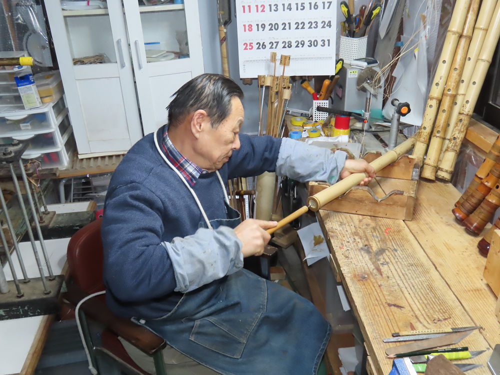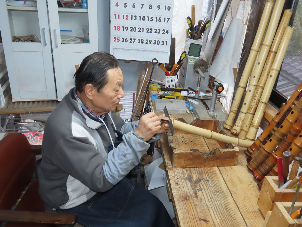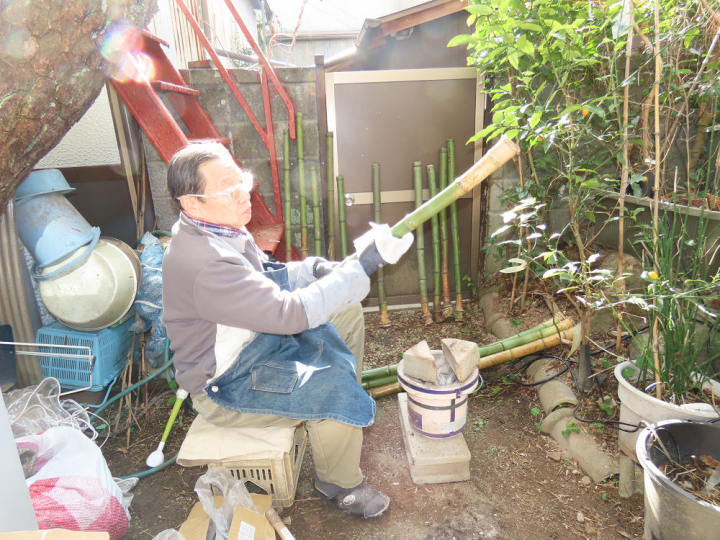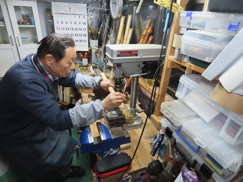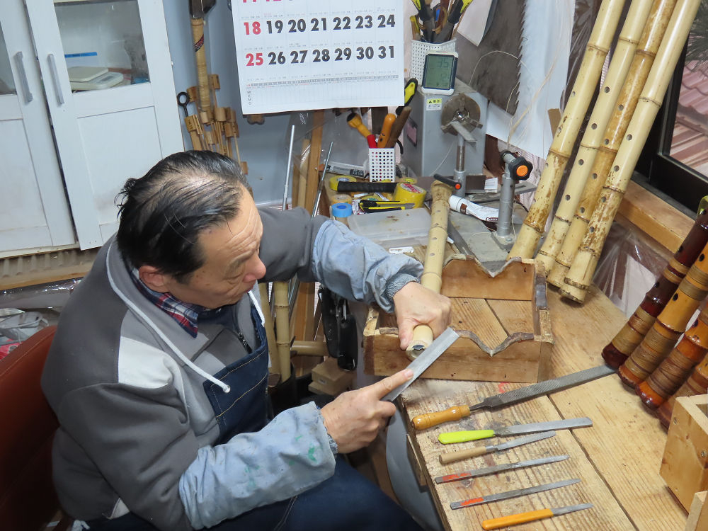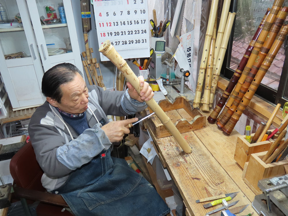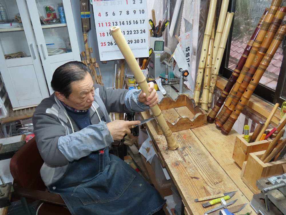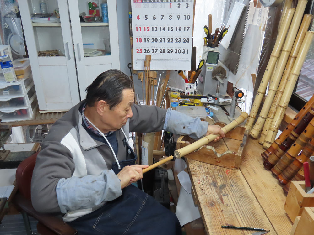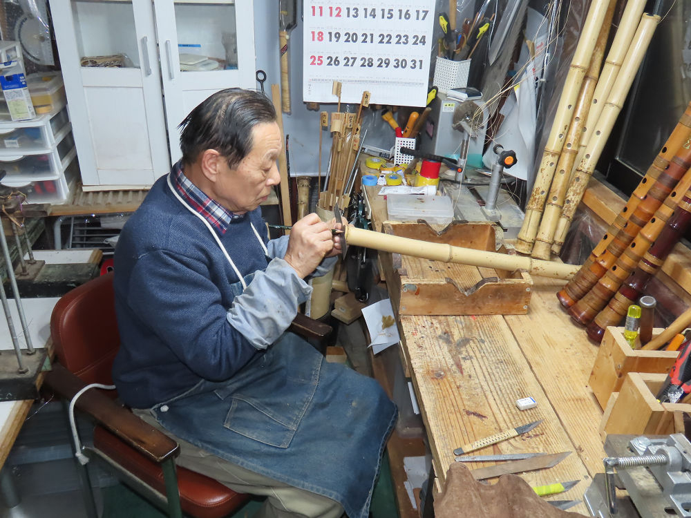 1月2日、3日、4日と雪降りの鳥取県、島根県の温泉に妻と車で出かけました。高速道も通行止めの前に通過することが出来ました。今日から、尺八製作の仕事初めです。先ずは31本の青竹の油抜き作業、午前10時に樫炭に着火して、しばらくしてから備長炭を入れ、火が着くのを待ってから、油抜きを開始しました。今回の備長炭、質が良くなく、着火の時に、粉じん爆発を繰り返すので、近所では、爆竹を鳴らしていると、思ったかも知れません。その合間に裏山では人家に高梁市の天然記念物の猿が出たようで、市の職員が爆竹を鳴らす音が、山に響いていました。31本の油抜きが完了したのは、日没の午後5時30分でした。岡本竹外先生に入門してから、地無し尺八の製作を始めて、46年が過ぎました。入門して7年目に吹き込んだ本曲のテープがありますが、琴古流式の歌口を吹く奏法であることがわかりました。逆複式丹田呼吸法がやっと出来たのは、入門して20年してから、やっと師匠の指導が完成したと思ったら、岡本先生が亡くなりました。若い時に製作した地無し尺八は、歌口を吹いて鳴らす姿でした。岡本竹外先生が50年間愛用された琴古流・大久保甲童作の2尺3寸管、先生が亡くなった後、明暗蒼龍会二代目会長の高橋峰外氏が20年間使用されました。高橋峰外氏が亡くなり、私が引き継ぎましたが、管尻内部も加工され、歌口を吹いて鳴らす尺八で、息受けも無く、なんとか使用したいと、桜井無笛作の地無し管を参考に、修正をして、やっと息受けの良い地無し管になりました。現在、製作しました地無し管は500本ばかりありますが、丹田で鳴らして、息受けが満点の地無し尺八は数本だけです。材質が良く、重たい竹材であっても、息受けが良くないと、歌口を吹く尺八になってしまいます。そんな夢のような地無し尺八を製作するために、今年もまた、竹堀に出かける予定です。
