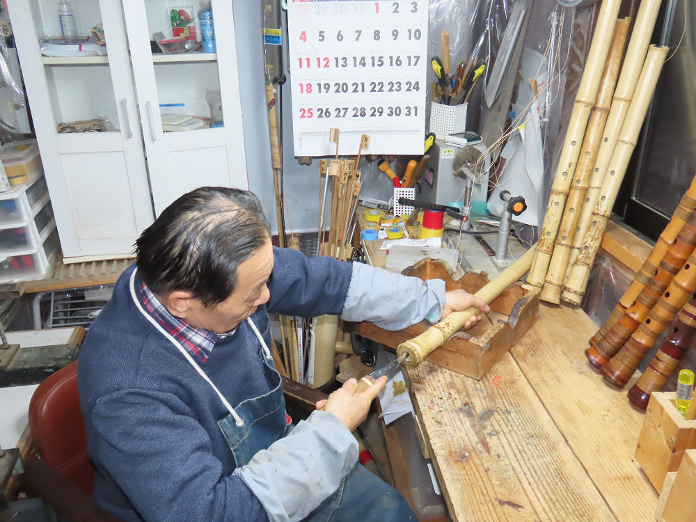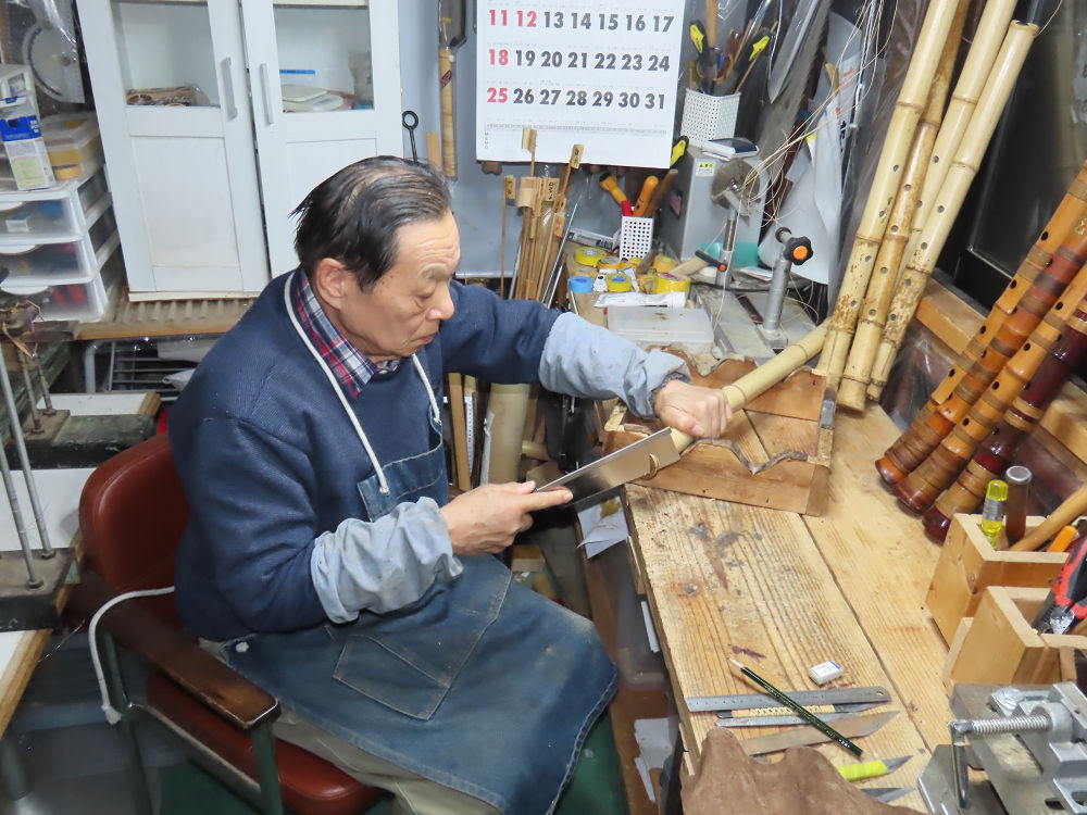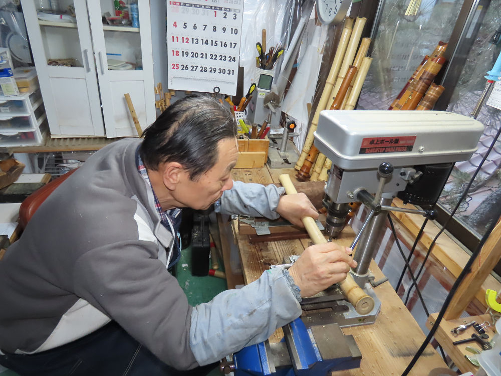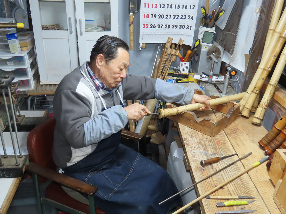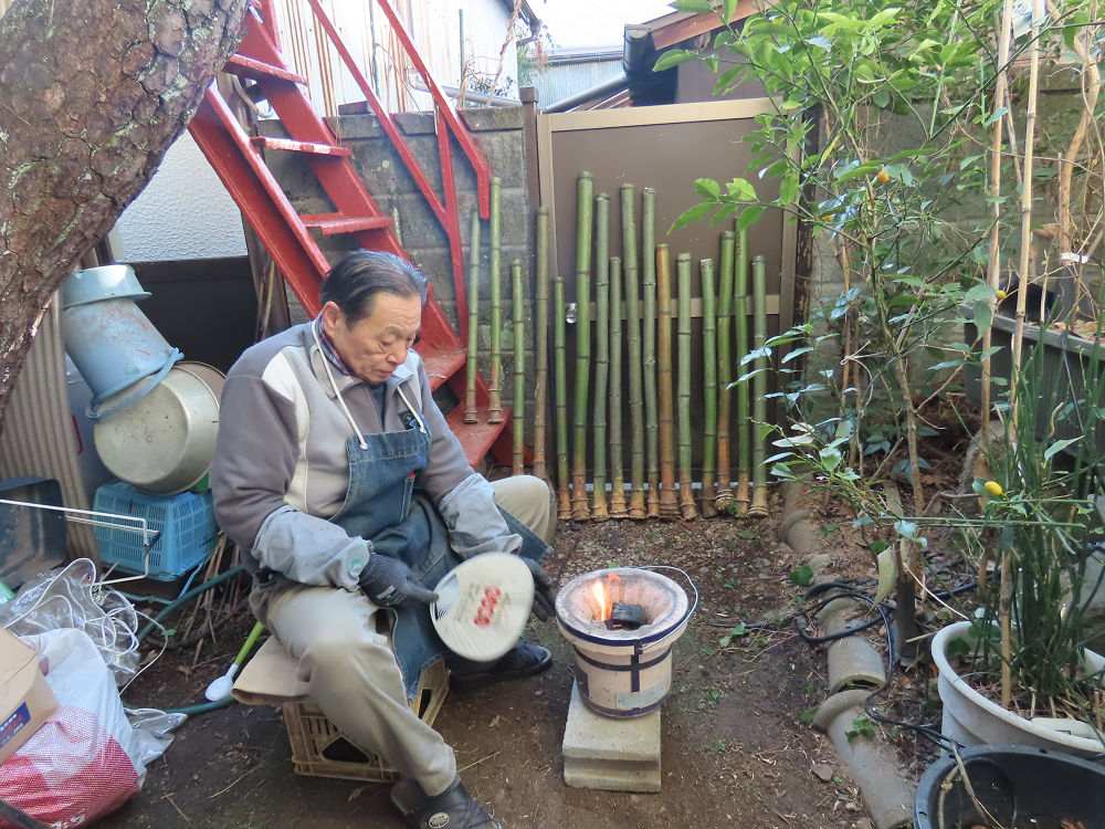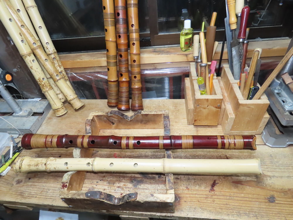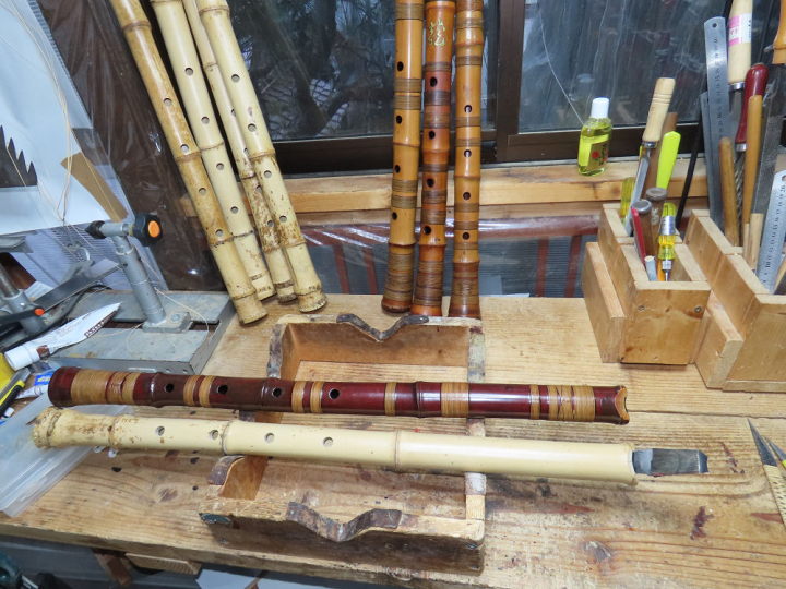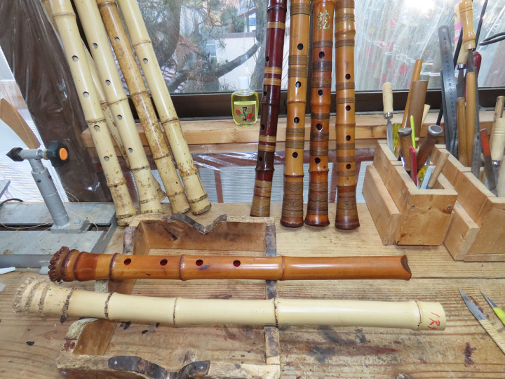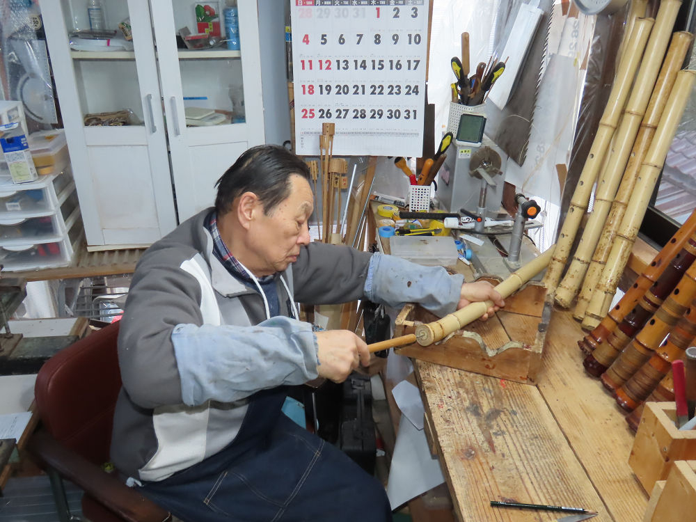 1月2日、3日、4日と雪降りの鳥取県、島根県の温泉に妻と車で出かけました。高速道も通行止めの前に通過することが出来ました。今日から、尺八製作の仕事初めです。先ずは31本の青竹の油抜き作業、午前10時に樫炭に着火して、しばらくしてから備長炭を入れ、火が着くのを待ってから、油抜きを開始しました。今回の備長炭、質が良くなく、着火の時に、粉じん爆発を繰り返すので、近所では、爆竹を鳴らしていると、思ったかも知れません。その合間に裏山では人家に高梁市の天然記念物の猿が出たようで、市の職員が爆竹を鳴らす音が、山に響いていました。31本の油抜きが完了したのは、日没の午後5時30分でした。岡本竹外先生に入門してから、地無し尺八の製作を始めて、46年が過ぎました。入門して7年目に吹き込んだ本曲のテープがありますが、琴古流式の歌口を吹く奏法であることがわかりました。逆複式丹田呼吸法がやっと出来たのは、入門して20年してから、やっと師匠の指導が完成したと思ったら、岡本先生が亡くなりました。若い時に製作した地無し尺八は、歌口を吹いて鳴らす姿でした。岡本竹外先生が50年間愛用された琴古流・大久保甲童作の2尺3寸管、先生が亡くなった後、明暗蒼龍会二代目会長の高橋峰外氏が20年間使用されました。高橋峰外氏が亡くなり、私が引き継ぎましたが、管尻内部も加工され、歌口を吹いて鳴らす尺八で、息受けも無く、なんとか使用したいと、桜井無笛作の地無し管を参考に、修正をして、やっと息受けの良い地無し管になりました。現在、製作しました地無し管は500本ばかりありますが、丹田で鳴らして、息受けが満点の地無し尺八は数本だけです。材質が良く、重たい竹材であっても、息受けが良くないと、歌口を吹く尺八になってしまいます。そんな夢のような地無し尺八を製作するために、今年もまた、竹堀に出かける予定です。