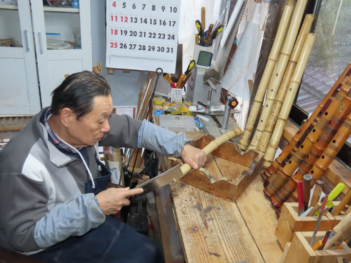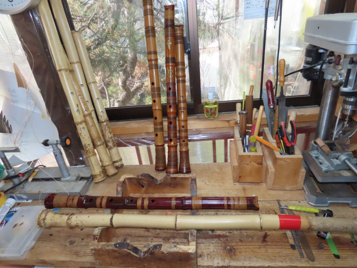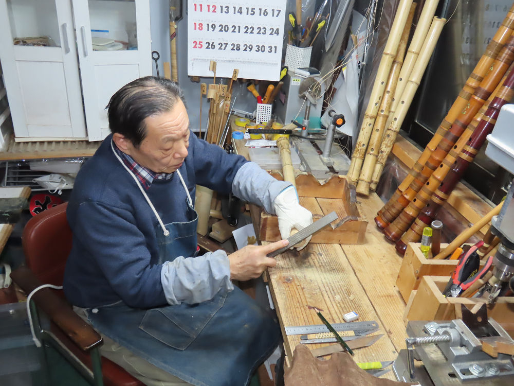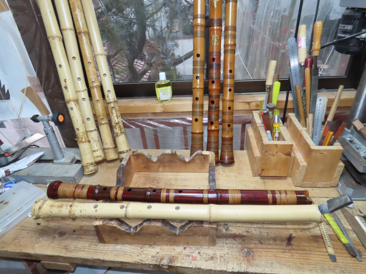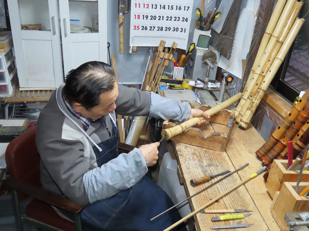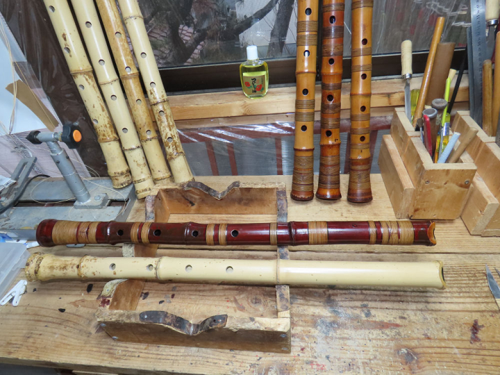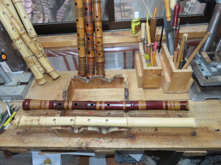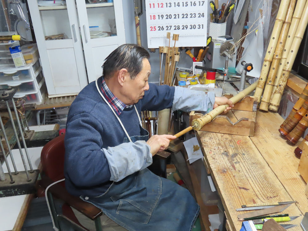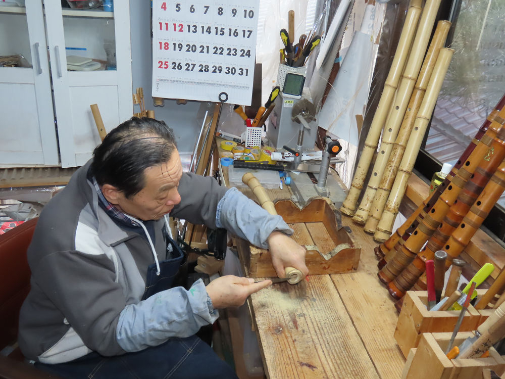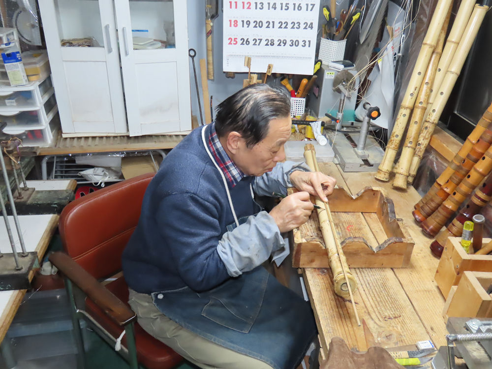 1月2日、3日、4日と雪降りの鳥取県、島根県の温泉に妻と車で出かけました。高速道も通行止めの前に通過することが出来ました。今日から、尺八製作の仕事初めです。先ずは31本の青竹の油抜き作業、午前10時に樫炭に着火して、しばらくしてから備長炭を入れ、火が着くのを待ってから、油抜きを開始しました。今回の備長炭、質が良くなく、着火の時に、粉じん爆発を繰り返すので、近所では、爆竹を鳴らしていると、思ったかも知れません。その合間に裏山では人家に高梁市の天然記念物の猿が出たようで、市の職員が爆竹を鳴らす音が、山に響いていました。31本の油抜きが完了したのは、日没の午後5時30分でした。岡本竹外先生に入門してから、地無し尺八の製作を始めて、46年が過ぎました。入門して7年目に吹き込んだ本曲のテープがありますが、琴古流式の歌口を吹く奏法であることがわかりました。逆複式丹田呼吸法がやっと出来たのは、入門して20年してから、やっと師匠の指導が完成したと思ったら、岡本先生が亡くなりました。若い時に製作した地無し尺八は、歌口を吹いて鳴らす姿でした。岡本竹外先生が50年間愛用された琴古流・大久保甲童作の2尺3寸管、先生が亡くなった後、明暗蒼龍会二代目会長の高橋峰外氏が20年間使用されました。高橋峰外氏が亡くなり、私が引き継ぎましたが、管尻内部も加工され、歌口を吹いて鳴らす尺八で、息受けも無く、なんとか使用したいと、桜井無笛作の地無し管を参考に、修正をして、やっと息受けの良い地無し管になりました。現在、製作しました地無し管は500本ばかりありますが、丹田で鳴らして、息受けが満点の地無し尺八は数本だけです。材質が良く、重たい竹材であっても、息受けが良くないと、歌口を吹く尺八になってしまいます。そんな夢のような地無し尺八を製作するために、今年もまた、竹堀に出かける予定です。