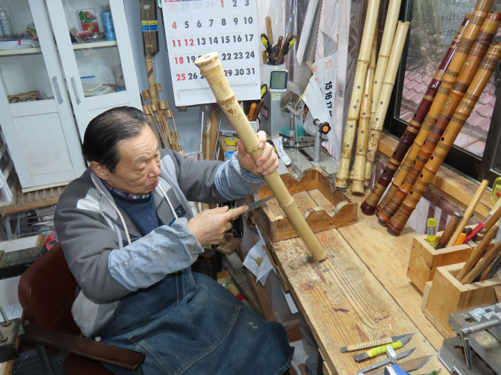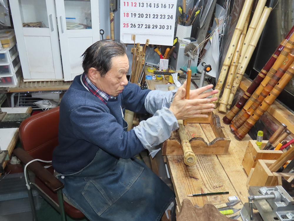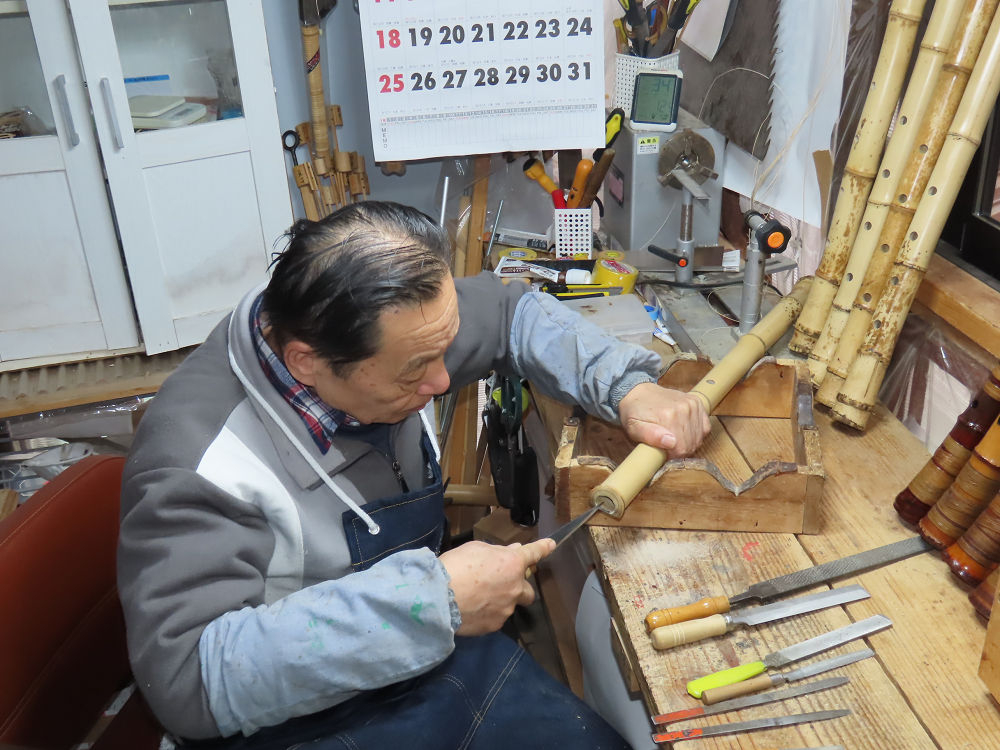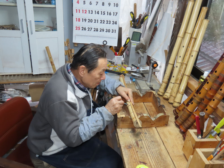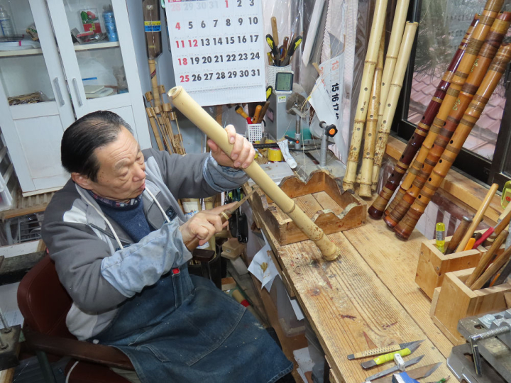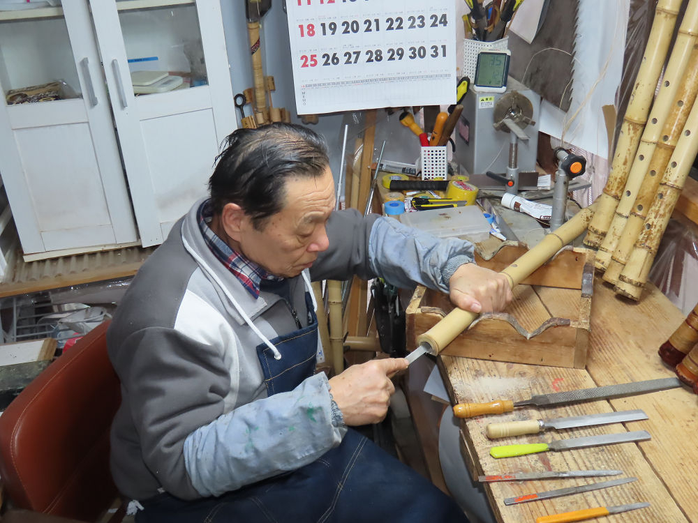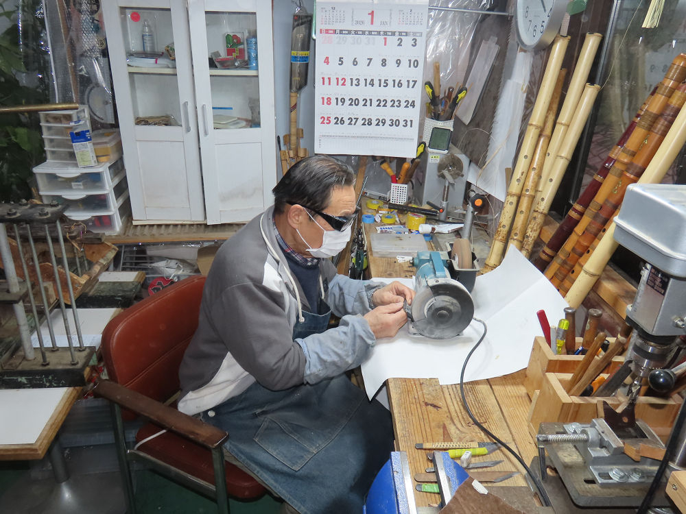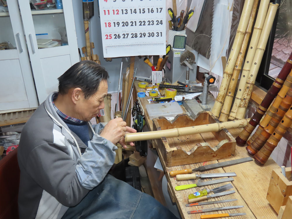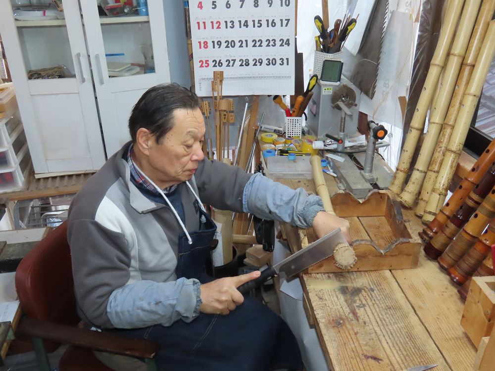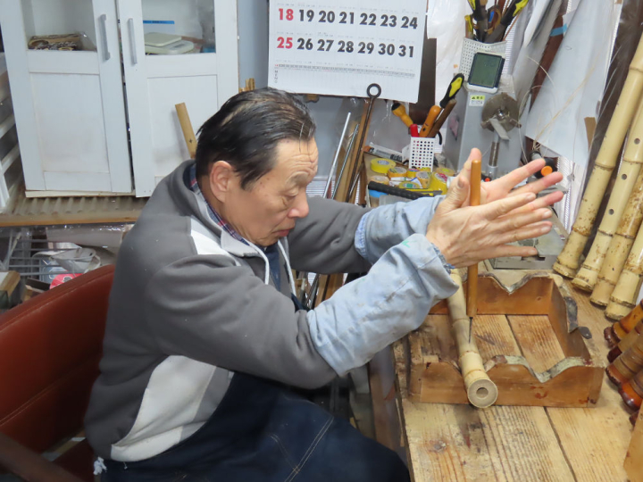 1月2日、3日、4日と雪降りの鳥取県、島根県の温泉に妻と車で出かけました。高速道も通行止めの前に通過することが出来ました。今日から、尺八製作の仕事初めです。先ずは31本の青竹の油抜き作業、午前10時に樫炭に着火して、しばらくしてから備長炭を入れ、火が着くのを待ってから、油抜きを開始しました。今回の備長炭、質が良くなく、着火の時に、粉じん爆発を繰り返すので、近所では、爆竹を鳴らしていると、思ったかも知れません。その合間に裏山では人家に高梁市の天然記念物の猿が出たようで、市の職員が爆竹を鳴らす音が、山に響いていました。31本の油抜きが完了したのは、日没の午後5時30分でした。岡本竹外先生に入門してから、地無し尺八の製作を始めて、46年が過ぎました。入門して7年目に吹き込んだ本曲のテープがありますが、琴古流式の歌口を吹く奏法であることがわかりました。逆複式丹田呼吸法がやっと出来たのは、入門して20年してから、やっと師匠の指導が完成したと思ったら、岡本先生が亡くなりました。若い時に製作した地無し尺八は、歌口を吹いて鳴らす姿でした。岡本竹外先生が50年間愛用された琴古流・大久保甲童作の2尺3寸管、先生が亡くなった後、明暗蒼龍会二代目会長の高橋峰外氏が20年間使用されました。高橋峰外氏が亡くなり、私が引き継ぎましたが、管尻内部も加工され、歌口を吹いて鳴らす尺八で、息受けも無く、なんとか使用したいと、桜井無笛作の地無し管を参考に、修正をして、やっと息受けの良い地無し管になりました。現在、製作しました地無し管は500本ばかりありますが、丹田で鳴らして、息受けが満点の地無し尺八は数本だけです。材質が良く、重たい竹材であっても、息受けが良くないと、歌口を吹く尺八になってしまいます。そんな夢のような地無し尺八を製作するために、今年もまた、竹堀に出かける予定です。