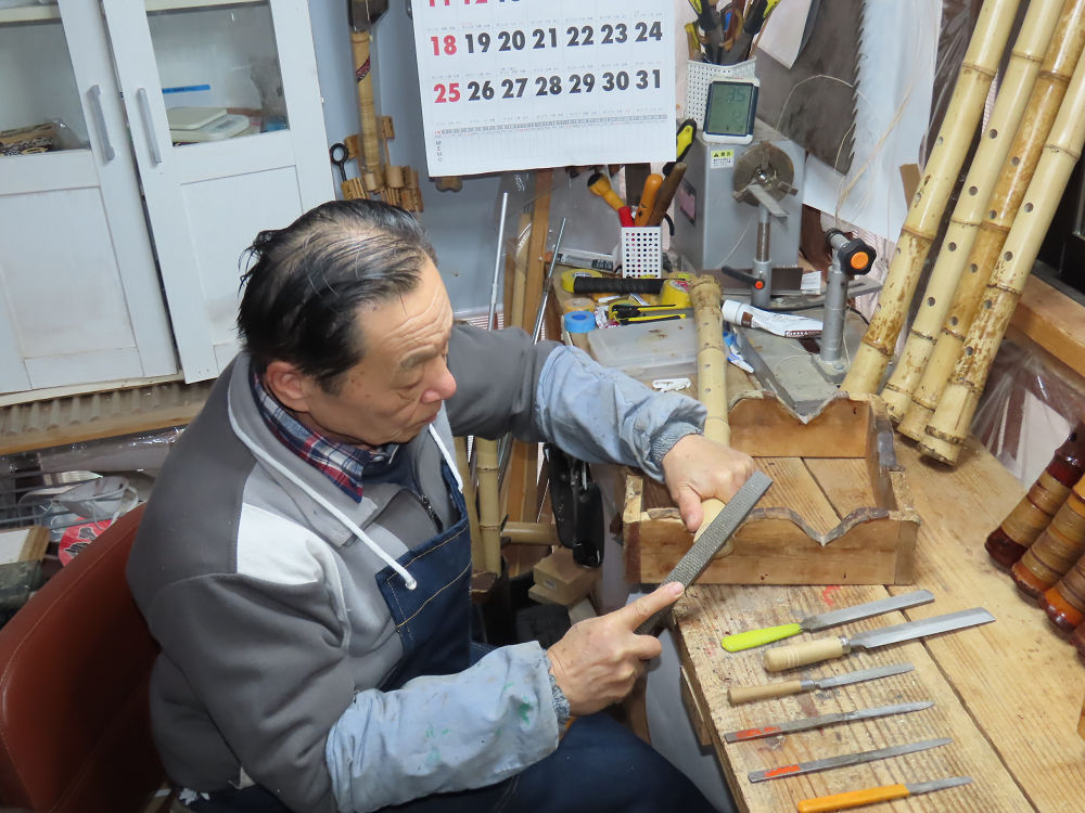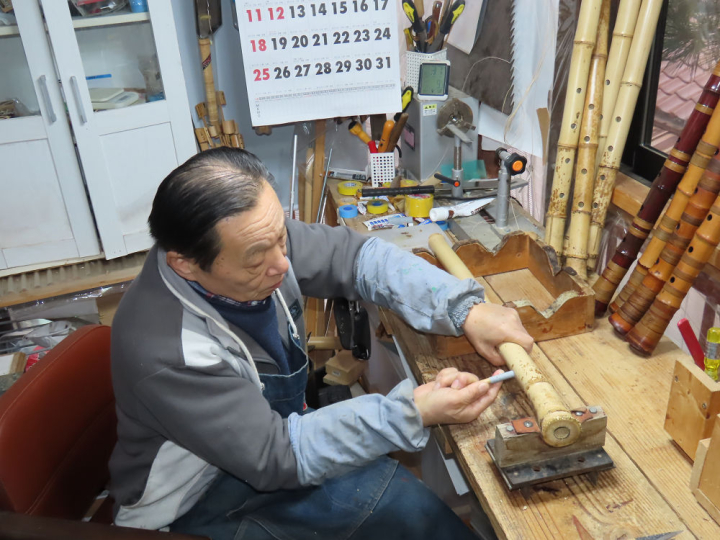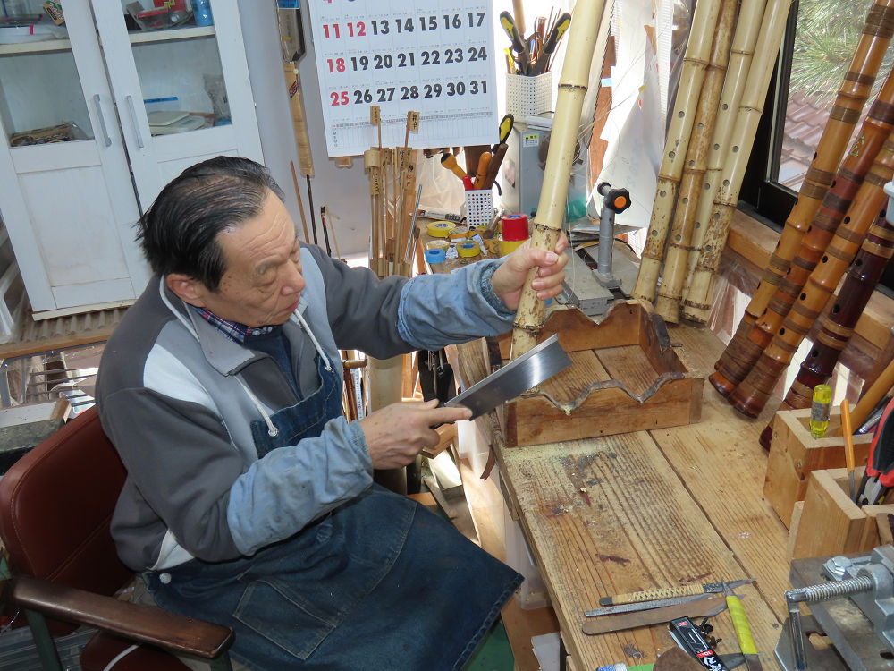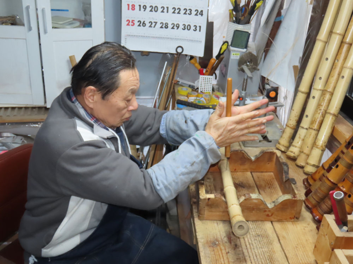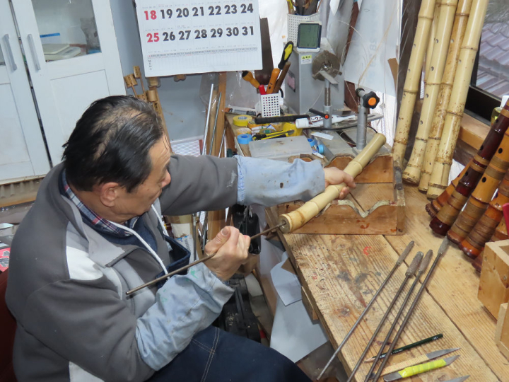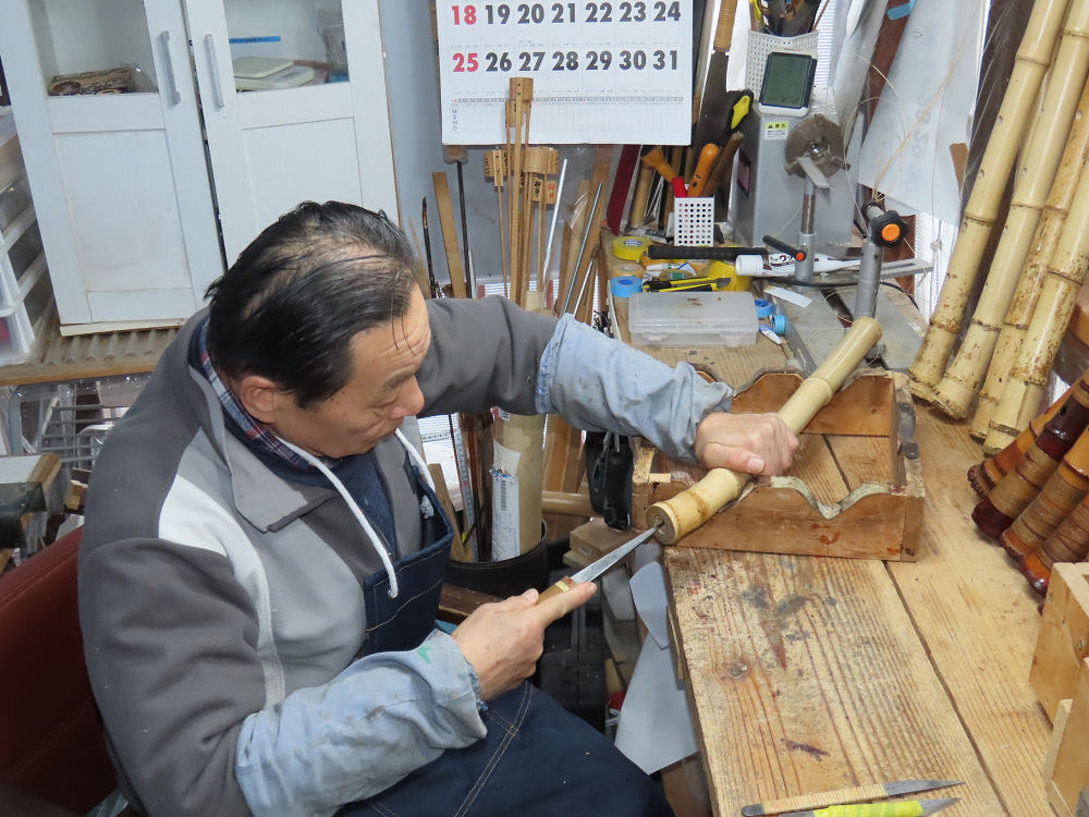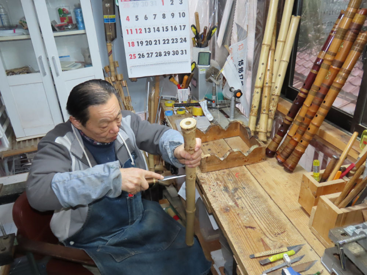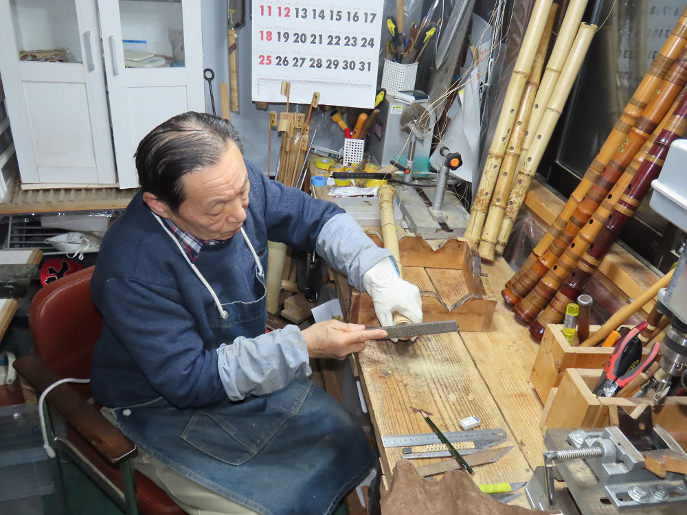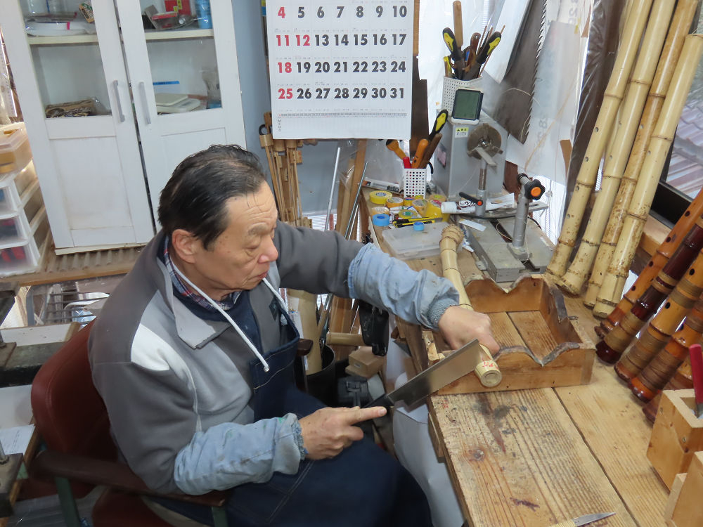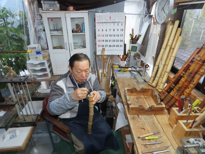 1月2日、3日、4日と雪降りの鳥取県、島根県の温泉に妻と車で出かけました。高速道も通行止めの前に通過することが出来ました。今日から、尺八製作の仕事初めです。先ずは31本の青竹の油抜き作業、午前10時に樫炭に着火して、しばらくしてから備長炭を入れ、火が着くのを待ってから、油抜きを開始しました。今回の備長炭、質が良くなく、着火の時に、粉じん爆発を繰り返すので、近所では、爆竹を鳴らしていると、思ったかも知れません。その合間に裏山では人家に高梁市の天然記念物の猿が出たようで、市の職員が爆竹を鳴らす音が、山に響いていました。31本の油抜きが完了したのは、日没の午後5時30分でした。岡本竹外先生に入門してから、地無し尺八の製作を始めて、46年が過ぎました。入門して7年目に吹き込んだ本曲のテープがありますが、琴古流式の歌口を吹く奏法であることがわかりました。逆複式丹田呼吸法がやっと出来たのは、入門して20年してから、やっと師匠の指導が完成したと思ったら、岡本先生が亡くなりました。若い時に製作した地無し尺八は、歌口を吹いて鳴らす姿でした。岡本竹外先生が50年間愛用された琴古流・大久保甲童作の2尺3寸管、先生が亡くなった後、明暗蒼龍会二代目会長の高橋峰外氏が20年間使用されました。高橋峰外氏が亡くなり、私が引き継ぎましたが、管尻内部も加工され、歌口を吹いて鳴らす尺八で、息受けも無く、なんとか使用したいと、桜井無笛作の地無し管を参考に、修正をして、やっと息受けの良い地無し管になりました。現在、製作しました地無し管は500本ばかりありますが、丹田で鳴らして、息受けが満点の地無し尺八は数本だけです。材質が良く、重たい竹材であっても、息受けが良くないと、歌口を吹く尺八になってしまいます。そんな夢のような地無し尺八を製作するために、今年もまた、竹堀に出かける予定です。