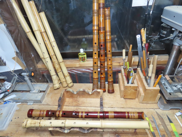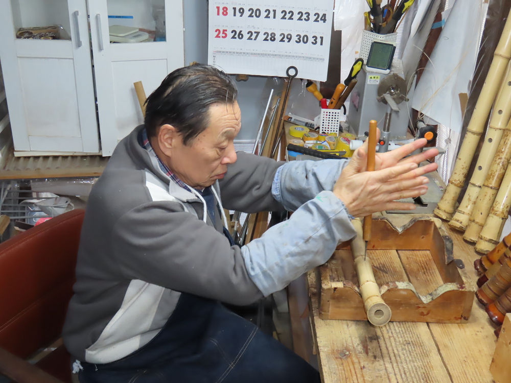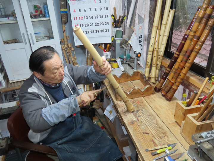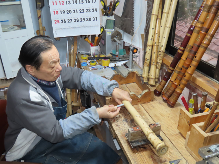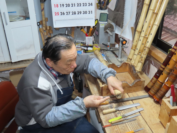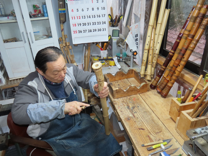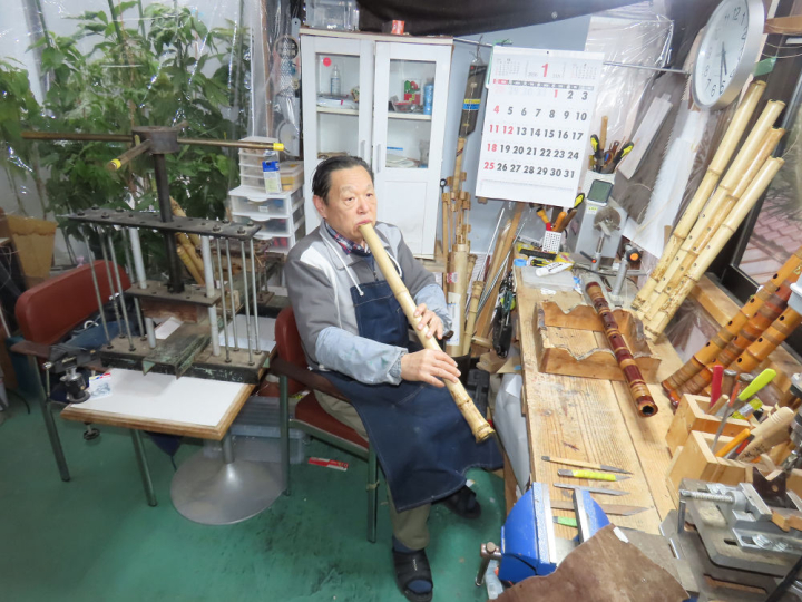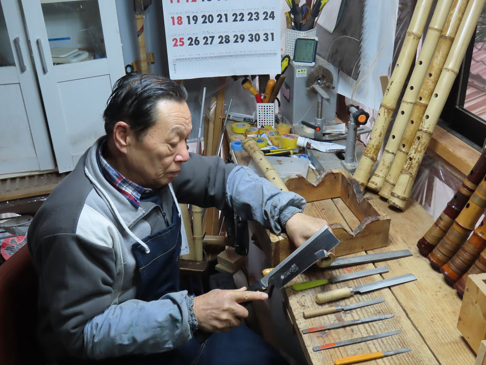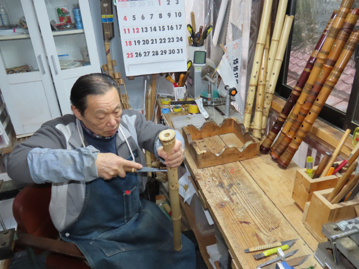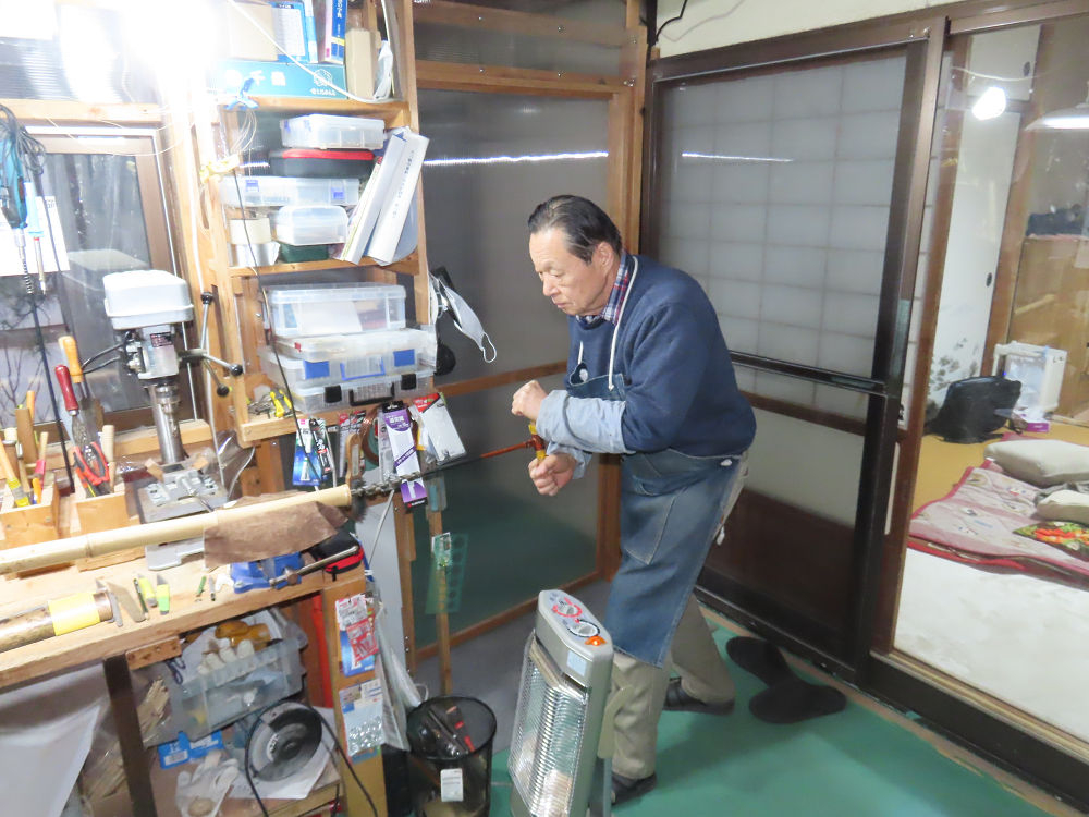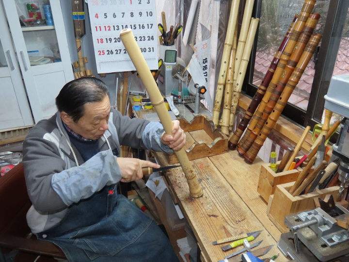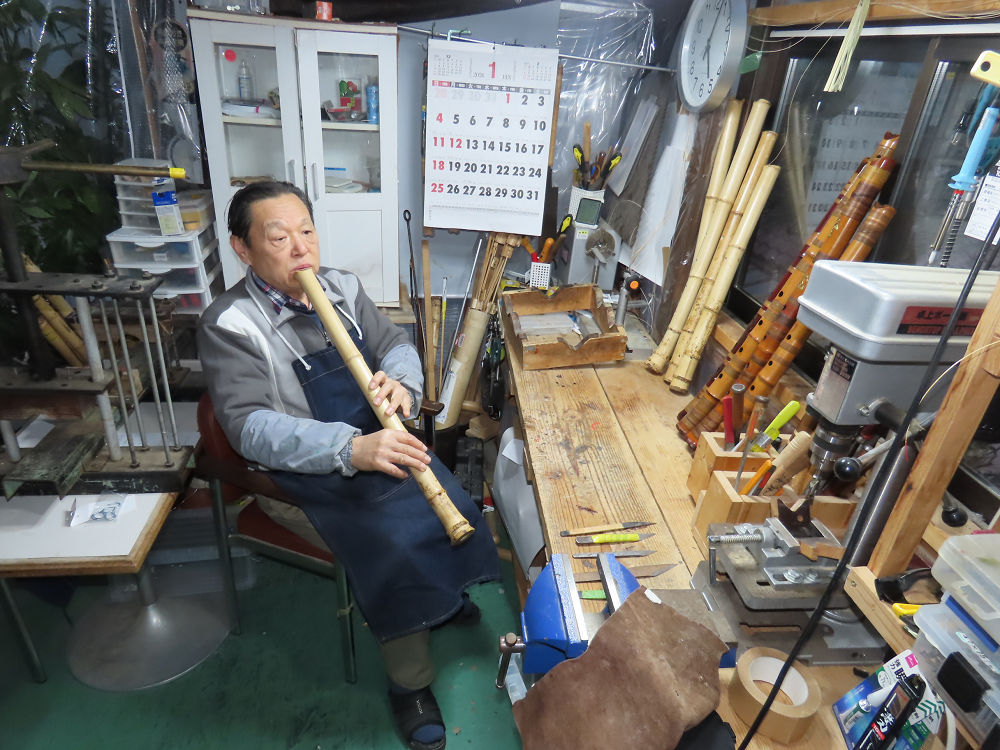 1月2日、3日、4日と雪降りの鳥取県、島根県の温泉に妻と車で出かけました。高速道も通行止めの前に通過することが出来ました。今日から、尺八製作の仕事初めです。先ずは31本の青竹の油抜き作業、午前10時に樫炭に着火して、しばらくしてから備長炭を入れ、火が着くのを待ってから、油抜きを開始しました。今回の備長炭、質が良くなく、着火の時に、粉じん爆発を繰り返すので、近所では、爆竹を鳴らしていると、思ったかも知れません。その合間に裏山では人家に高梁市の天然記念物の猿が出たようで、市の職員が爆竹を鳴らす音が、山に響いていました。31本の油抜きが完了したのは、日没の午後5時30分でした。岡本竹外先生に入門してから、地無し尺八の製作を始めて、46年が過ぎました。入門して7年目に吹き込んだ本曲のテープがありますが、琴古流式の歌口を吹く奏法であることがわかりました。逆複式丹田呼吸法がやっと出来たのは、入門して20年してから、やっと師匠の指導が完成したと思ったら、岡本先生が亡くなりました。若い時に製作した地無し尺八は、歌口を吹いて鳴らす姿でした。岡本竹外先生が50年間愛用された琴古流・大久保甲童作の2尺3寸管、先生が亡くなった後、明暗蒼龍会二代目会長の高橋峰外氏が20年間使用されました。高橋峰外氏が亡くなり、私が引き継ぎましたが、管尻内部も加工され、歌口を吹いて鳴らす尺八で、息受けも無く、なんとか使用したいと、桜井無笛作の地無し管を参考に、修正をして、やっと息受けの良い地無し管になりました。現在、製作しました地無し管は500本ばかりありますが、丹田で鳴らして、息受けが満点の地無し尺八は数本だけです。材質が良く、重たい竹材であっても、息受けが良くないと、歌口を吹く尺八になってしまいます。そんな夢のような地無し尺八を製作するために、今年もまた、竹堀に出かける予定です。