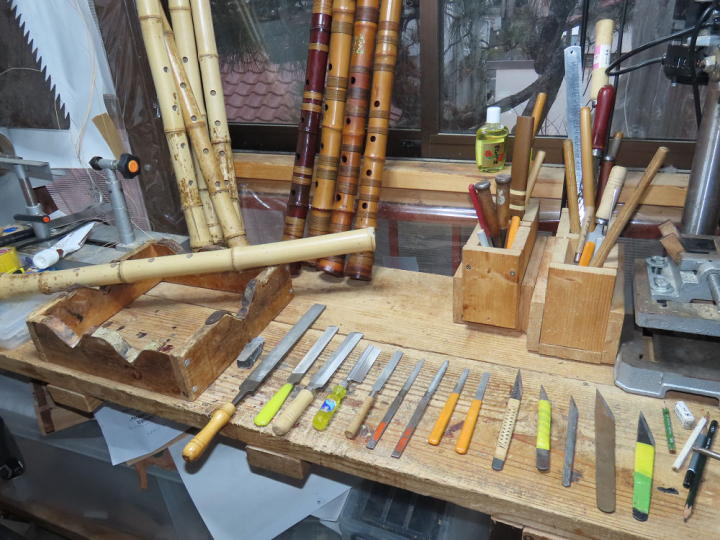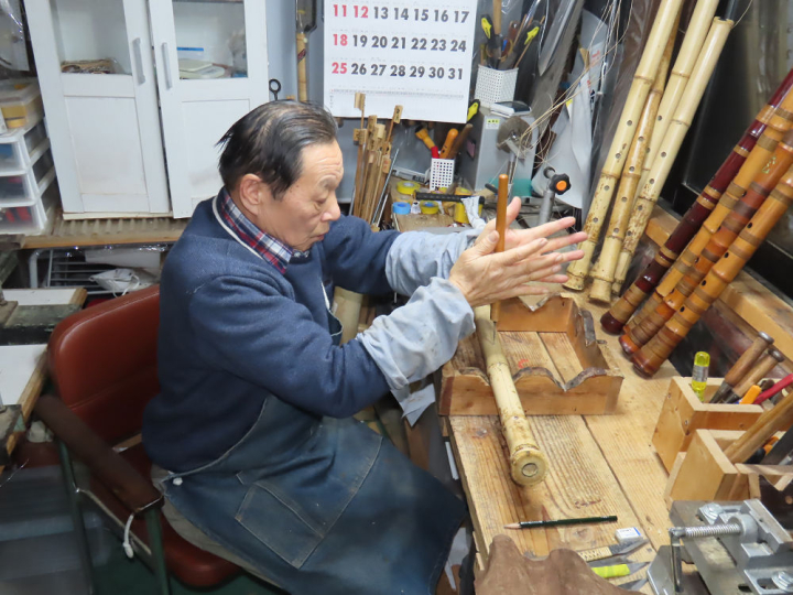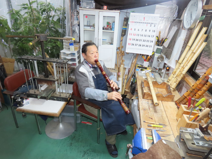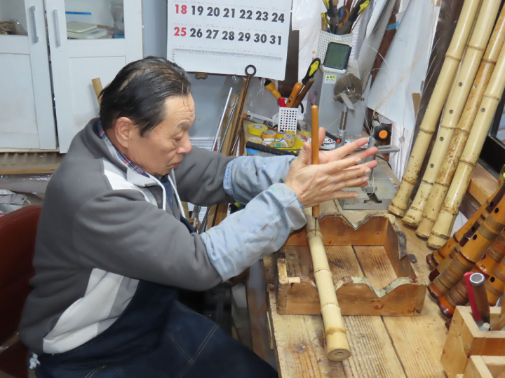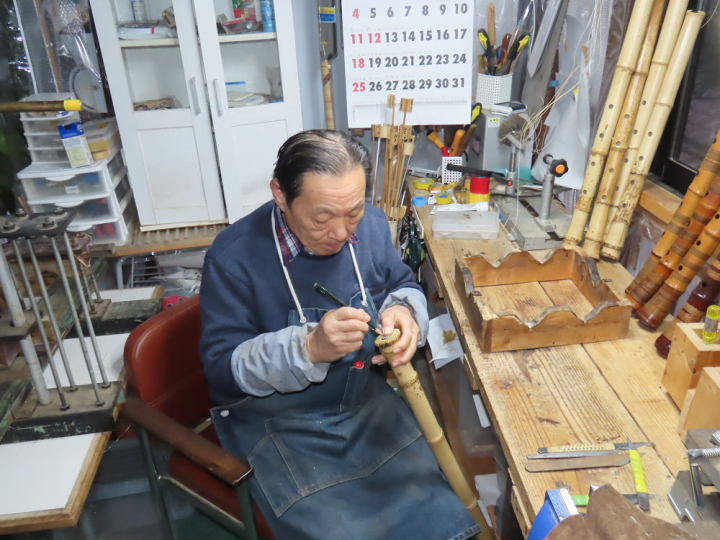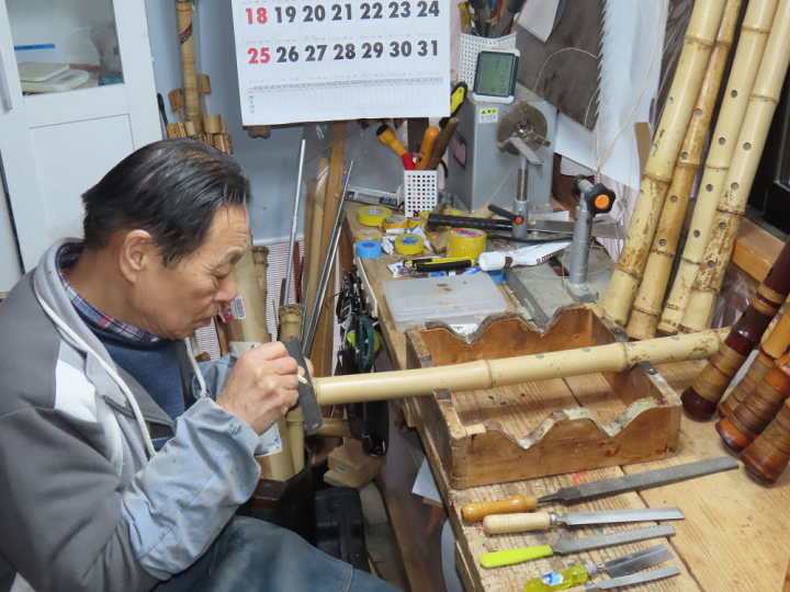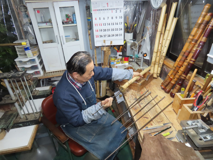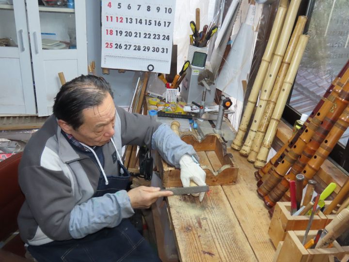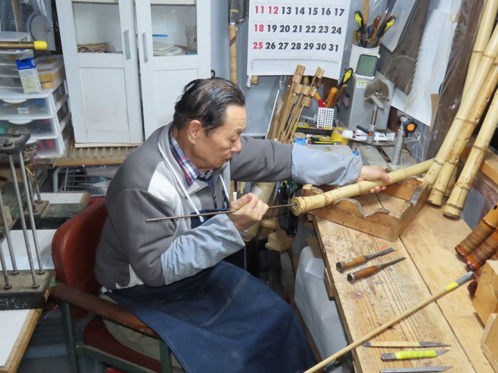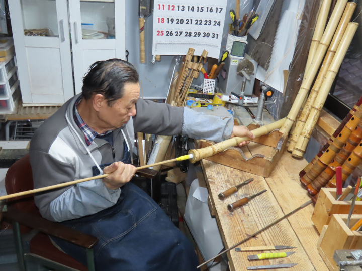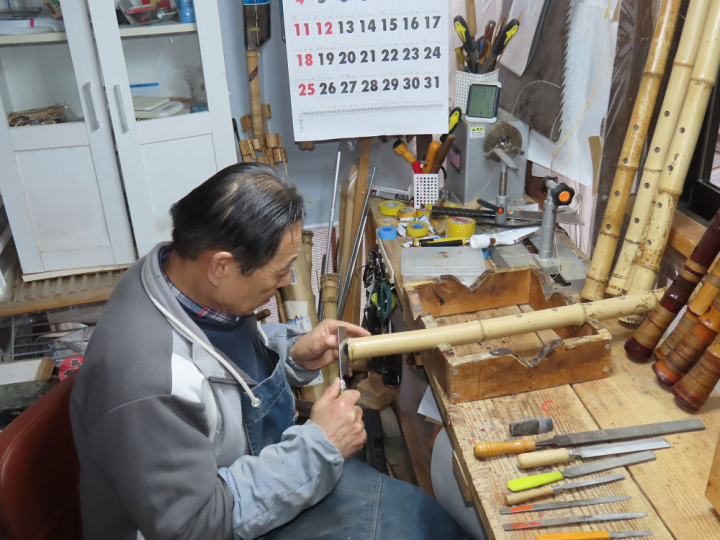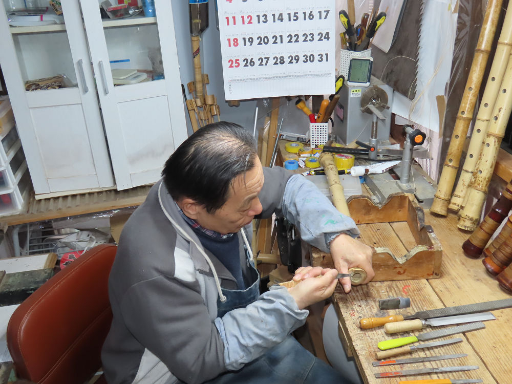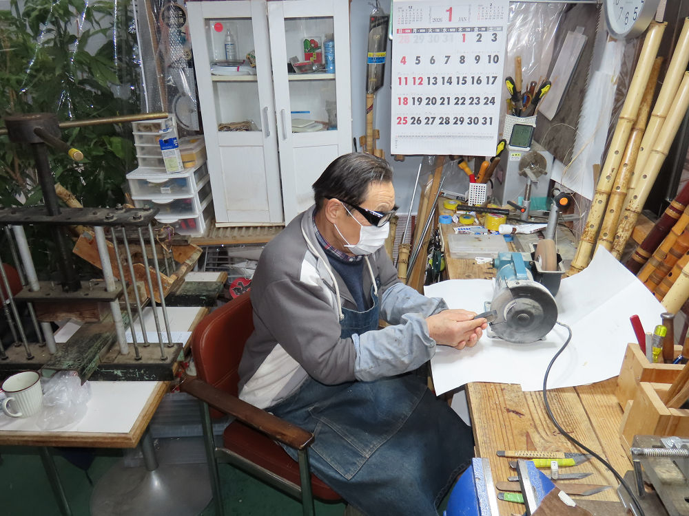 1月2日、3日、4日と雪降りの鳥取県、島根県の温泉に妻と車で出かけました。高速道も通行止めの前に通過することが出来ました。今日から、尺八製作の仕事初めです。先ずは31本の青竹の油抜き作業、午前10時に樫炭に着火して、しばらくしてから備長炭を入れ、火が着くのを待ってから、油抜きを開始しました。今回の備長炭、質が良くなく、着火の時に、粉じん爆発を繰り返すので、近所では、爆竹を鳴らしていると、思ったかも知れません。その合間に裏山では人家に高梁市の天然記念物の猿が出たようで、市の職員が爆竹を鳴らす音が、山に響いていました。31本の油抜きが完了したのは、日没の午後5時30分でした。岡本竹外先生に入門してから、地無し尺八の製作を始めて、46年が過ぎました。入門して7年目に吹き込んだ本曲のテープがありますが、琴古流式の歌口を吹く奏法であることがわかりました。逆複式丹田呼吸法がやっと出来たのは、入門して20年してから、やっと師匠の指導が完成したと思ったら、岡本先生が亡くなりました。若い時に製作した地無し尺八は、歌口を吹いて鳴らす姿でした。岡本竹外先生が50年間愛用された琴古流・大久保甲童作の2尺3寸管、先生が亡くなった後、明暗蒼龍会二代目会長の高橋峰外氏が20年間使用されました。高橋峰外氏が亡くなり、私が引き継ぎましたが、管尻内部も加工され、歌口を吹いて鳴らす尺八で、息受けも無く、なんとか使用したいと、桜井無笛作の地無し管を参考に、修正をして、やっと息受けの良い地無し管になりました。現在、製作しました地無し管は500本ばかりありますが、丹田で鳴らして、息受けが満点の地無し尺八は数本だけです。材質が良く、重たい竹材であっても、息受けが良くないと、歌口を吹く尺八になってしまいます。そんな夢のような地無し尺八を製作するために、今年もまた、竹堀に出かける予定です。
