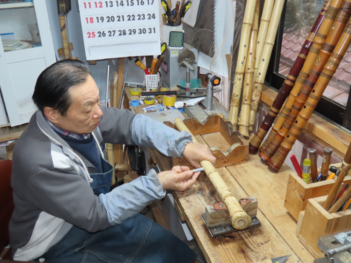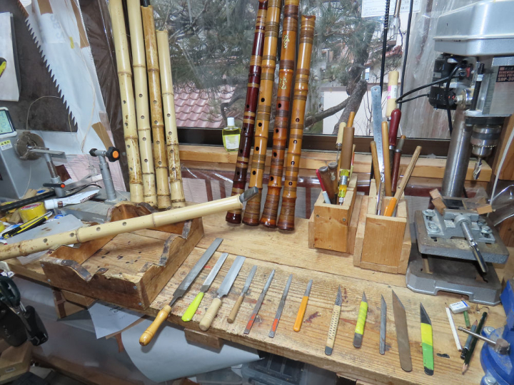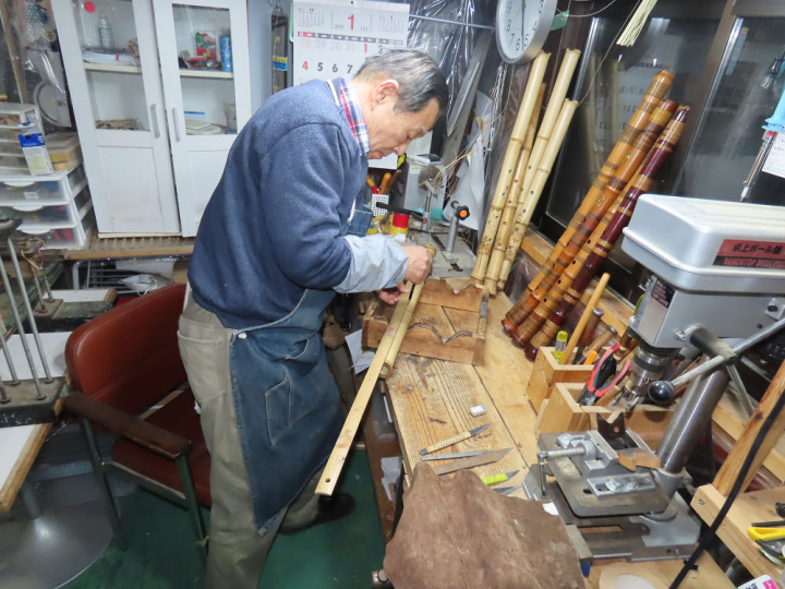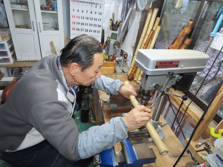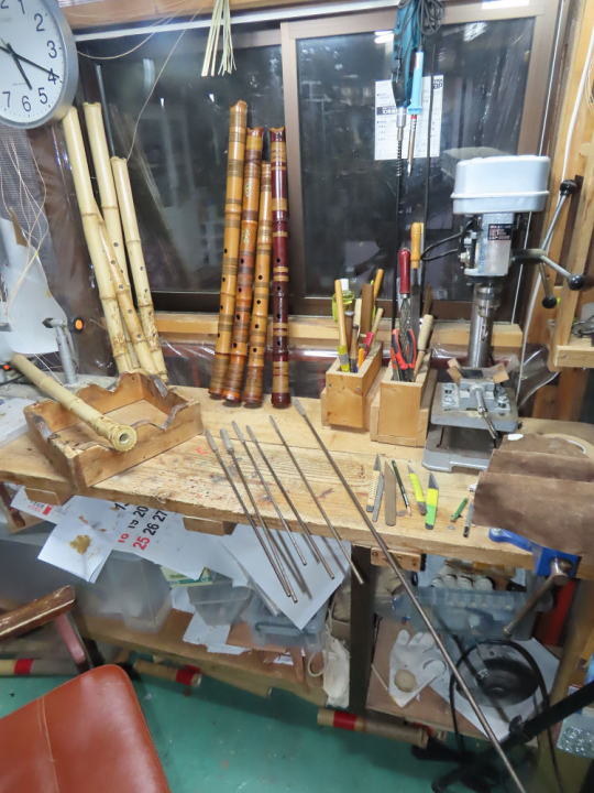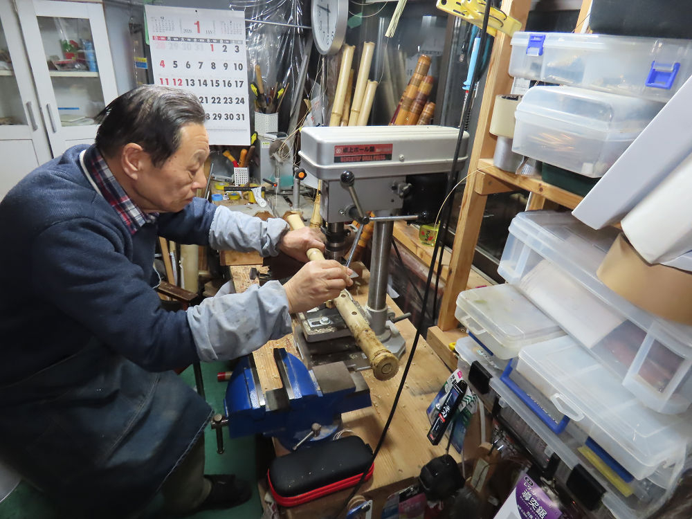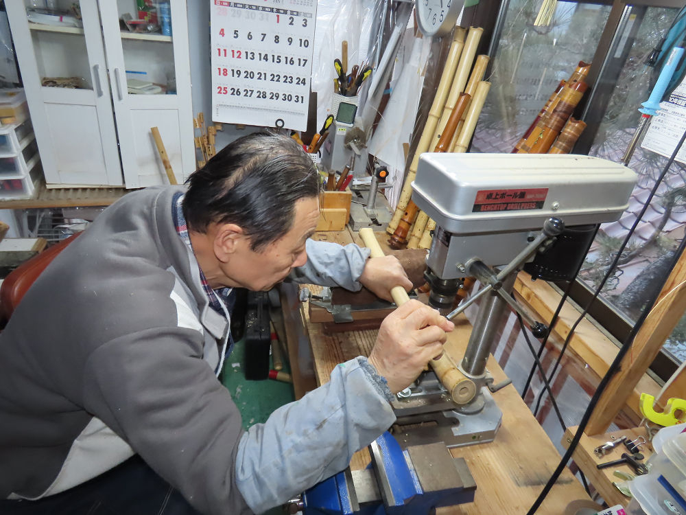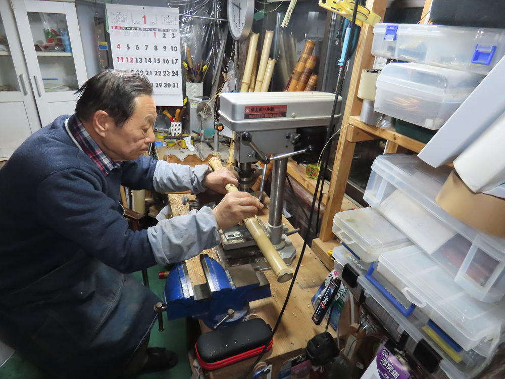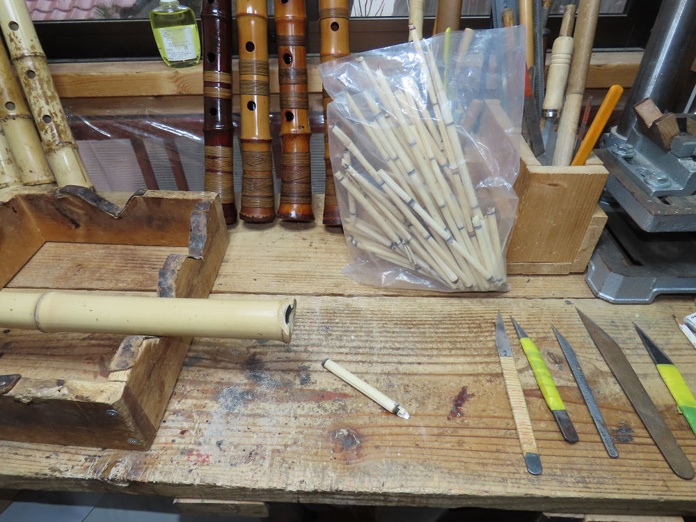 今日は午前中は雨降りでしたが、午後から晴天になり、作業場の室温は20℃になりました。今日は新規に大久保甲童作の地無し1尺9寸管をモデルに、竹材を用意して、ため直しの後、節抜き作業をして、手穴開けまでが完了しました。琴古流尺八の製管士として、水野呂童門下として大久保甲童氏は有名でしたが、普化尺八の製作では、昭和15年の普化尺八会の機関紙普化では、大久保交堂氏製管(二尺より二尺八寸に至る各種)右御希望の方は本部へ御相談下さい。と記載されています。私の手元にある大久保甲童作は、地無し1尺9寸管で竹質も良く、重い地無し尺八です。