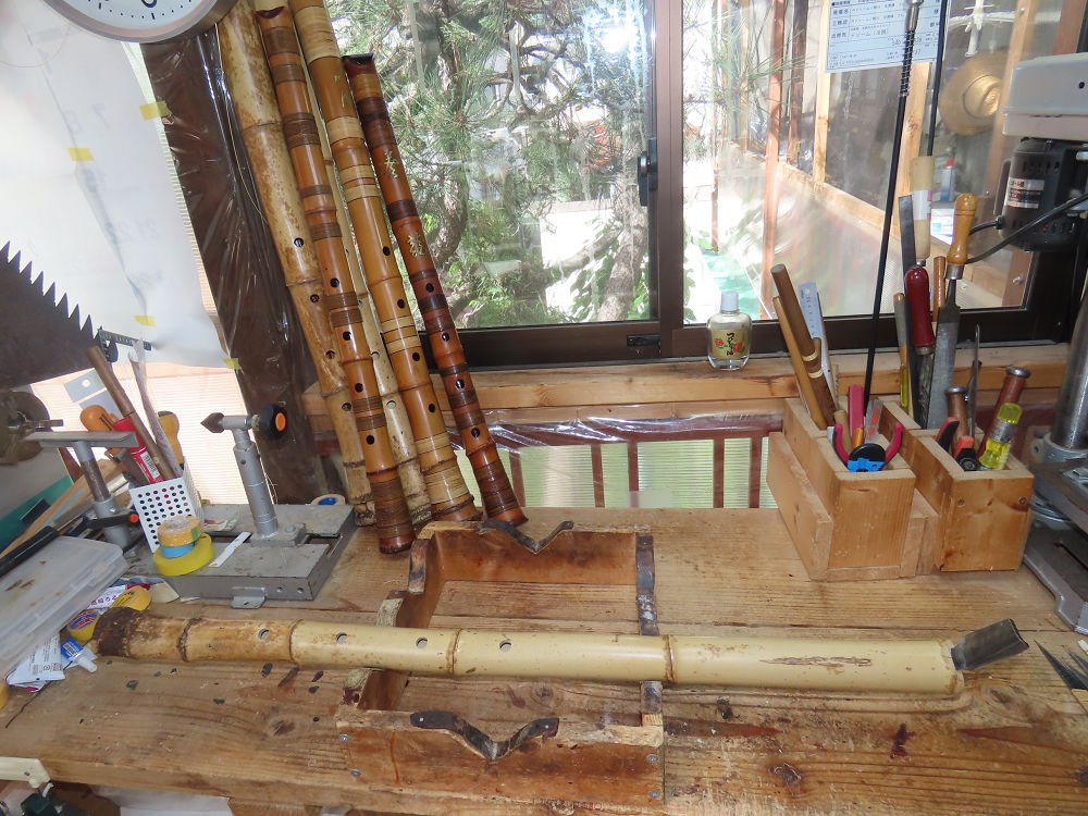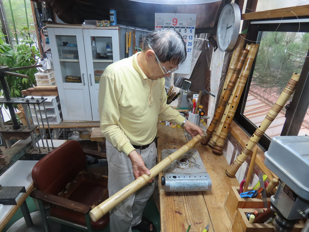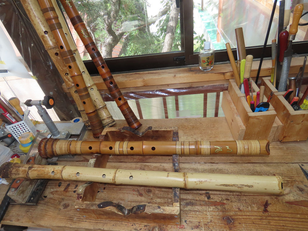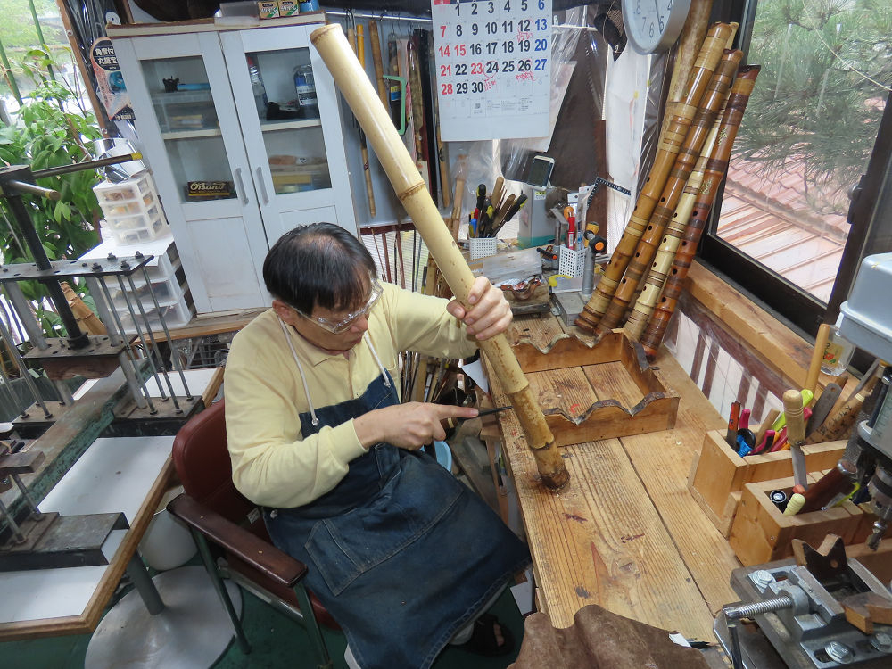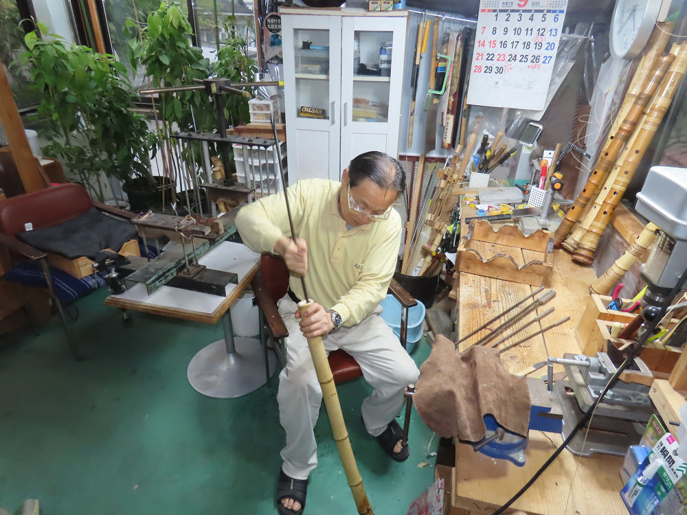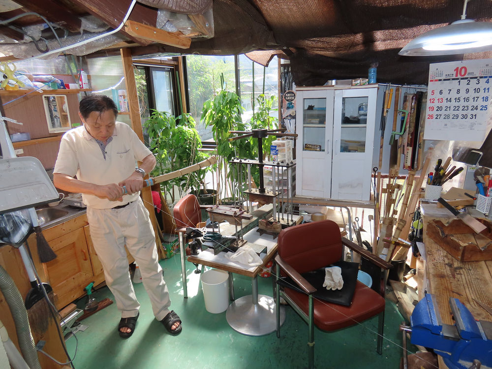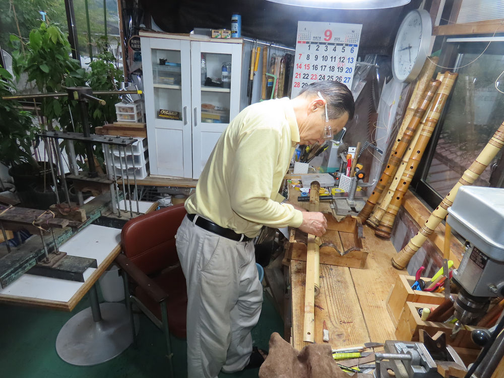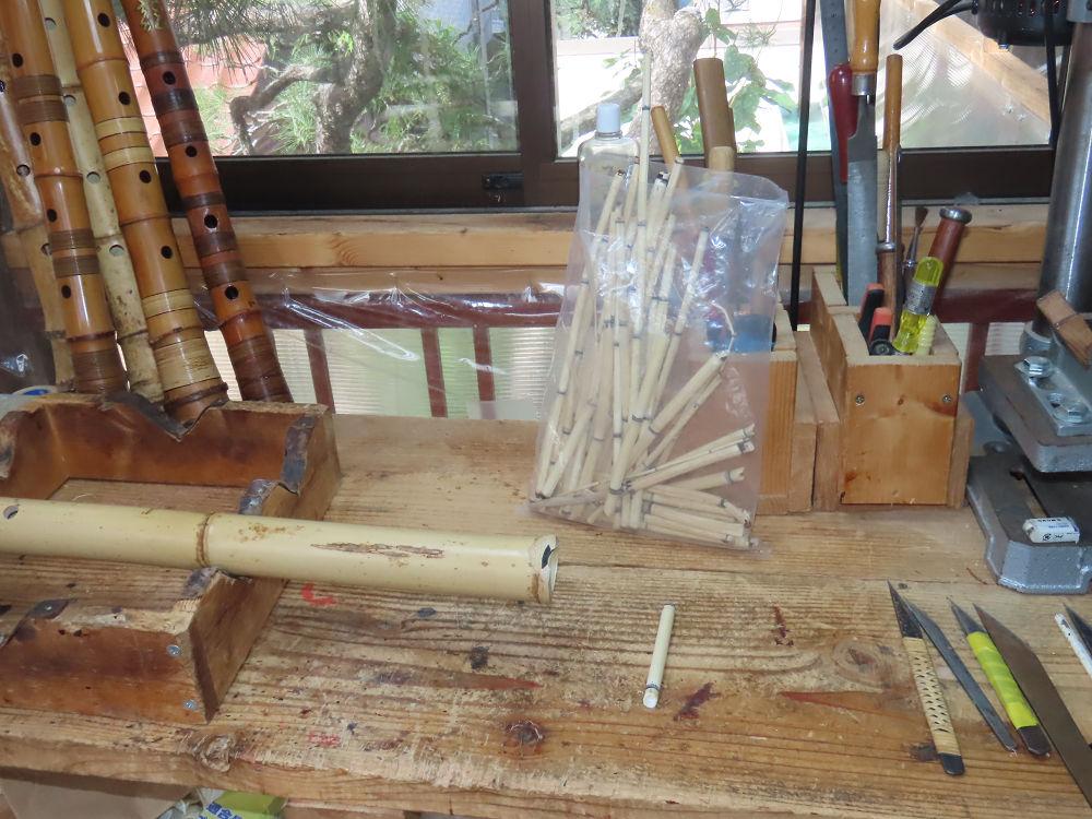 今朝は雨が上がり、高梁の街の周りの山々には、雲海が出ていました。作業を始めたときは長袖でしたが、10時を過ぎて作業場は30℃になり、半そでに着替えました。2尺1寸管の歌口仕上げの後、管尻内部に鼓加工をして、600グラムの2尺1寸管の下作りは完了しました。あまりに重くて、肉厚なので、内径は広くありません。若い頃、岡本竹外先生宅で稽古の時に、先生から太い竹の方が、細い竹より吹くのに楽であると、何度も聞きましたが、その当時は、まだ琴古流尺八で三曲合奏もしていて、吹く奏法なので、意味が理解出来ませんでした。後に琴古流をやめて、地無し尺八を丹田で鳴らす奏法になってから、初めて太い尺八の方が同じ息でも大きな音が出て、楽なことがわかりました。今回の重くて、中の狭い尺八は、歌口を吹く奏法には、良いですが、息受けが良くないので、同じ600グラムでも、太い2尺2寸管の方が、楽に鳴らせます。琴古流や都山流尺八を長年経験され、私に入門されたときに、みなさん細めの2尺3寸管を選ばれます。しかし5年ぐらい過ぎると、やっと太い尺八の方が大きな音が出て、楽であることを理解されます。その時に、太い尺八に交換をしてあげます。そうなると、細い尺八には戻れなくなります。
