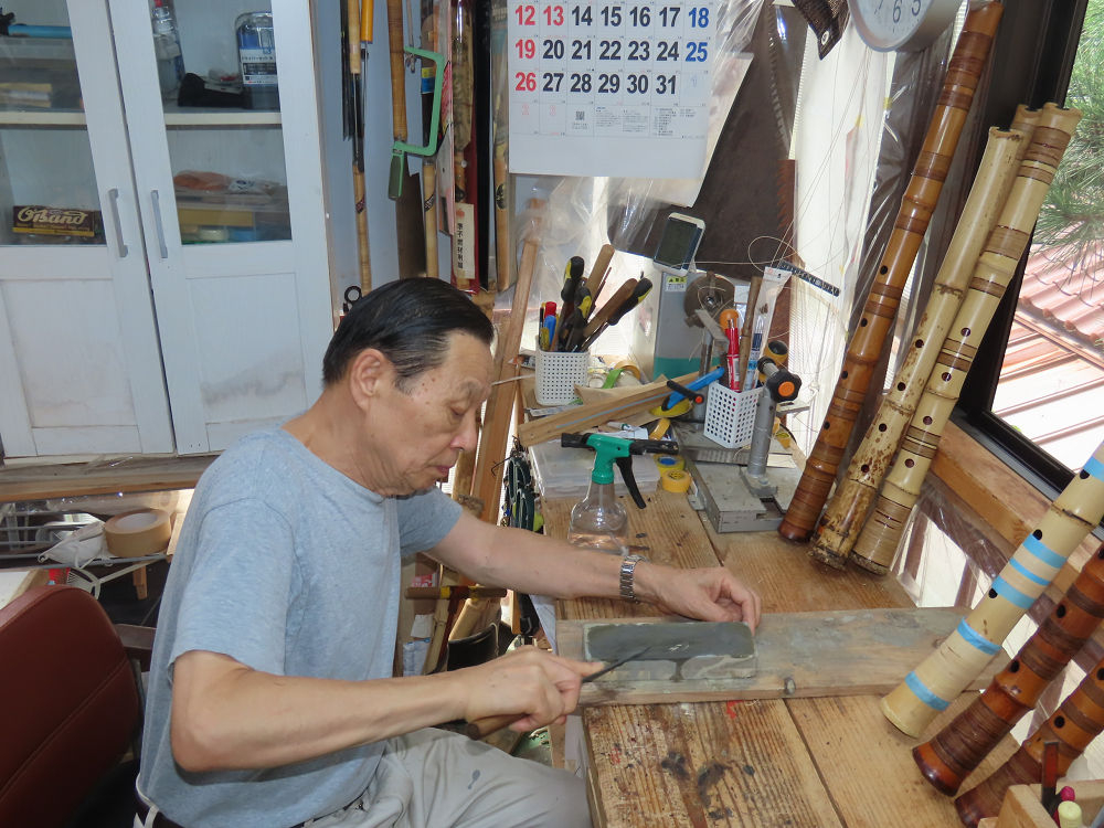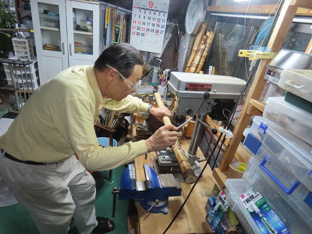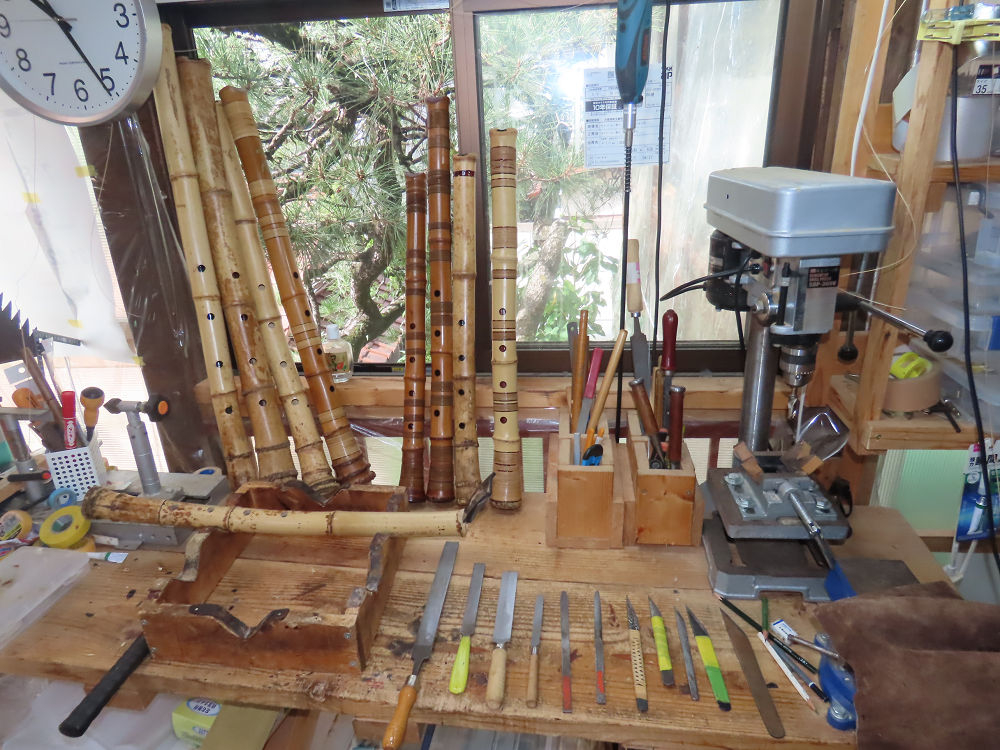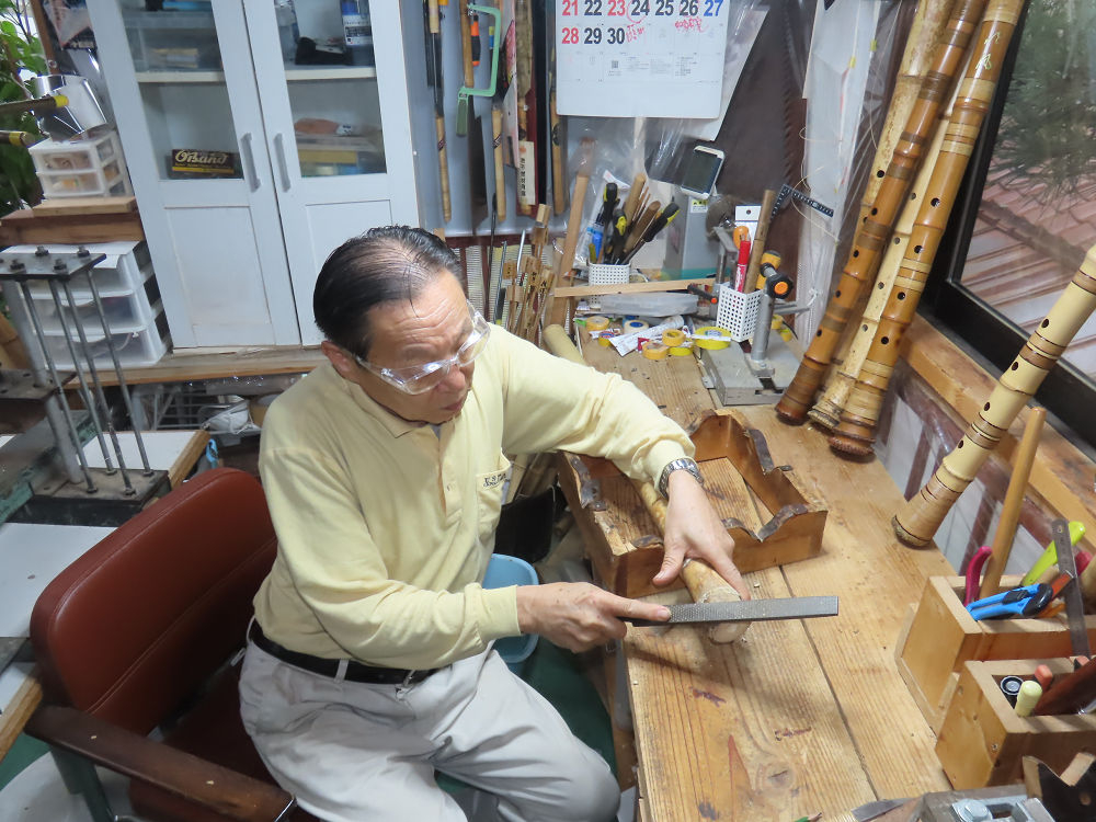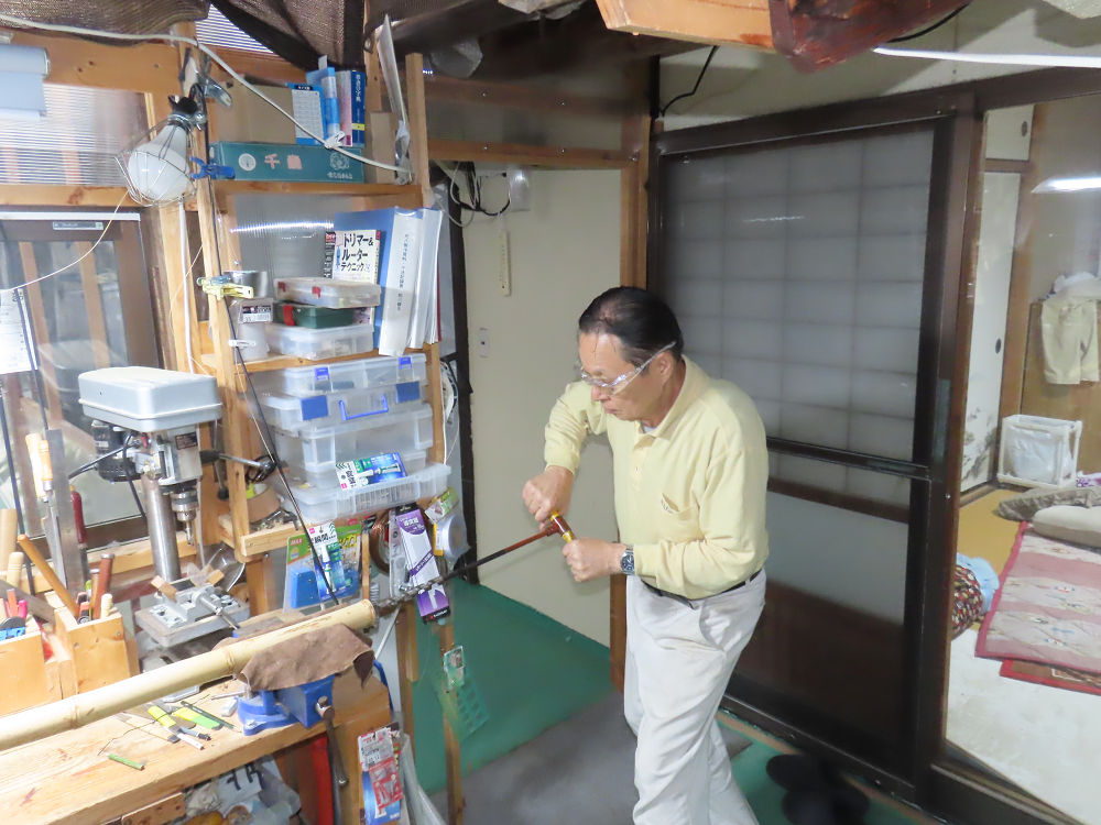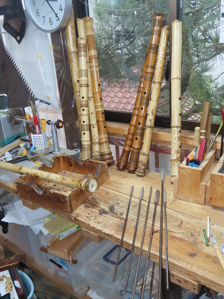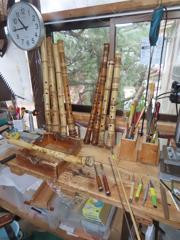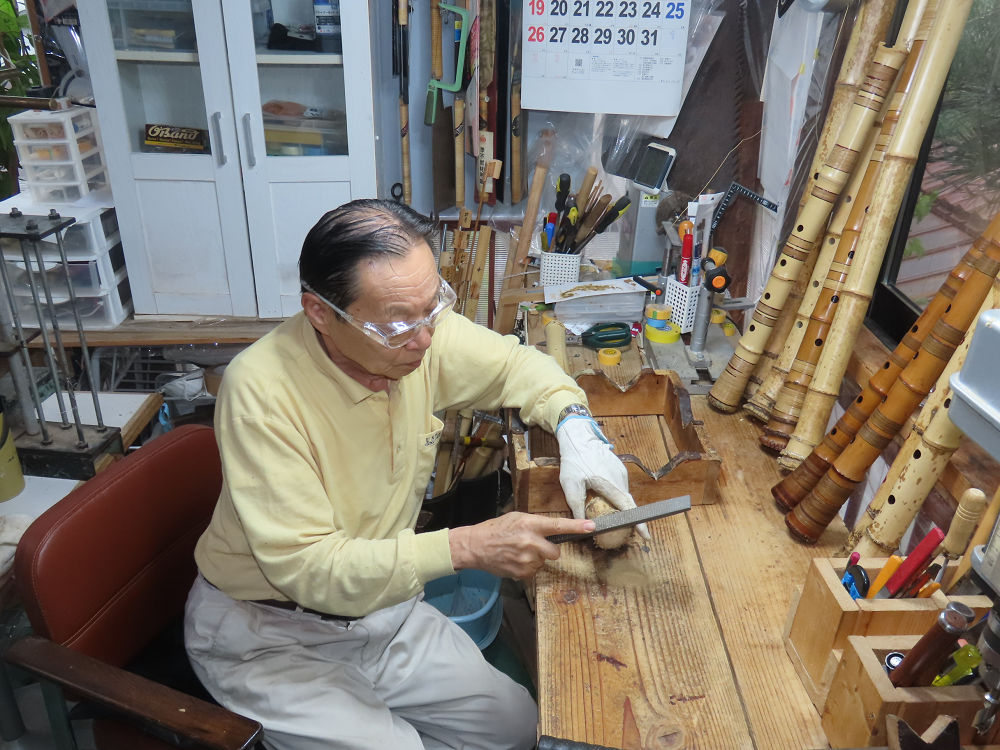 今朝は雨が上がり、高梁の街の周りの山々には、雲海が出ていました。作業を始めたときは長袖でしたが、10時を過ぎて作業場は30℃になり、半そでに着替えました。2尺1寸管の歌口仕上げの後、管尻内部に鼓加工をして、600グラムの2尺1寸管の下作りは完了しました。あまりに重くて、肉厚なので、内径は広くありません。若い頃、岡本竹外先生宅で稽古の時に、先生から太い竹の方が、細い竹より吹くのに楽であると、何度も聞きましたが、その当時は、まだ琴古流尺八で三曲合奏もしていて、吹く奏法なので、意味が理解出来ませんでした。後に琴古流をやめて、地無し尺八を丹田で鳴らす奏法になってから、初めて太い尺八の方が同じ息でも大きな音が出て、楽なことがわかりました。今回の重くて、中の狭い尺八は、歌口を吹く奏法には、良いですが、息受けが良くないので、同じ600グラムでも、太い2尺2寸管の方が、楽に鳴らせます。琴古流や都山流尺八を長年経験され、私に入門されたときに、みなさん細めの2尺3寸管を選ばれます。しかし5年ぐらい過ぎると、やっと太い尺八の方が大きな音が出て、楽であることを理解されます。その時に、太い尺八に交換をしてあげます。そうなると、細い尺八には戻れなくなります。