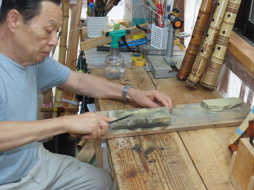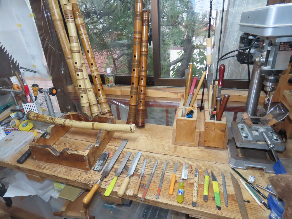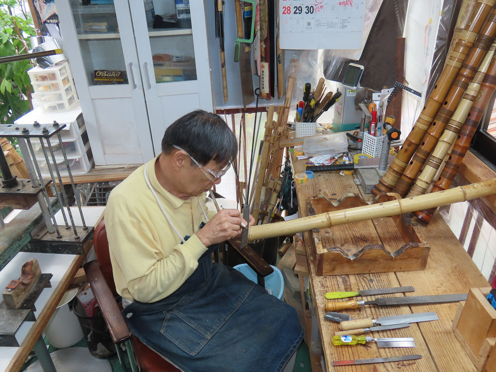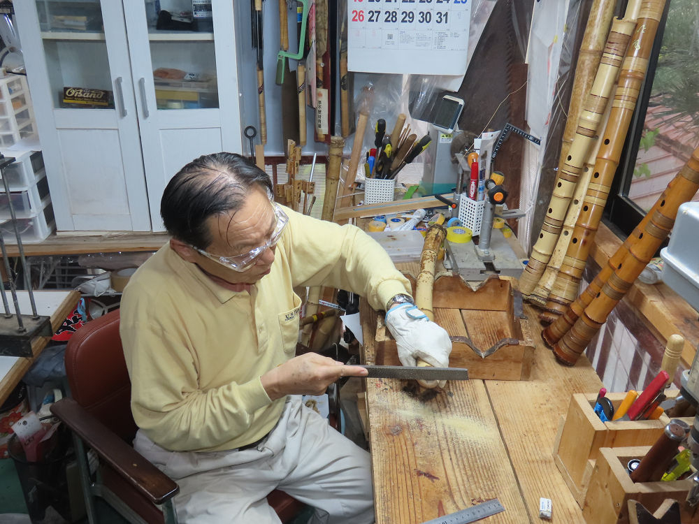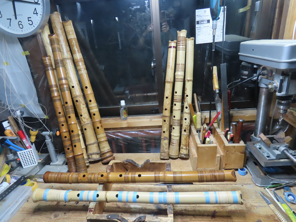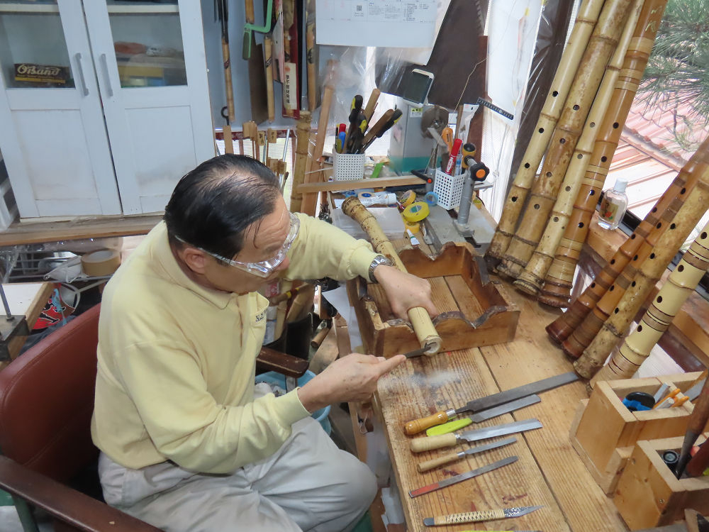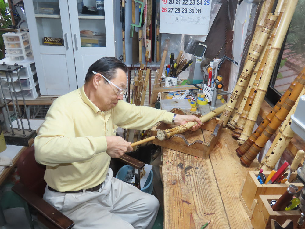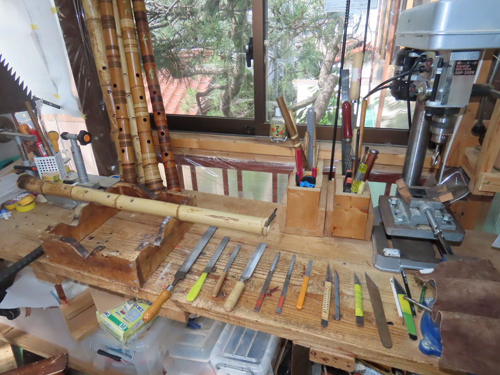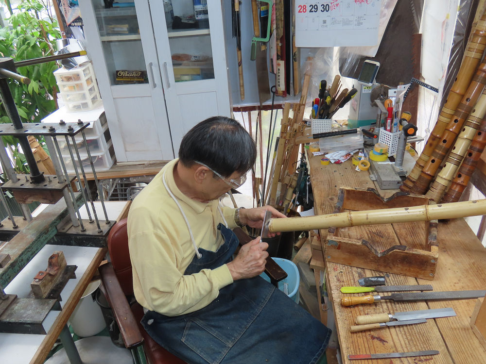 今朝は雨が上がり、高梁の街の周りの山々には、雲海が出ていました。作業を始めたときは長袖でしたが、10時を過ぎて作業場は30℃になり、半そでに着替えました。2尺1寸管の歌口仕上げの後、管尻内部に鼓加工をして、600グラムの2尺1寸管の下作りは完了しました。あまりに重くて、肉厚なので、内径は広くありません。若い頃、岡本竹外先生宅で稽古の時に、先生から太い竹の方が、細い竹より吹くのに楽であると、何度も聞きましたが、その当時は、まだ琴古流尺八で三曲合奏もしていて、吹く奏法なので、意味が理解出来ませんでした。後に琴古流をやめて、地無し尺八を丹田で鳴らす奏法になってから、初めて太い尺八の方が同じ息でも大きな音が出て、楽なことがわかりました。今回の重くて、中の狭い尺八は、歌口を吹く奏法には、良いですが、息受けが良くないので、同じ600グラムでも、太い2尺2寸管の方が、楽に鳴らせます。琴古流や都山流尺八を長年経験され、私に入門されたときに、みなさん細めの2尺3寸管を選ばれます。しかし5年ぐらい過ぎると、やっと太い尺八の方が大きな音が出て、楽であることを理解されます。その時に、太い尺八に交換をしてあげます。そうなると、細い尺八には戻れなくなります。