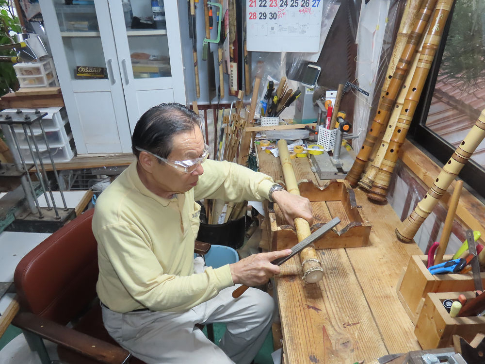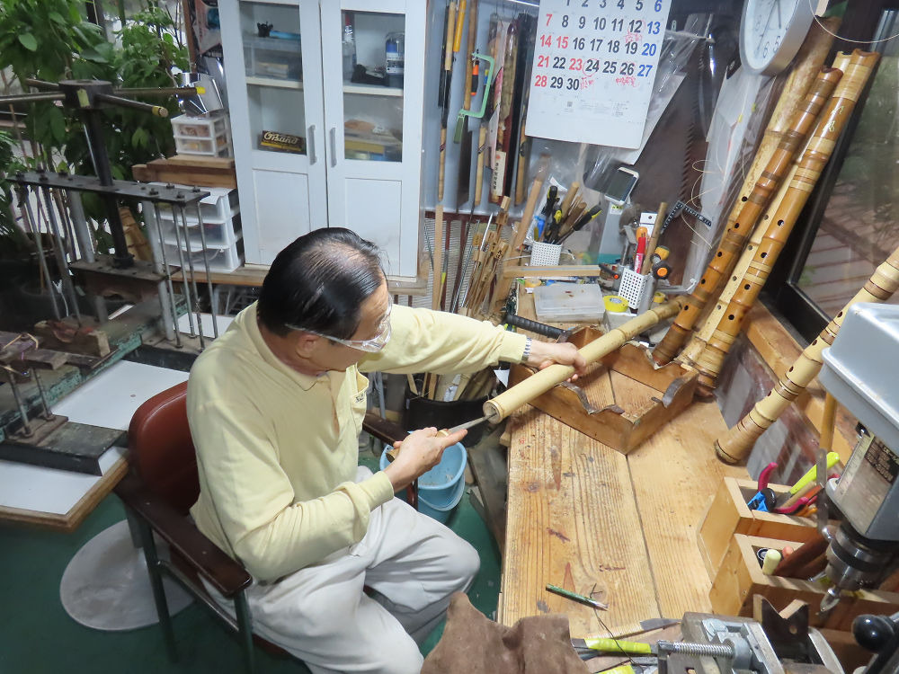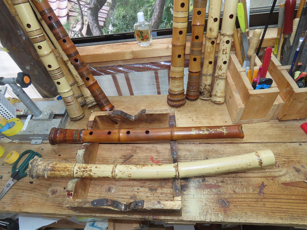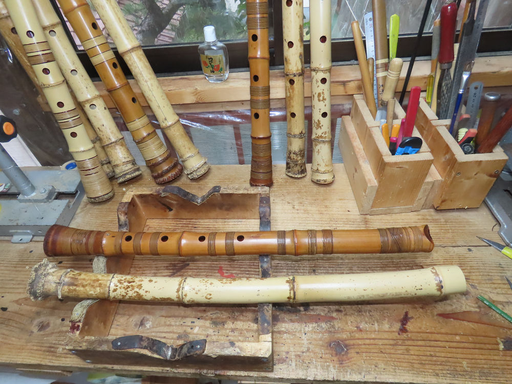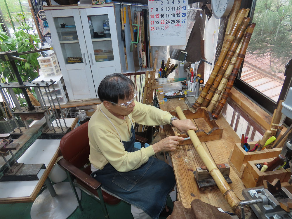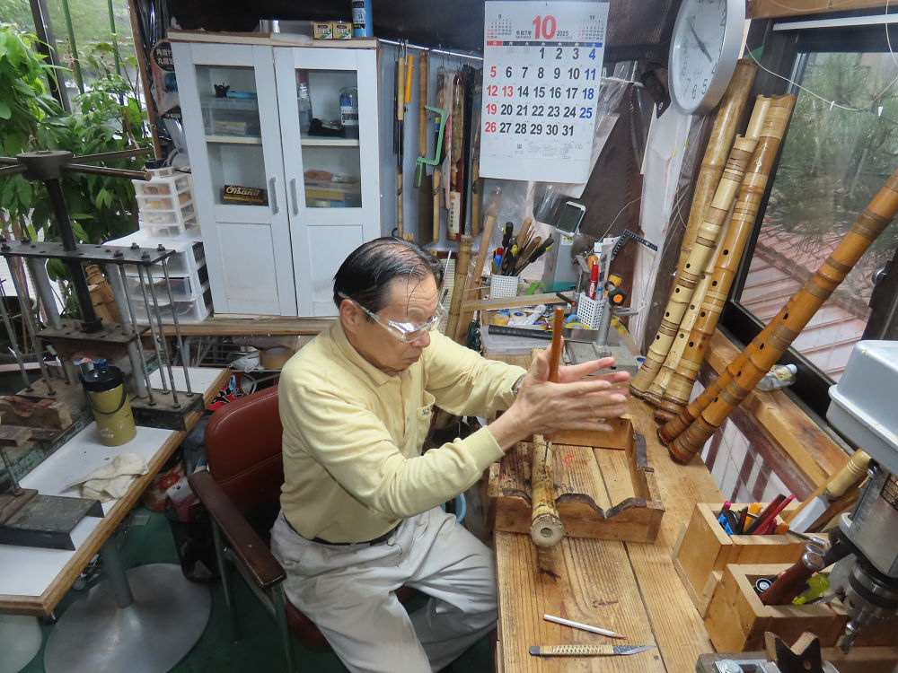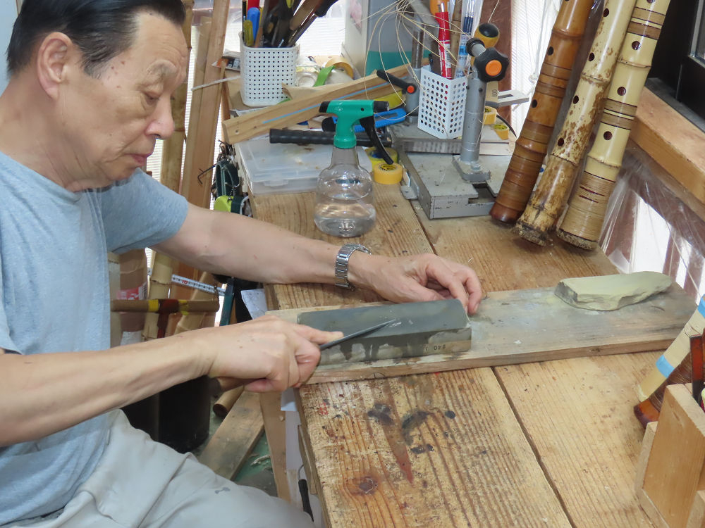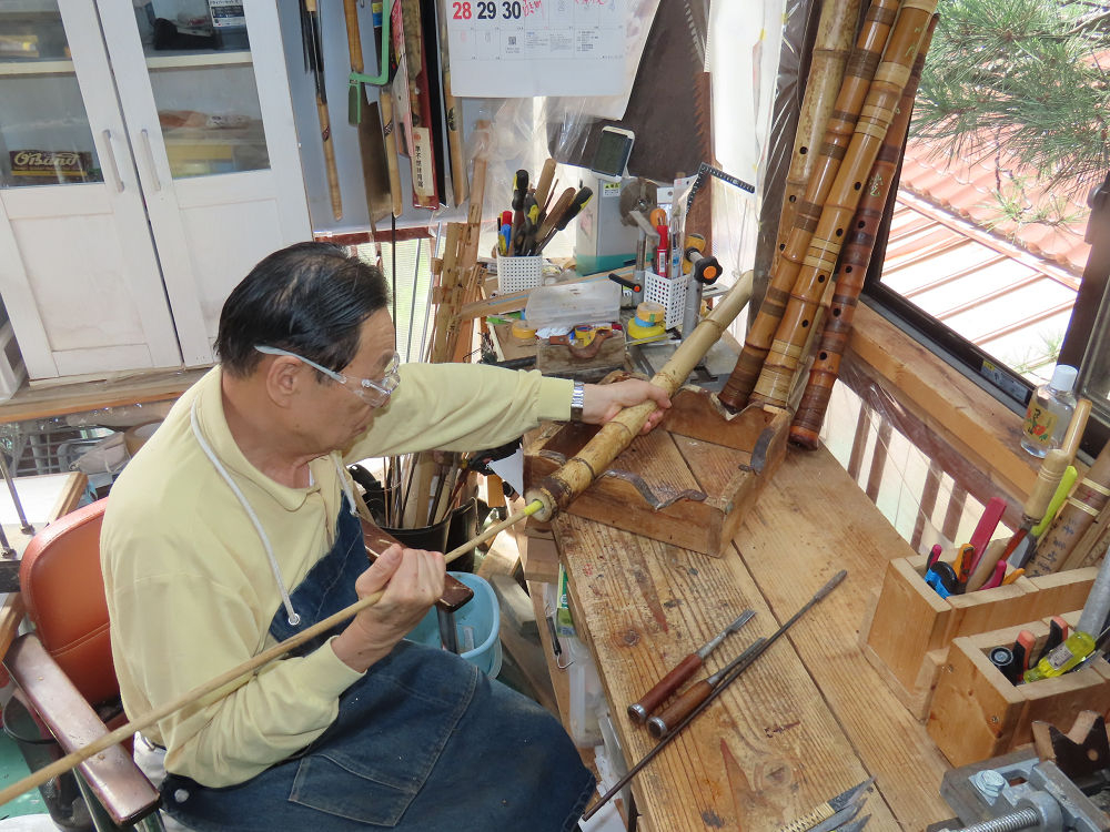 今朝は雨が上がり、高梁の街の周りの山々には、雲海が出ていました。作業を始めたときは長袖でしたが、10時を過ぎて作業場は30℃になり、半そでに着替えました。2尺1寸管の歌口仕上げの後、管尻内部に鼓加工をして、600グラムの2尺1寸管の下作りは完了しました。あまりに重くて、肉厚なので、内径は広くありません。若い頃、岡本竹外先生宅で稽古の時に、先生から太い竹の方が、細い竹より吹くのに楽であると、何度も聞きましたが、その当時は、まだ琴古流尺八で三曲合奏もしていて、吹く奏法なので、意味が理解出来ませんでした。後に琴古流をやめて、地無し尺八を丹田で鳴らす奏法になってから、初めて太い尺八の方が同じ息でも大きな音が出て、楽なことがわかりました。今回の重くて、中の狭い尺八は、歌口を吹く奏法には、良いですが、息受けが良くないので、同じ600グラムでも、太い2尺2寸管の方が、楽に鳴らせます。琴古流や都山流尺八を長年経験され、私に入門されたときに、みなさん細めの2尺3寸管を選ばれます。しかし5年ぐらい過ぎると、やっと太い尺八の方が大きな音が出て、楽であることを理解されます。その時に、太い尺八に交換をしてあげます。そうなると、細い尺八には戻れなくなります。