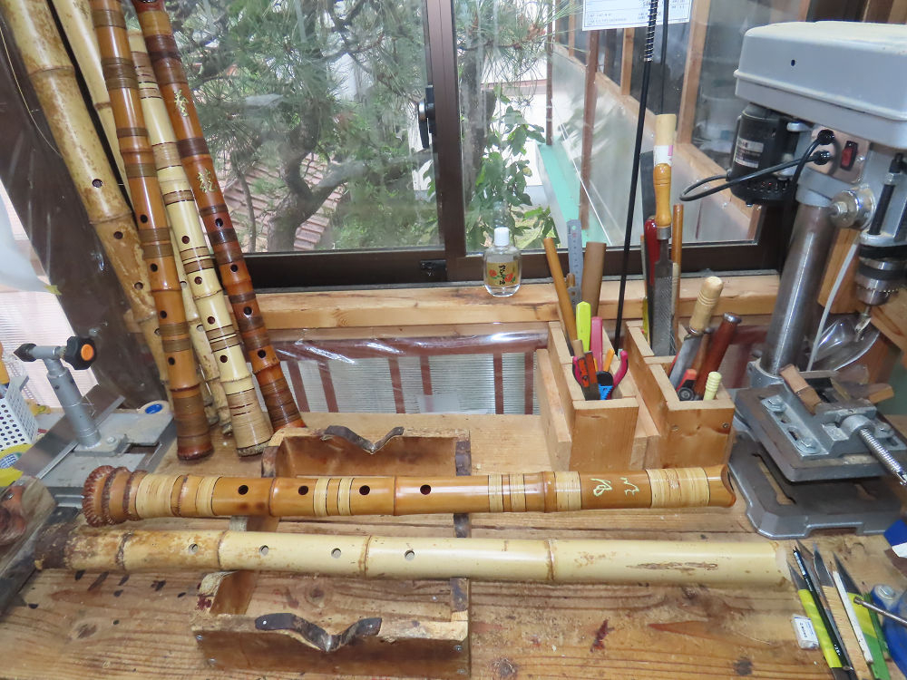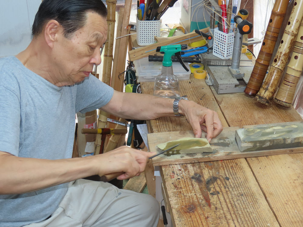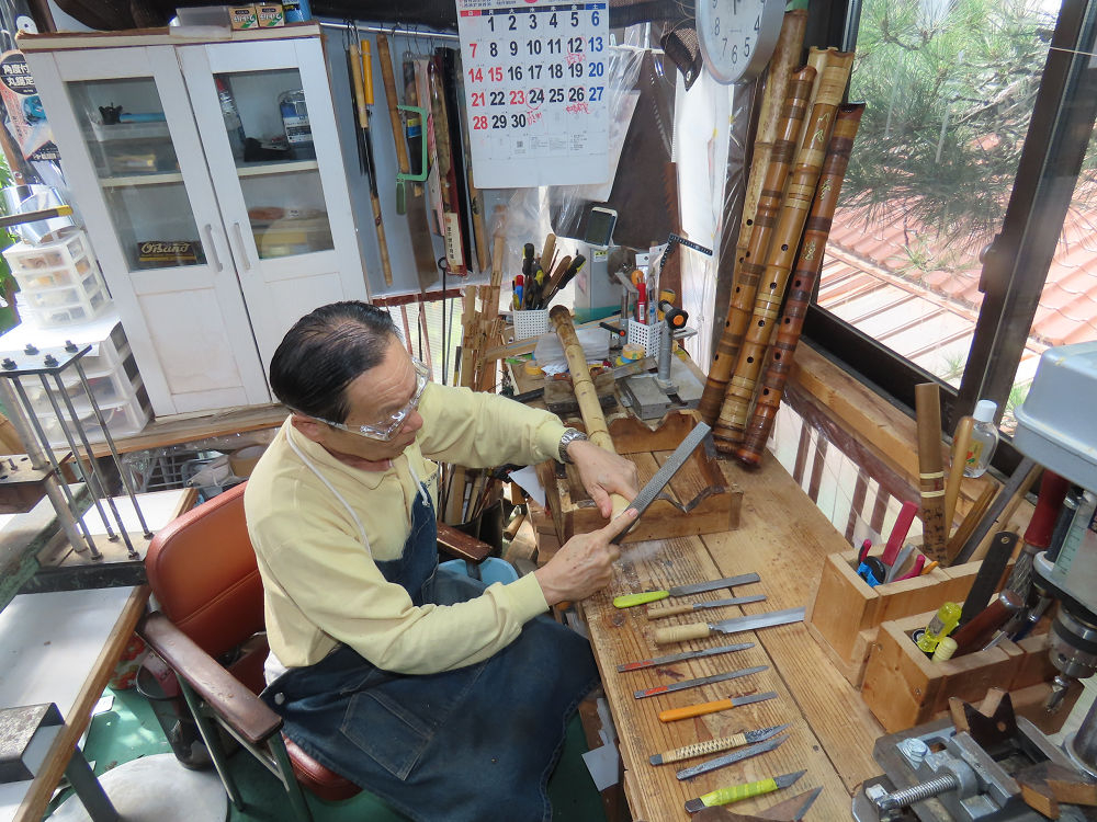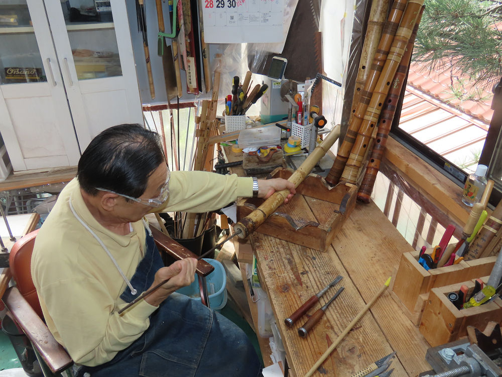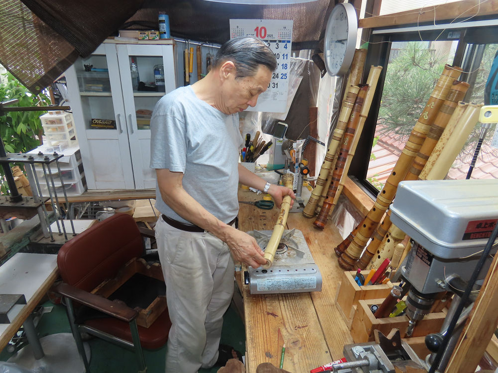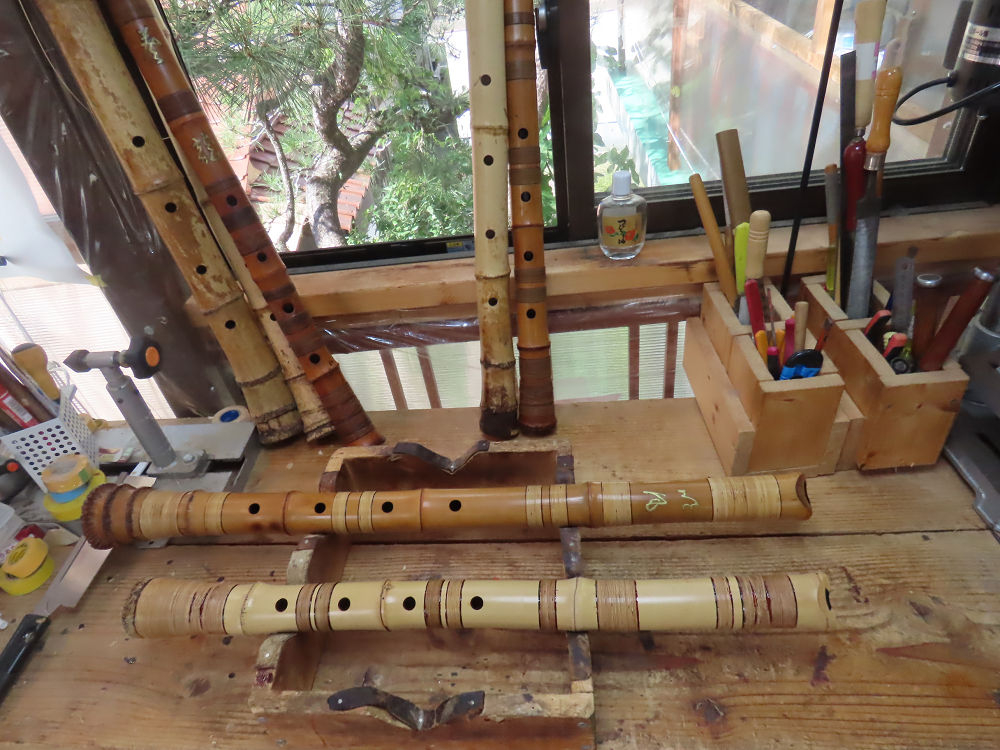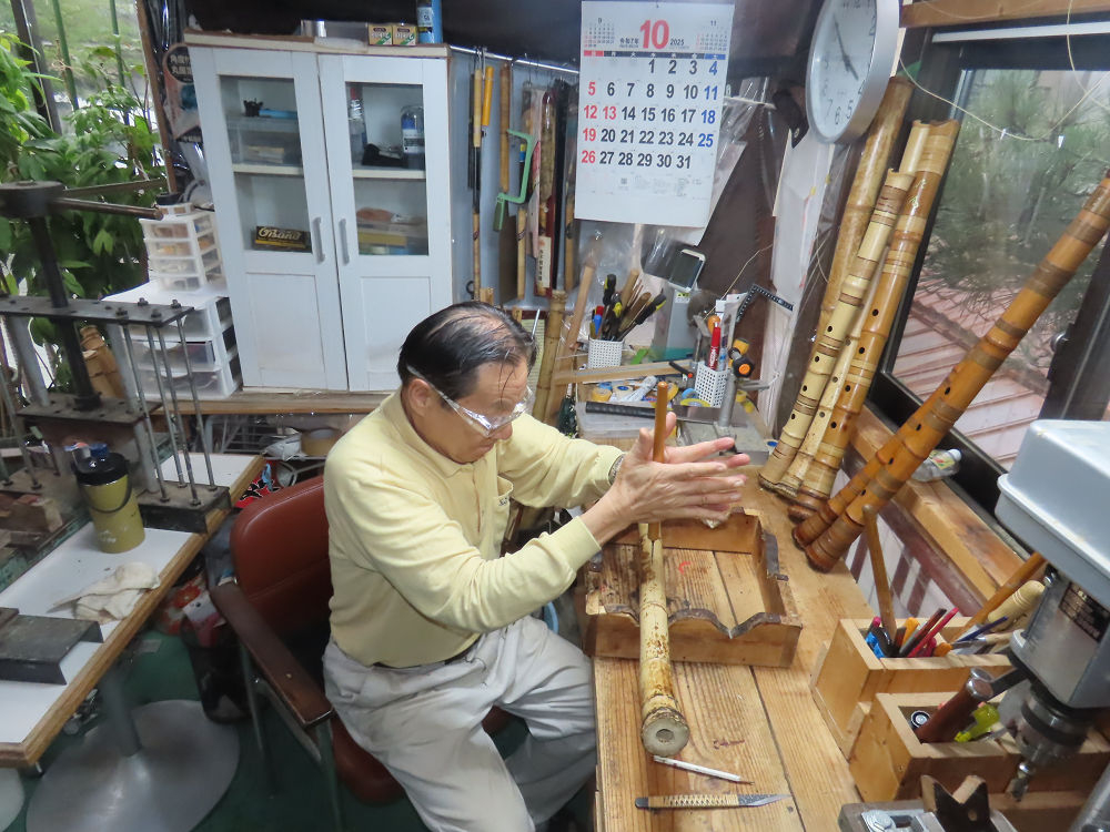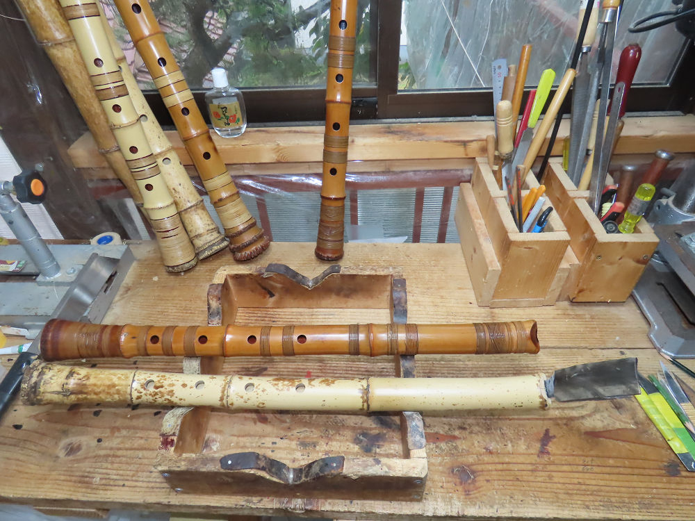 今朝は雨が上がり、高梁の街の周りの山々には、雲海が出ていました。作業を始めたときは長袖でしたが、10時を過ぎて作業場は30℃になり、半そでに着替えました。2尺1寸管の歌口仕上げの後、管尻内部に鼓加工をして、600グラムの2尺1寸管の下作りは完了しました。あまりに重くて、肉厚なので、内径は広くありません。若い頃、岡本竹外先生宅で稽古の時に、先生から太い竹の方が、細い竹より吹くのに楽であると、何度も聞きましたが、その当時は、まだ琴古流尺八で三曲合奏もしていて、吹く奏法なので、意味が理解出来ませんでした。後に琴古流をやめて、地無し尺八を丹田で鳴らす奏法になってから、初めて太い尺八の方が同じ息でも大きな音が出て、楽なことがわかりました。今回の重くて、中の狭い尺八は、歌口を吹く奏法には、良いですが、息受けが良くないので、同じ600グラムでも、太い2尺2寸管の方が、楽に鳴らせます。琴古流や都山流尺八を長年経験され、私に入門されたときに、みなさん細めの2尺3寸管を選ばれます。しかし5年ぐらい過ぎると、やっと太い尺八の方が大きな音が出て、楽であることを理解されます。その時に、太い尺八に交換をしてあげます。そうなると、細い尺八には戻れなくなります。