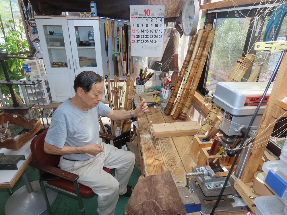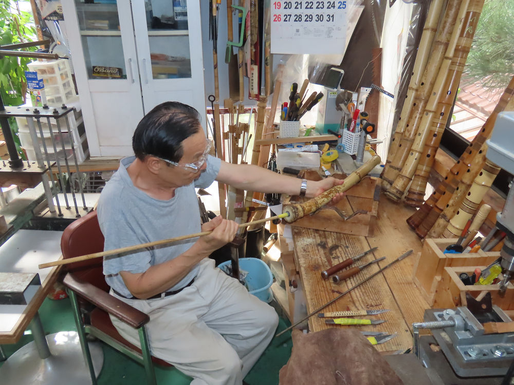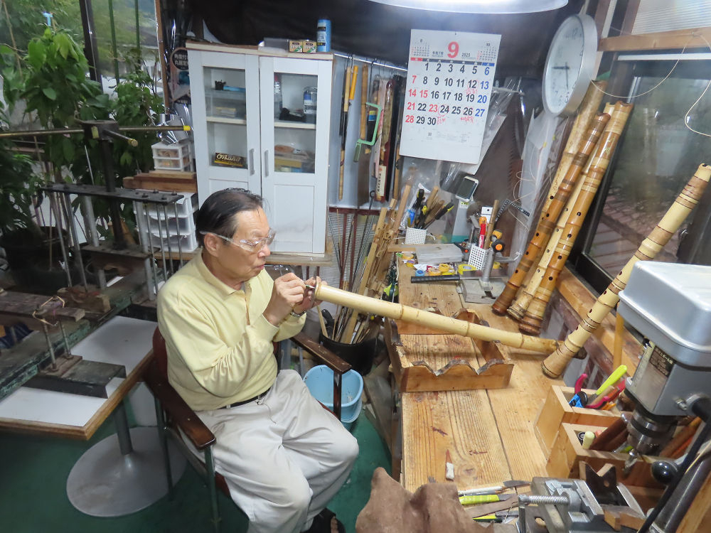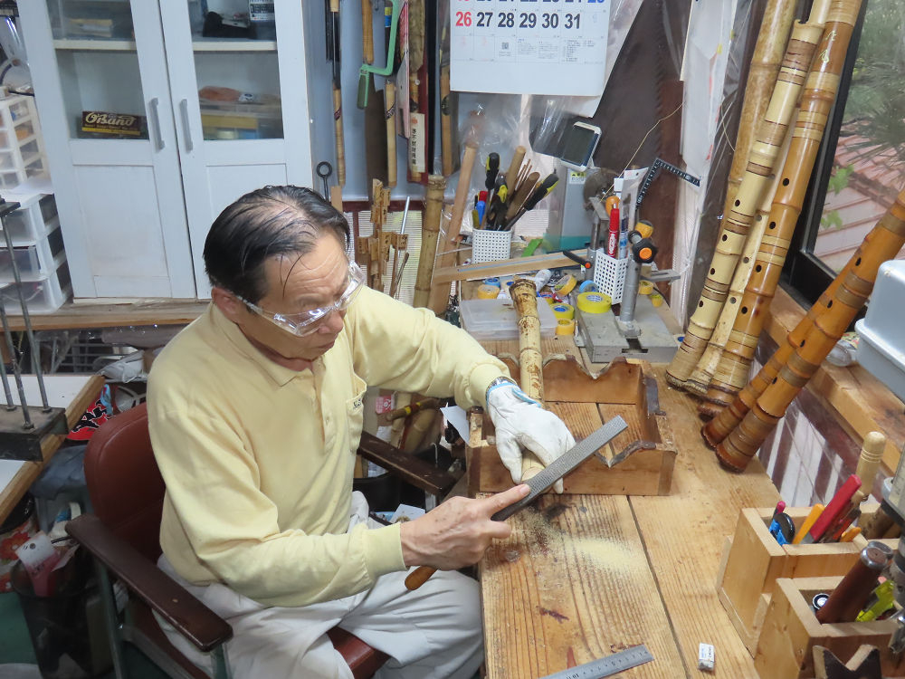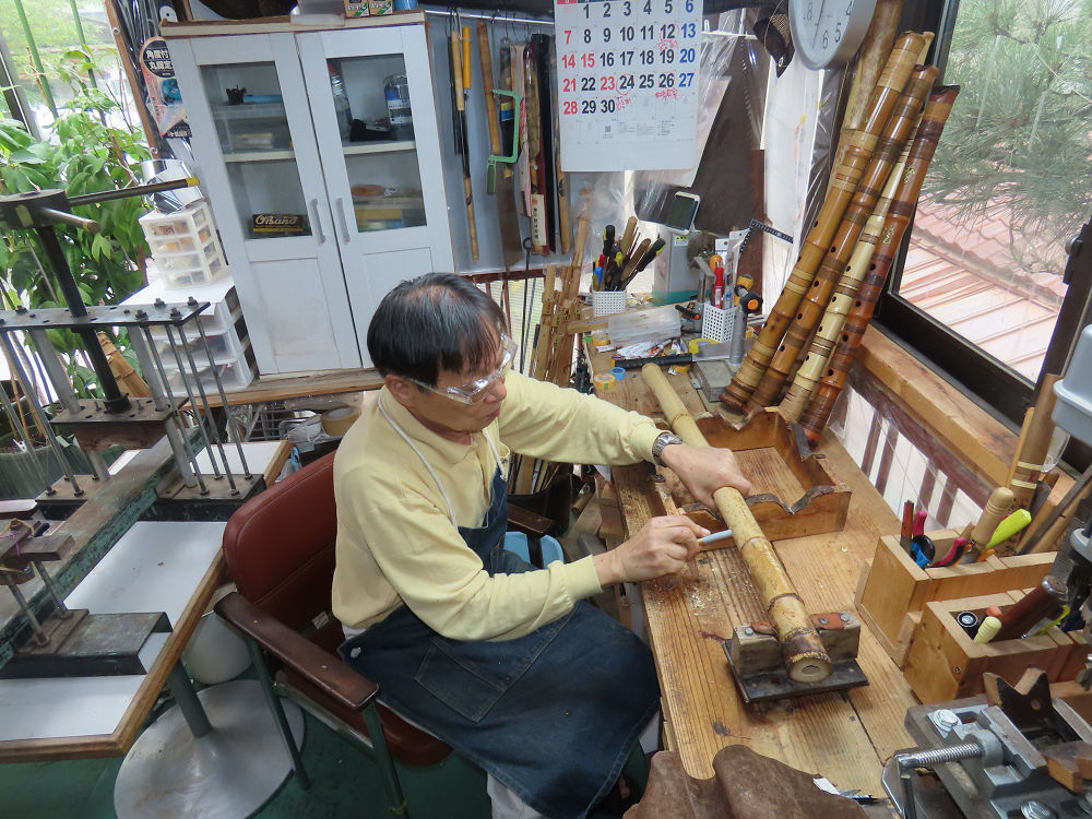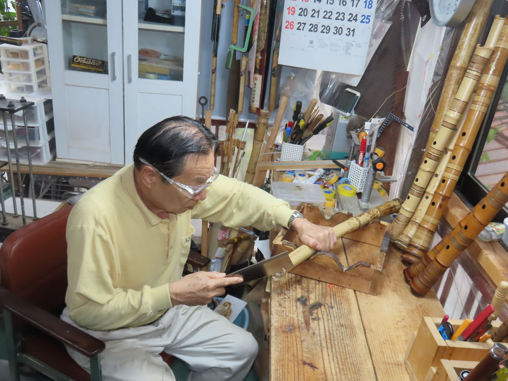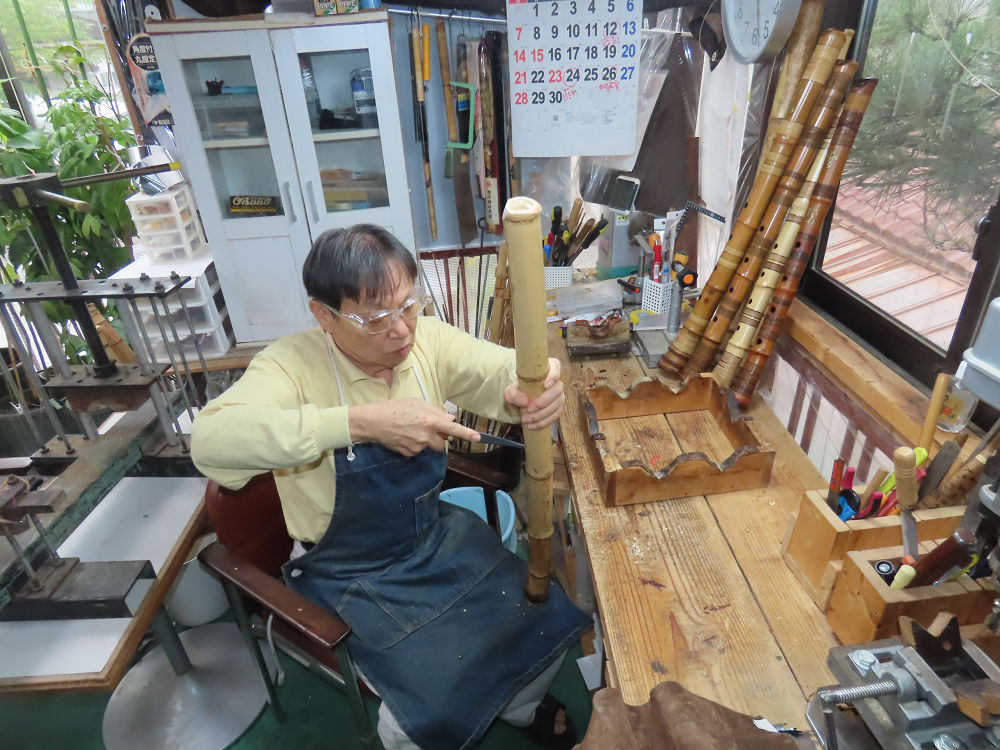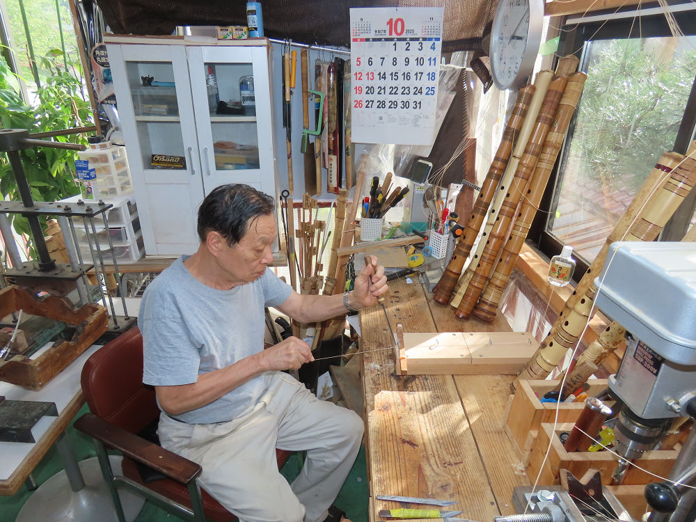 今朝は雨が上がり、高梁の街の周りの山々には、雲海が出ていました。作業を始めたときは長袖でしたが、10時を過ぎて作業場は30℃になり、半そでに着替えました。2尺1寸管の歌口仕上げの後、管尻内部に鼓加工をして、600グラムの2尺1寸管の下作りは完了しました。あまりに重くて、肉厚なので、内径は広くありません。若い頃、岡本竹外先生宅で稽古の時に、先生から太い竹の方が、細い竹より吹くのに楽であると、何度も聞きましたが、その当時は、まだ琴古流尺八で三曲合奏もしていて、吹く奏法なので、意味が理解出来ませんでした。後に琴古流をやめて、地無し尺八を丹田で鳴らす奏法になってから、初めて太い尺八の方が同じ息でも大きな音が出て、楽なことがわかりました。今回の重くて、中の狭い尺八は、歌口を吹く奏法には、良いですが、息受けが良くないので、同じ600グラムでも、太い2尺2寸管の方が、楽に鳴らせます。琴古流や都山流尺八を長年経験され、私に入門されたときに、みなさん細めの2尺3寸管を選ばれます。しかし5年ぐらい過ぎると、やっと太い尺八の方が大きな音が出て、楽であることを理解されます。その時に、太い尺八に交換をしてあげます。そうなると、細い尺八には戻れなくなります。