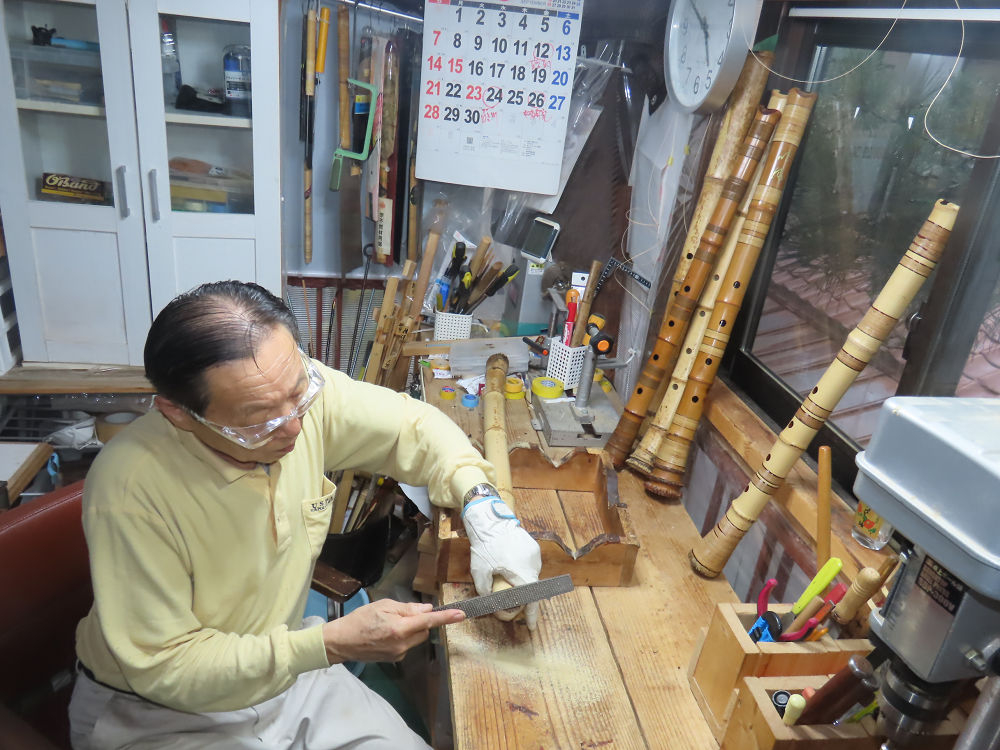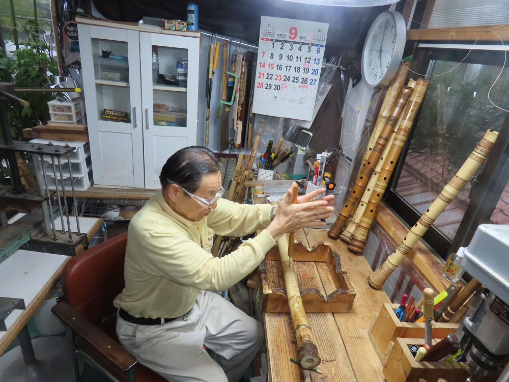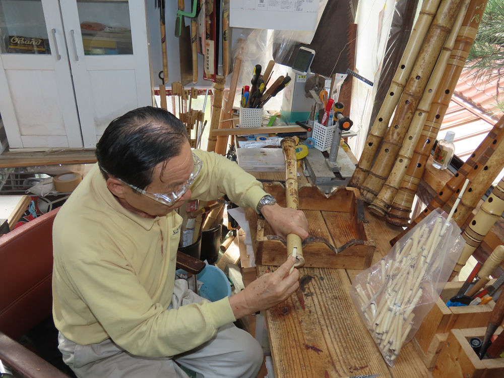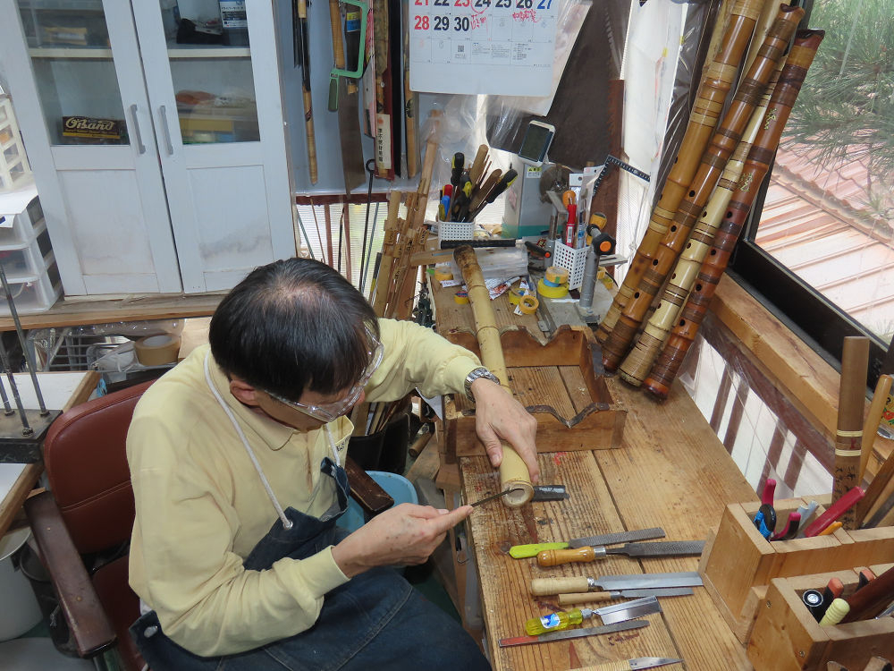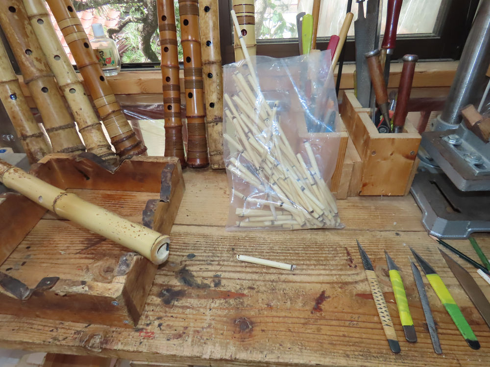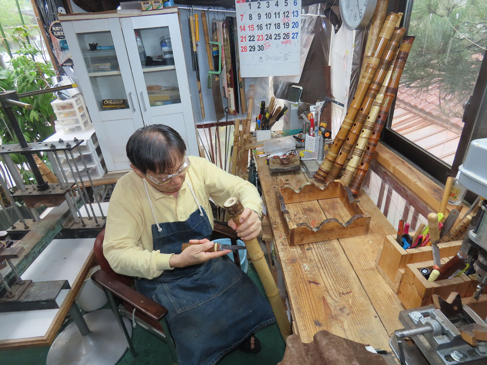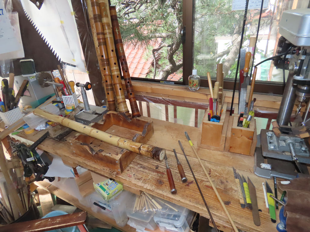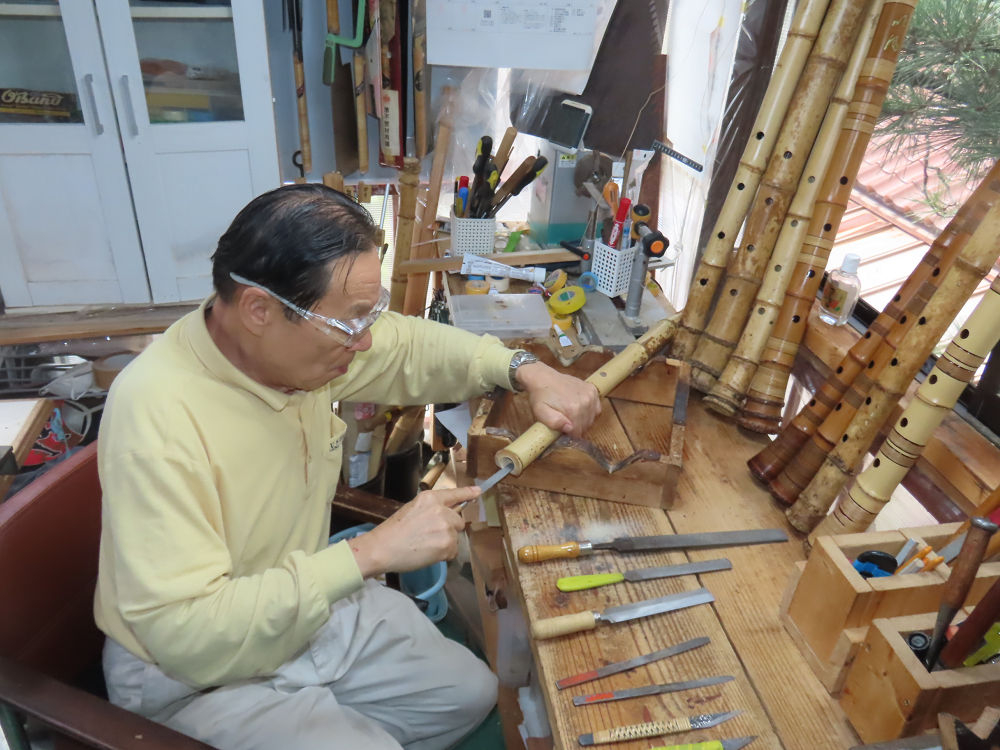 今朝は雨が上がり、高梁の街の周りの山々には、雲海が出ていました。作業を始めたときは長袖でしたが、10時を過ぎて作業場は30℃になり、半そでに着替えました。2尺1寸管の歌口仕上げの後、管尻内部に鼓加工をして、600グラムの2尺1寸管の下作りは完了しました。あまりに重くて、肉厚なので、内径は広くありません。若い頃、岡本竹外先生宅で稽古の時に、先生から太い竹の方が、細い竹より吹くのに楽であると、何度も聞きましたが、その当時は、まだ琴古流尺八で三曲合奏もしていて、吹く奏法なので、意味が理解出来ませんでした。後に琴古流をやめて、地無し尺八を丹田で鳴らす奏法になってから、初めて太い尺八の方が同じ息でも大きな音が出て、楽なことがわかりました。今回の重くて、中の狭い尺八は、歌口を吹く奏法には、良いですが、息受けが良くないので、同じ600グラムでも、太い2尺2寸管の方が、楽に鳴らせます。琴古流や都山流尺八を長年経験され、私に入門されたときに、みなさん細めの2尺3寸管を選ばれます。しかし5年ぐらい過ぎると、やっと太い尺八の方が大きな音が出て、楽であることを理解されます。その時に、太い尺八に交換をしてあげます。そうなると、細い尺八には戻れなくなります。
