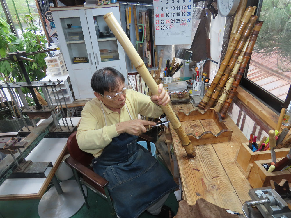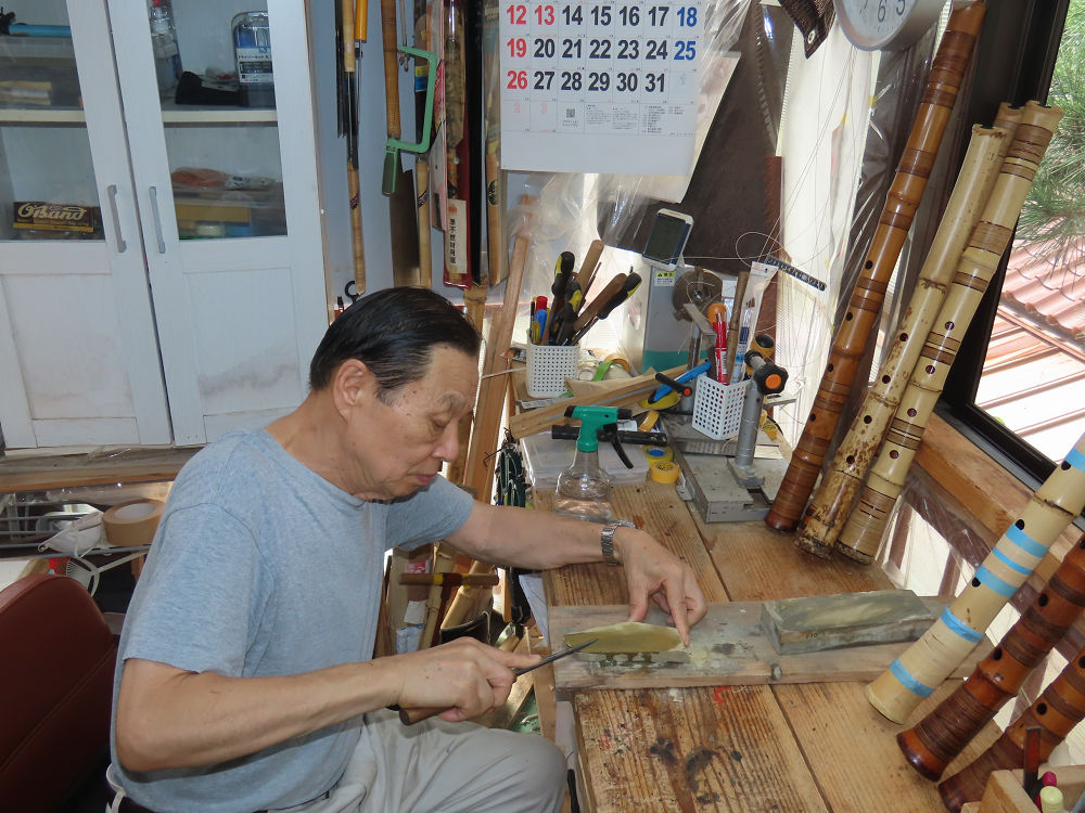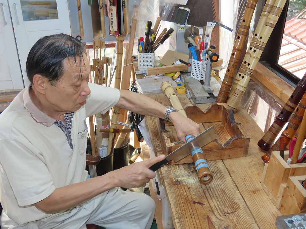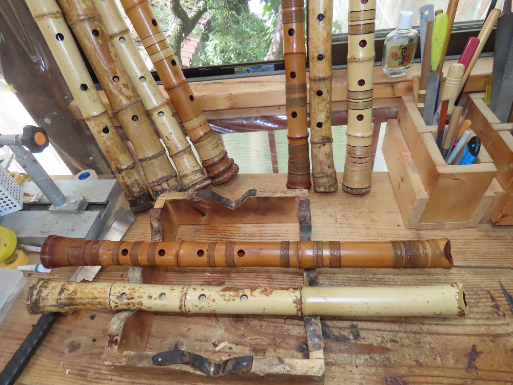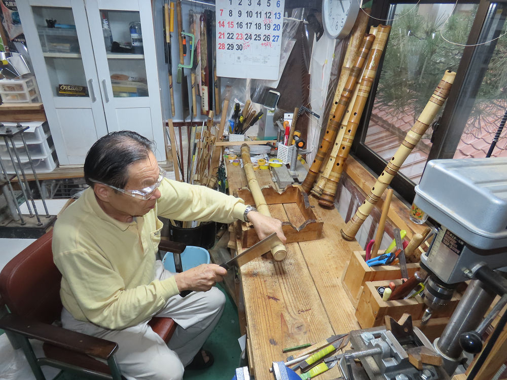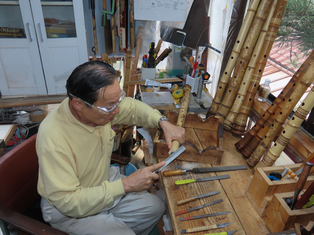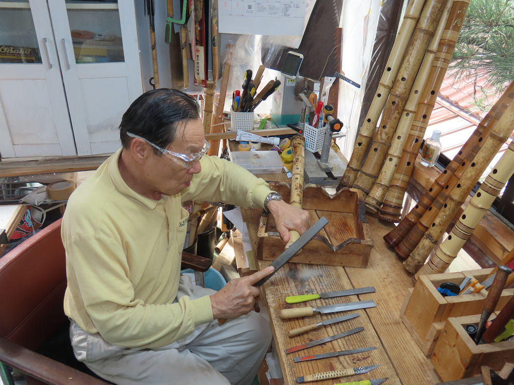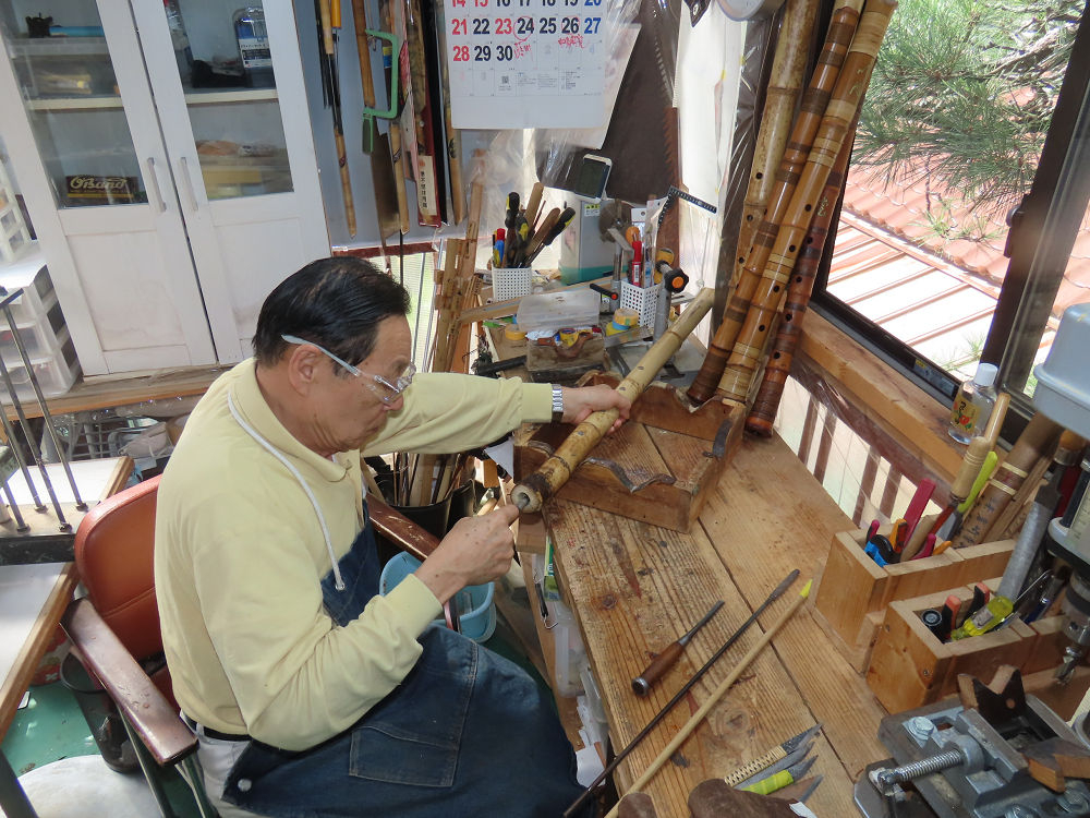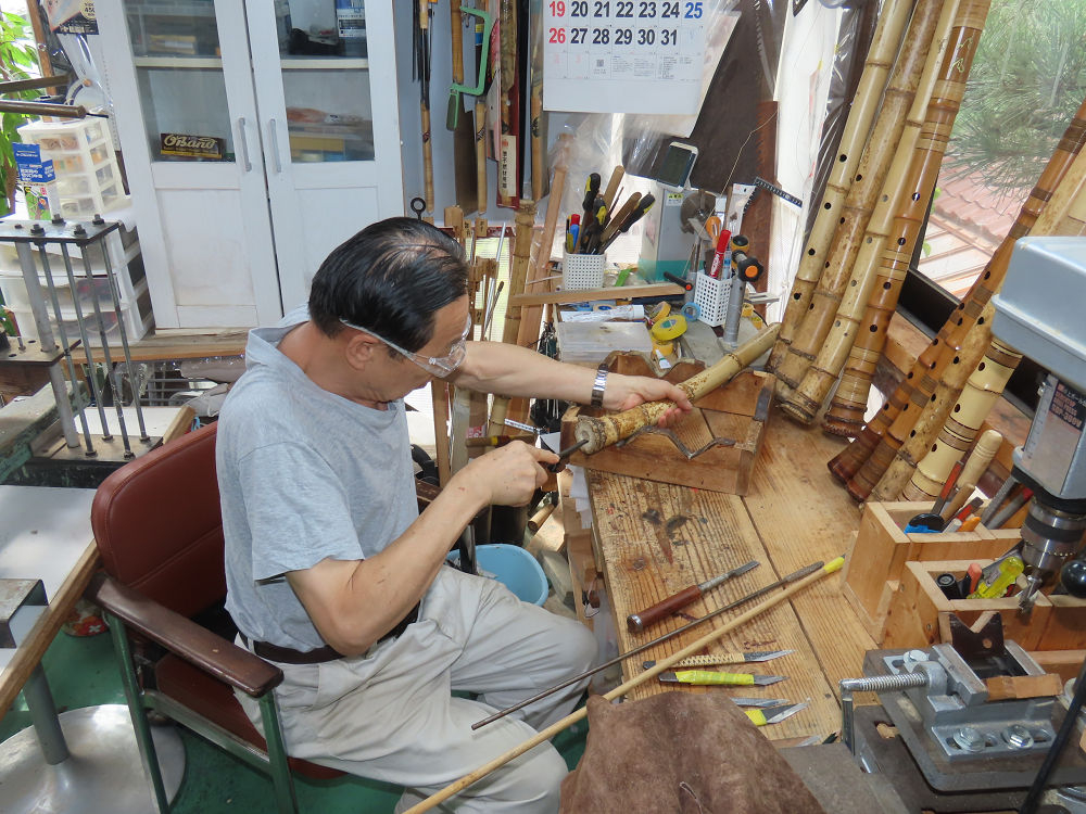 今朝は雨が上がり、高梁の街の周りの山々には、雲海が出ていました。作業を始めたときは長袖でしたが、10時を過ぎて作業場は30℃になり、半そでに着替えました。2尺1寸管の歌口仕上げの後、管尻内部に鼓加工をして、600グラムの2尺1寸管の下作りは完了しました。あまりに重くて、肉厚なので、内径は広くありません。若い頃、岡本竹外先生宅で稽古の時に、先生から太い竹の方が、細い竹より吹くのに楽であると、何度も聞きましたが、その当時は、まだ琴古流尺八で三曲合奏もしていて、吹く奏法なので、意味が理解出来ませんでした。後に琴古流をやめて、地無し尺八を丹田で鳴らす奏法になってから、初めて太い尺八の方が同じ息でも大きな音が出て、楽なことがわかりました。今回の重くて、中の狭い尺八は、歌口を吹く奏法には、良いですが、息受けが良くないので、同じ600グラムでも、太い2尺2寸管の方が、楽に鳴らせます。琴古流や都山流尺八を長年経験され、私に入門されたときに、みなさん細めの2尺3寸管を選ばれます。しかし5年ぐらい過ぎると、やっと太い尺八の方が大きな音が出て、楽であることを理解されます。その時に、太い尺八に交換をしてあげます。そうなると、細い尺八には戻れなくなります。