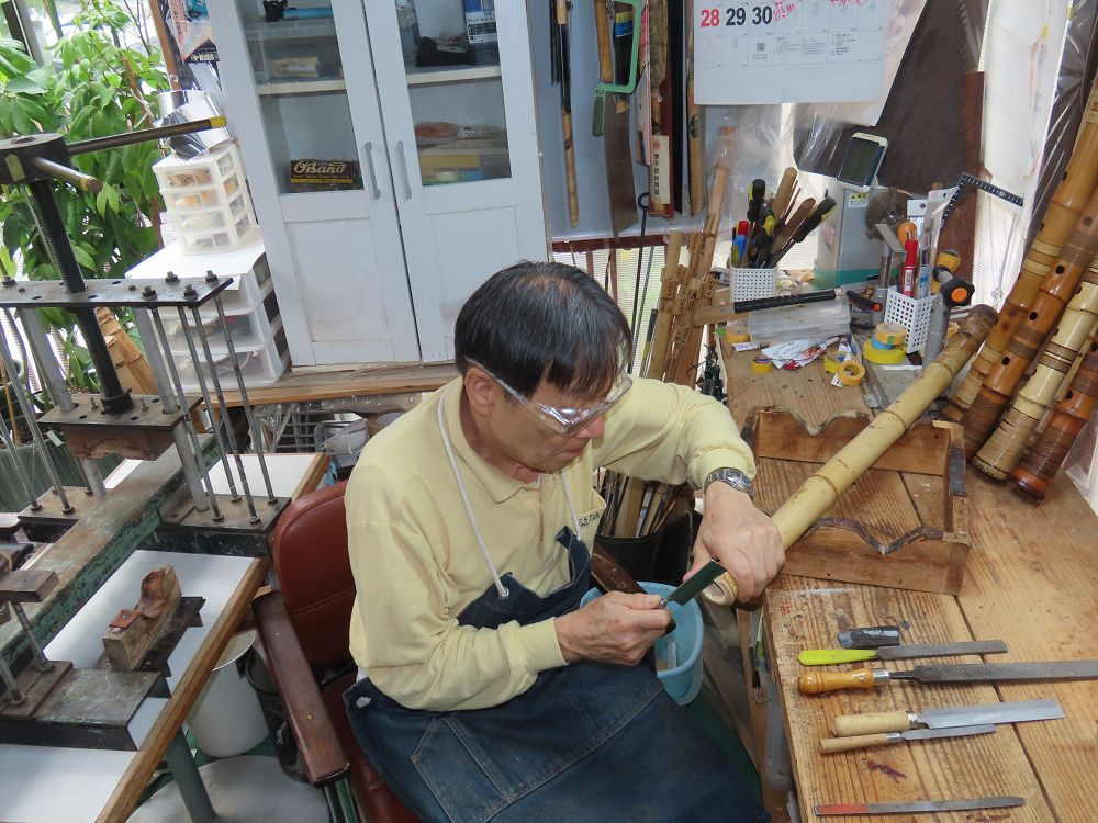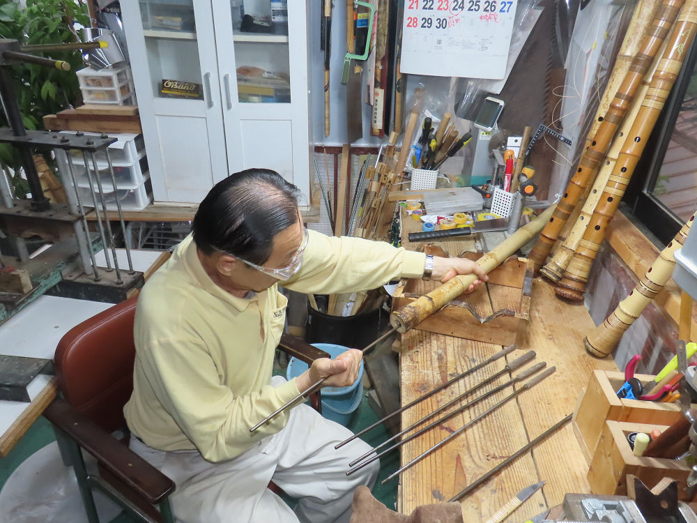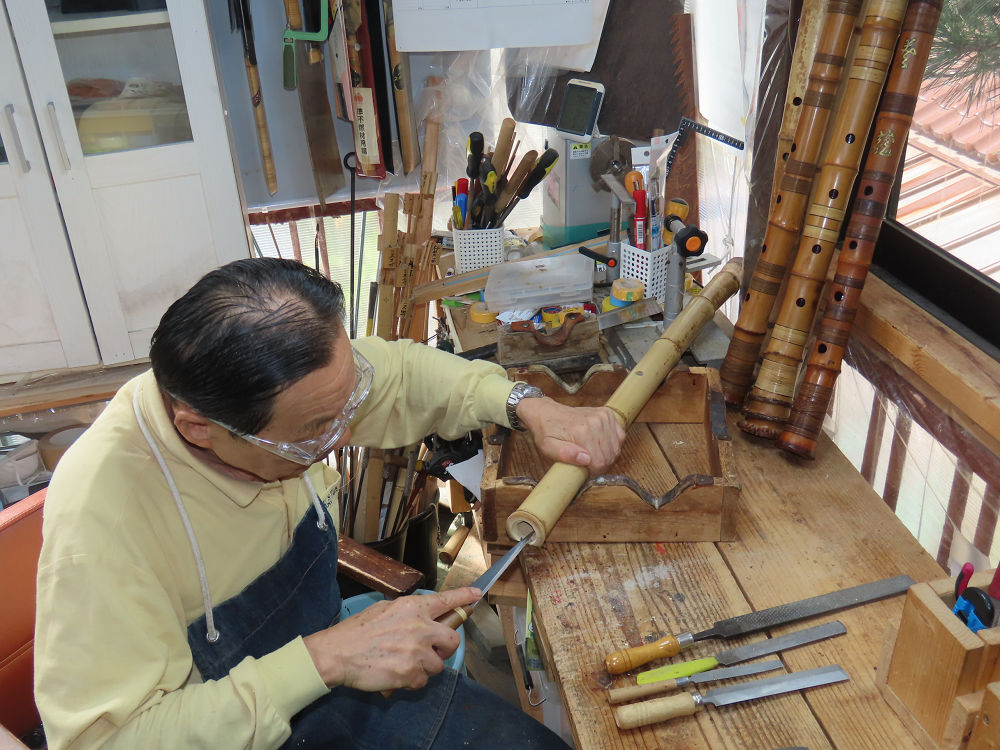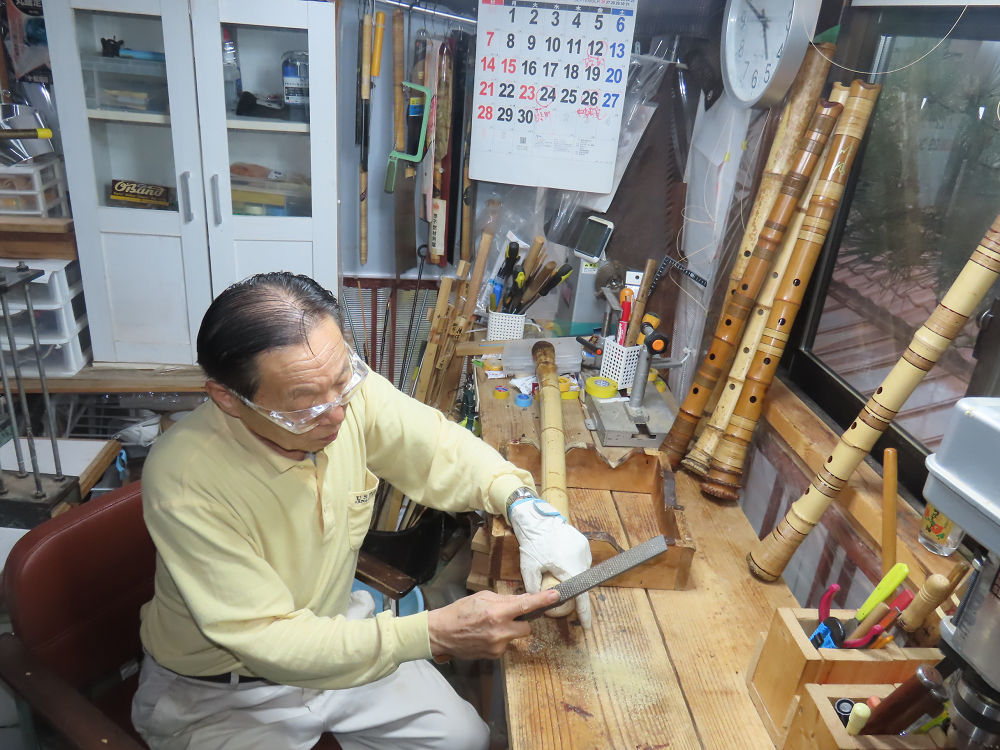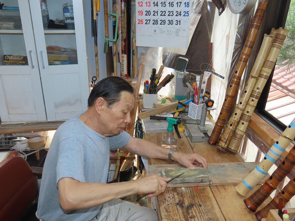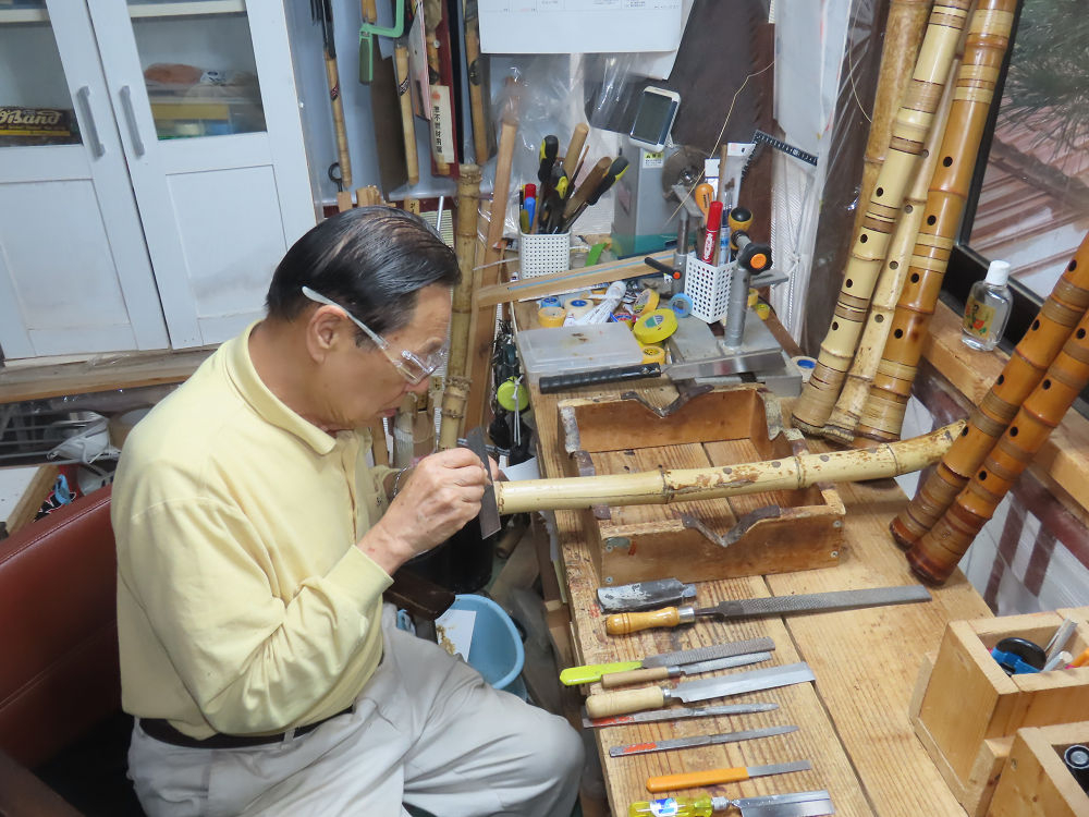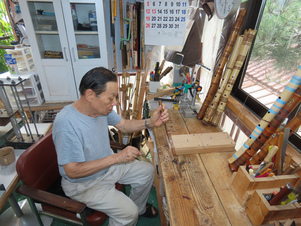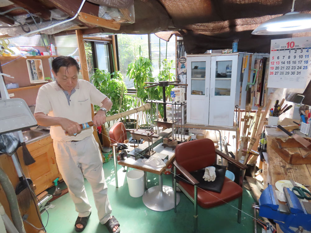 今朝は雨が上がり、高梁の街の周りの山々には、雲海が出ていました。作業を始めたときは長袖でしたが、10時を過ぎて作業場は30℃になり、半そでに着替えました。2尺1寸管の歌口仕上げの後、管尻内部に鼓加工をして、600グラムの2尺1寸管の下作りは完了しました。あまりに重くて、肉厚なので、内径は広くありません。若い頃、岡本竹外先生宅で稽古の時に、先生から太い竹の方が、細い竹より吹くのに楽であると、何度も聞きましたが、その当時は、まだ琴古流尺八で三曲合奏もしていて、吹く奏法なので、意味が理解出来ませんでした。後に琴古流をやめて、地無し尺八を丹田で鳴らす奏法になってから、初めて太い尺八の方が同じ息でも大きな音が出て、楽なことがわかりました。今回の重くて、中の狭い尺八は、歌口を吹く奏法には、良いですが、息受けが良くないので、同じ600グラムでも、太い2尺2寸管の方が、楽に鳴らせます。琴古流や都山流尺八を長年経験され、私に入門されたときに、みなさん細めの2尺3寸管を選ばれます。しかし5年ぐらい過ぎると、やっと太い尺八の方が大きな音が出て、楽であることを理解されます。その時に、太い尺八に交換をしてあげます。そうなると、細い尺八には戻れなくなります。
