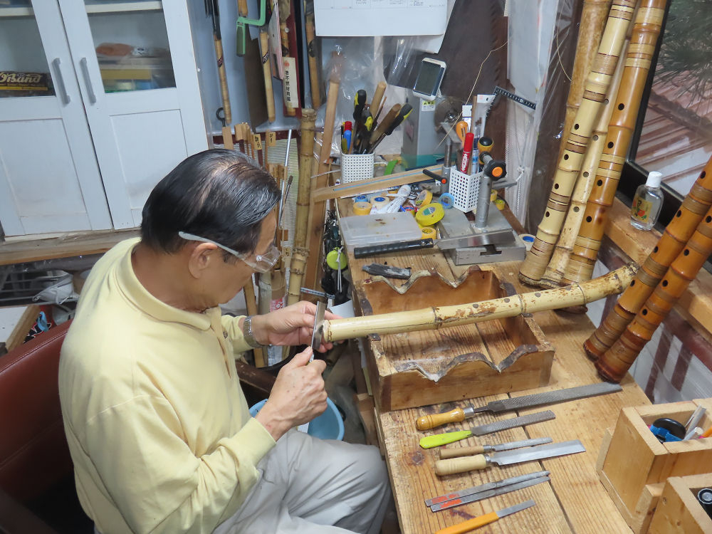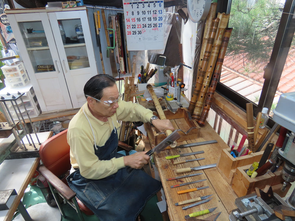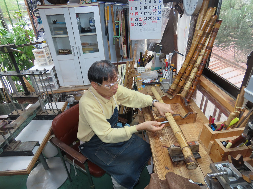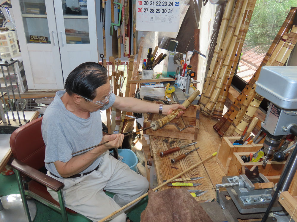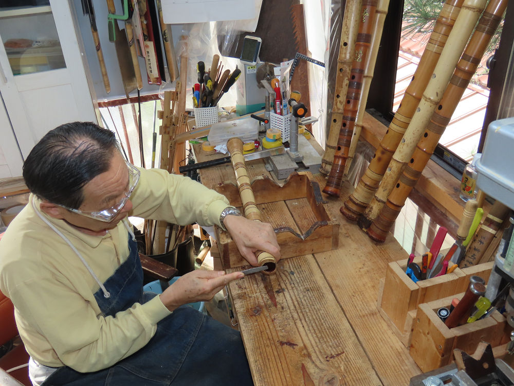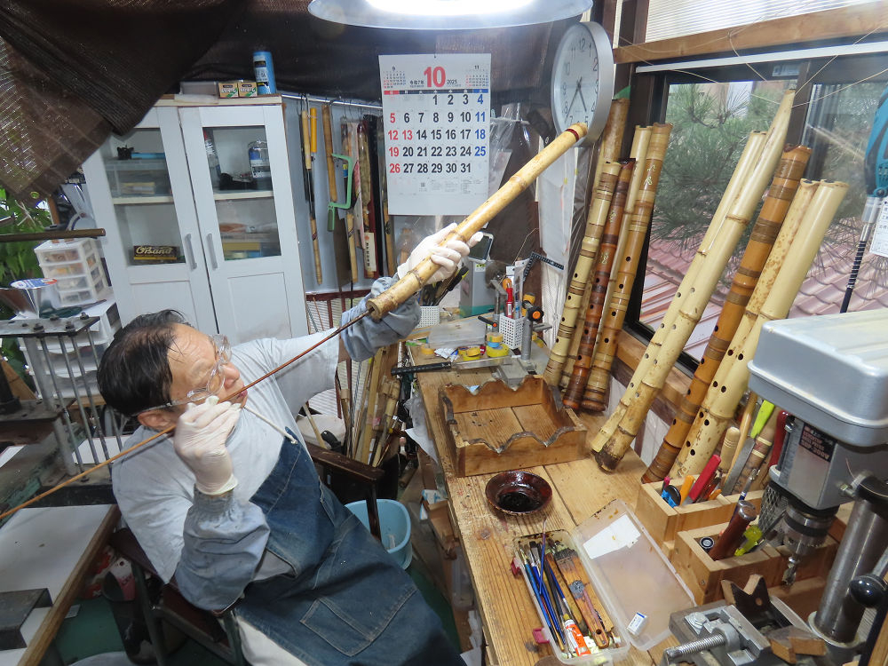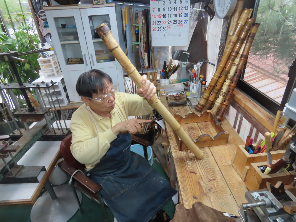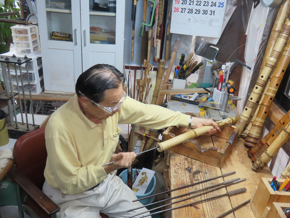 今朝は雨が上がり、高梁の街の周りの山々には、雲海が出ていました。作業を始めたときは長袖でしたが、10時を過ぎて作業場は30℃になり、半そでに着替えました。2尺1寸管の歌口仕上げの後、管尻内部に鼓加工をして、600グラムの2尺1寸管の下作りは完了しました。あまりに重くて、肉厚なので、内径は広くありません。若い頃、岡本竹外先生宅で稽古の時に、先生から太い竹の方が、細い竹より吹くのに楽であると、何度も聞きましたが、その当時は、まだ琴古流尺八で三曲合奏もしていて、吹く奏法なので、意味が理解出来ませんでした。後に琴古流をやめて、地無し尺八を丹田で鳴らす奏法になってから、初めて太い尺八の方が同じ息でも大きな音が出て、楽なことがわかりました。今回の重くて、中の狭い尺八は、歌口を吹く奏法には、良いですが、息受けが良くないので、同じ600グラムでも、太い2尺2寸管の方が、楽に鳴らせます。琴古流や都山流尺八を長年経験され、私に入門されたときに、みなさん細めの2尺3寸管を選ばれます。しかし5年ぐらい過ぎると、やっと太い尺八の方が大きな音が出て、楽であることを理解されます。その時に、太い尺八に交換をしてあげます。そうなると、細い尺八には戻れなくなります。