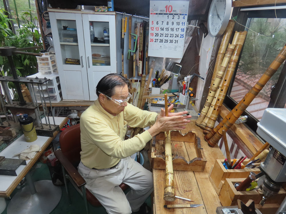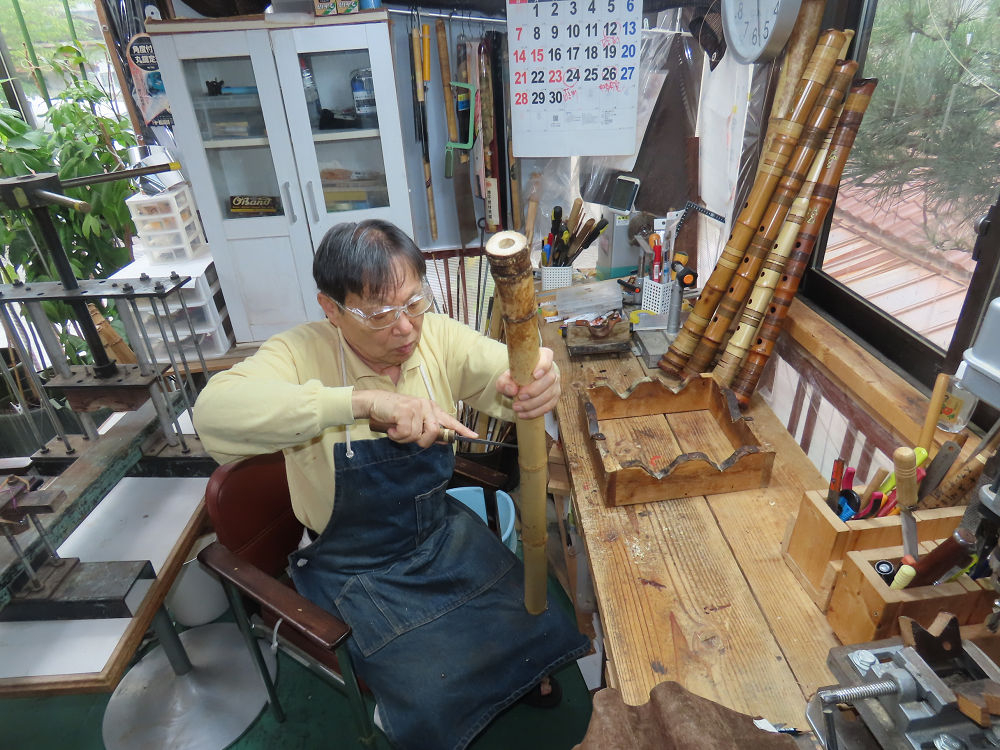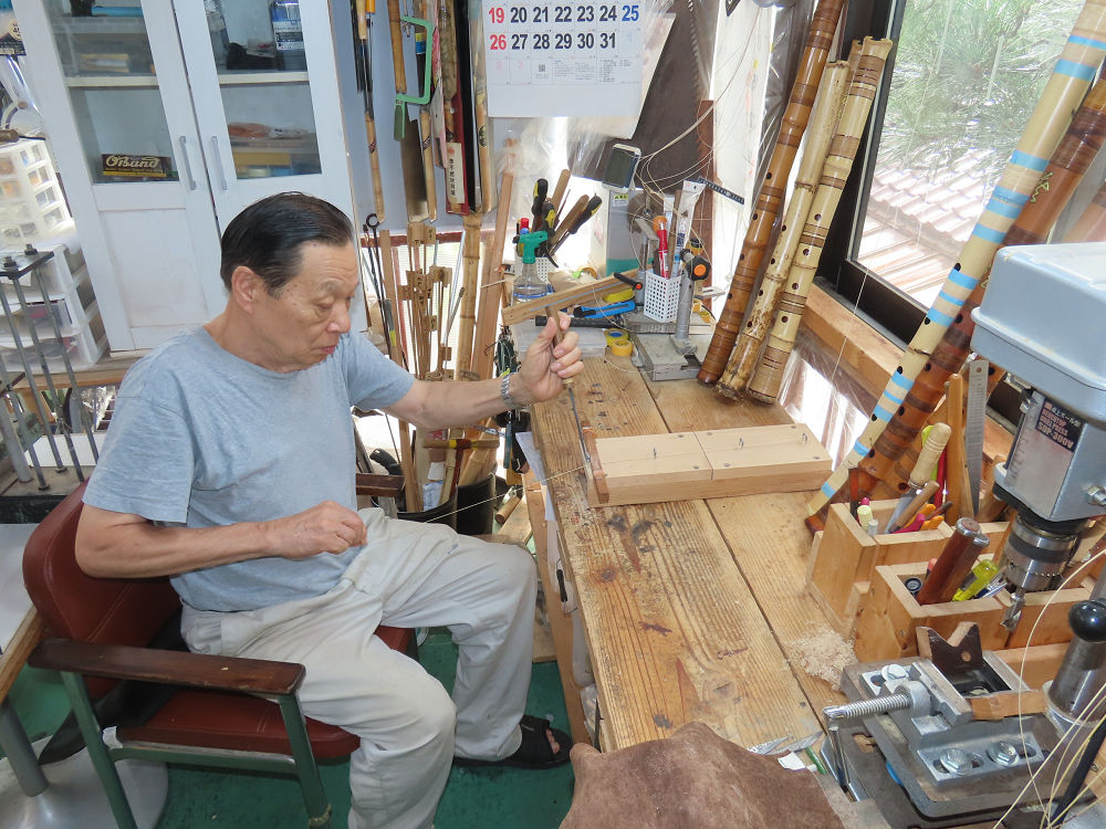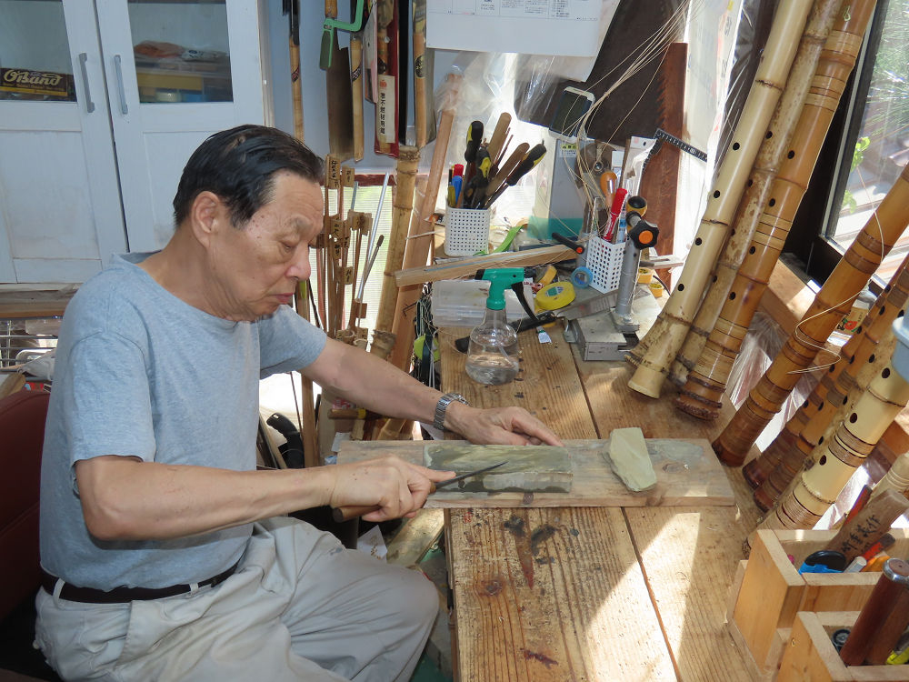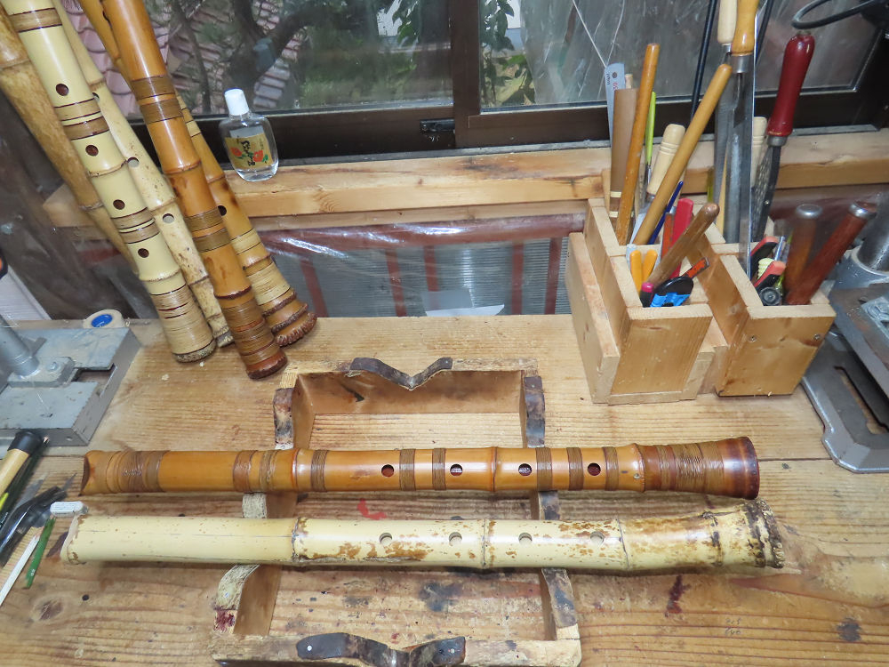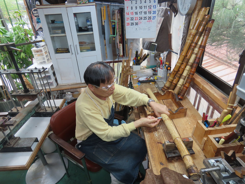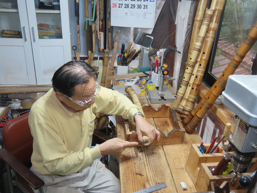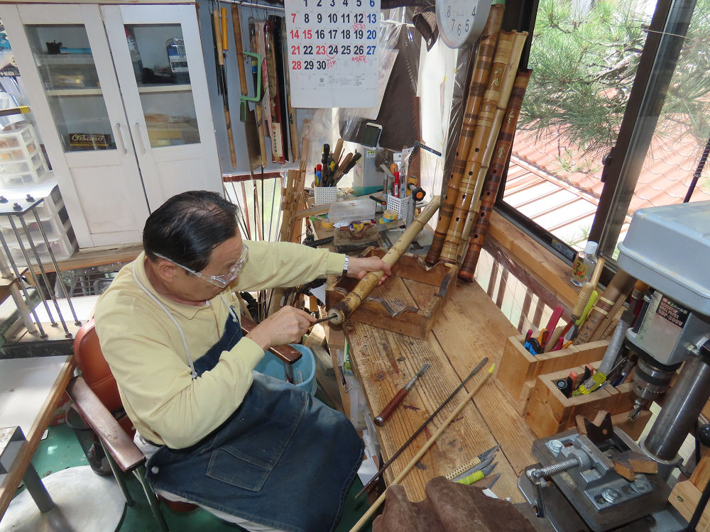 今朝は雨が上がり、高梁の街の周りの山々には、雲海が出ていました。作業を始めたときは長袖でしたが、10時を過ぎて作業場は30℃になり、半そでに着替えました。2尺1寸管の歌口仕上げの後、管尻内部に鼓加工をして、600グラムの2尺1寸管の下作りは完了しました。あまりに重くて、肉厚なので、内径は広くありません。若い頃、岡本竹外先生宅で稽古の時に、先生から太い竹の方が、細い竹より吹くのに楽であると、何度も聞きましたが、その当時は、まだ琴古流尺八で三曲合奏もしていて、吹く奏法なので、意味が理解出来ませんでした。後に琴古流をやめて、地無し尺八を丹田で鳴らす奏法になってから、初めて太い尺八の方が同じ息でも大きな音が出て、楽なことがわかりました。今回の重くて、中の狭い尺八は、歌口を吹く奏法には、良いですが、息受けが良くないので、同じ600グラムでも、太い2尺2寸管の方が、楽に鳴らせます。琴古流や都山流尺八を長年経験され、私に入門されたときに、みなさん細めの2尺3寸管を選ばれます。しかし5年ぐらい過ぎると、やっと太い尺八の方が大きな音が出て、楽であることを理解されます。その時に、太い尺八に交換をしてあげます。そうなると、細い尺八には戻れなくなります。