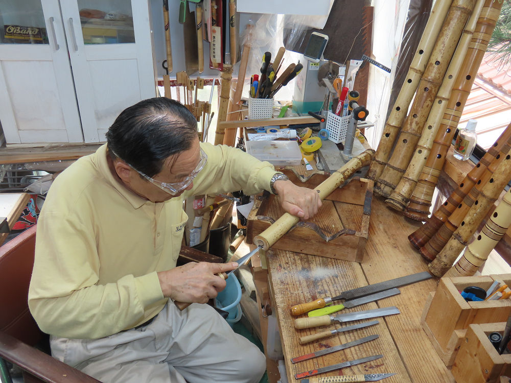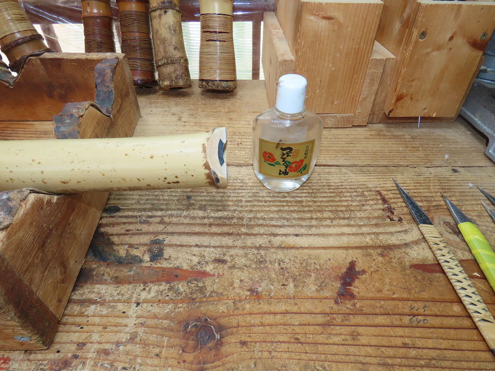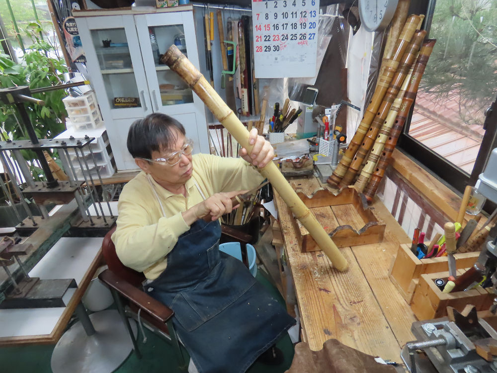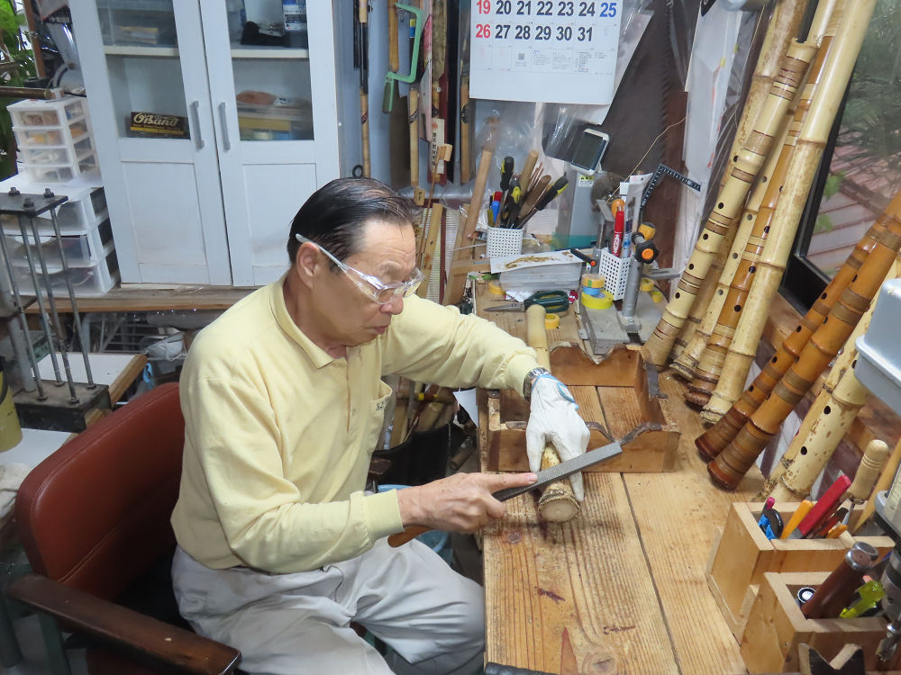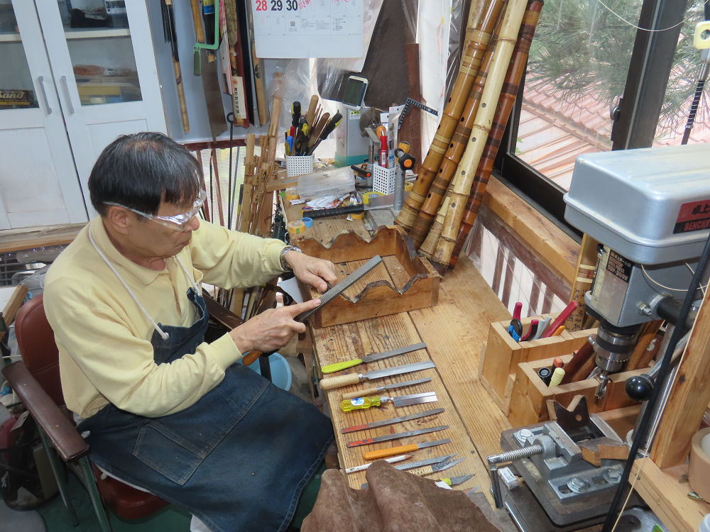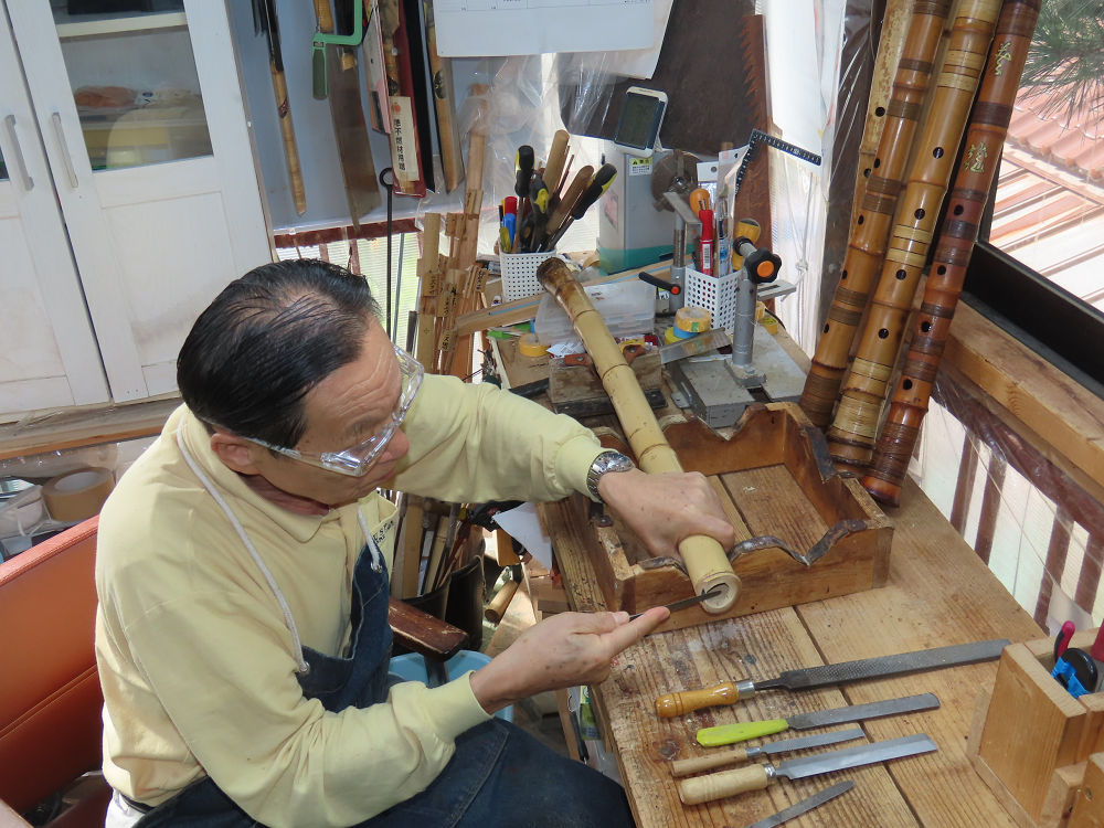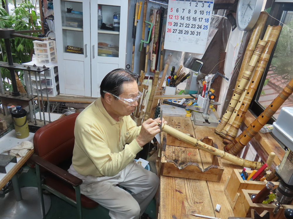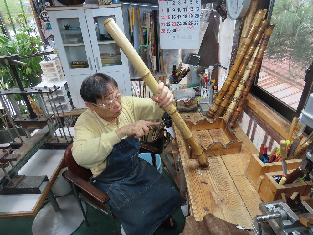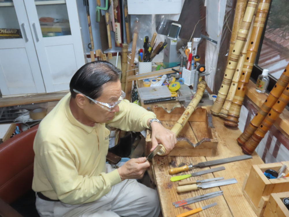 今朝は雨が上がり、高梁の街の周りの山々には、雲海が出ていました。作業を始めたときは長袖でしたが、10時を過ぎて作業場は30℃になり、半そでに着替えました。2尺1寸管の歌口仕上げの後、管尻内部に鼓加工をして、600グラムの2尺1寸管の下作りは完了しました。あまりに重くて、肉厚なので、内径は広くありません。若い頃、岡本竹外先生宅で稽古の時に、先生から太い竹の方が、細い竹より吹くのに楽であると、何度も聞きましたが、その当時は、まだ琴古流尺八で三曲合奏もしていて、吹く奏法なので、意味が理解出来ませんでした。後に琴古流をやめて、地無し尺八を丹田で鳴らす奏法になってから、初めて太い尺八の方が同じ息でも大きな音が出て、楽なことがわかりました。今回の重くて、中の狭い尺八は、歌口を吹く奏法には、良いですが、息受けが良くないので、同じ600グラムでも、太い2尺2寸管の方が、楽に鳴らせます。琴古流や都山流尺八を長年経験され、私に入門されたときに、みなさん細めの2尺3寸管を選ばれます。しかし5年ぐらい過ぎると、やっと太い尺八の方が大きな音が出て、楽であることを理解されます。その時に、太い尺八に交換をしてあげます。そうなると、細い尺八には戻れなくなります。