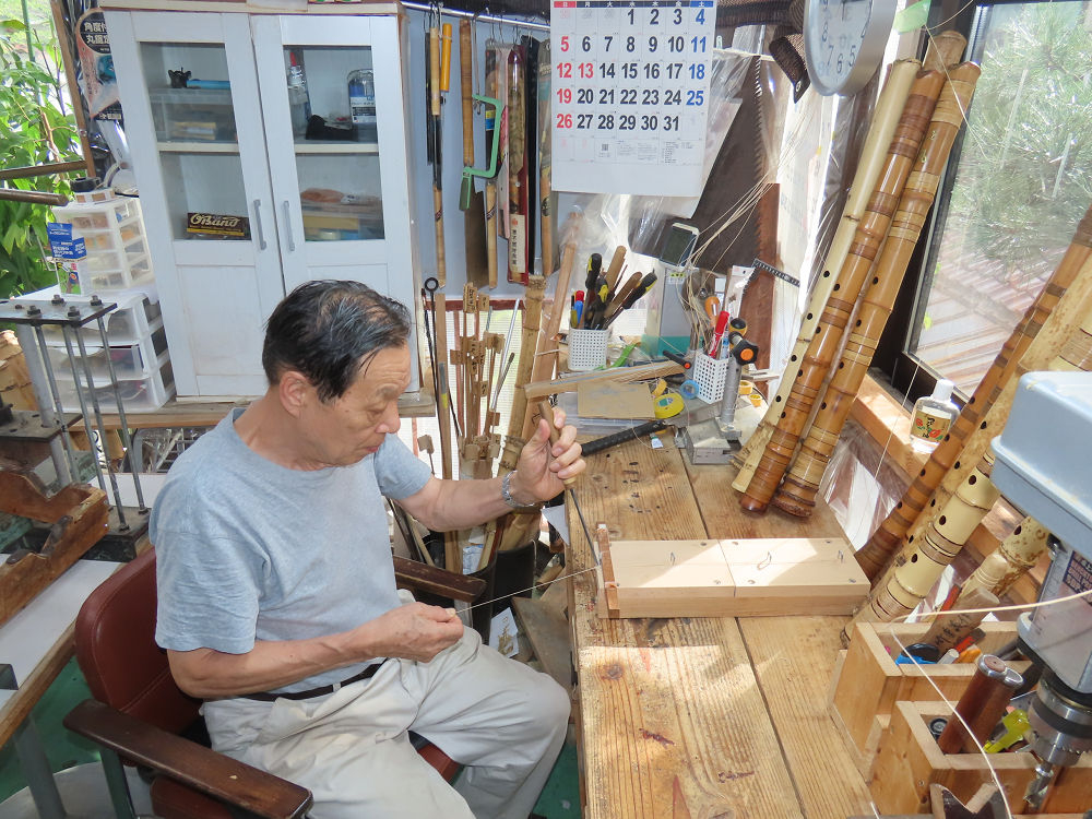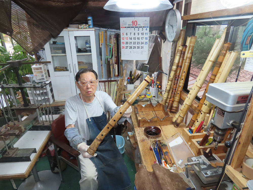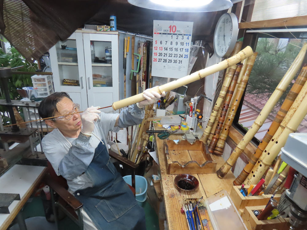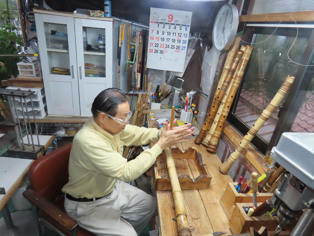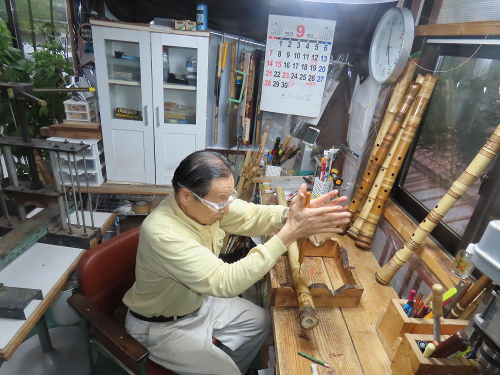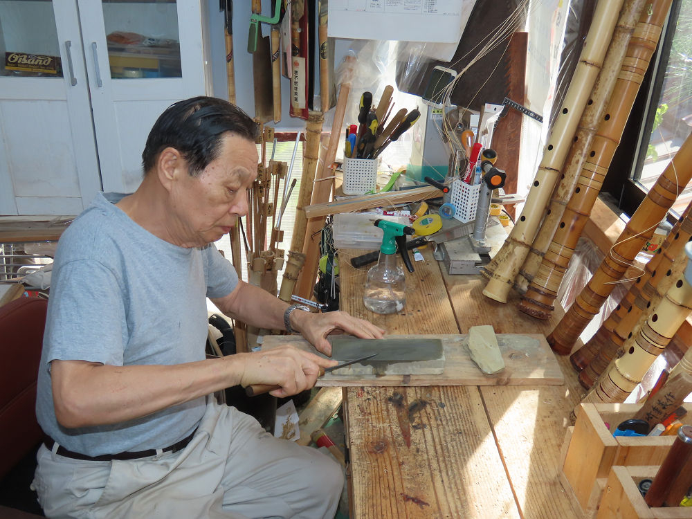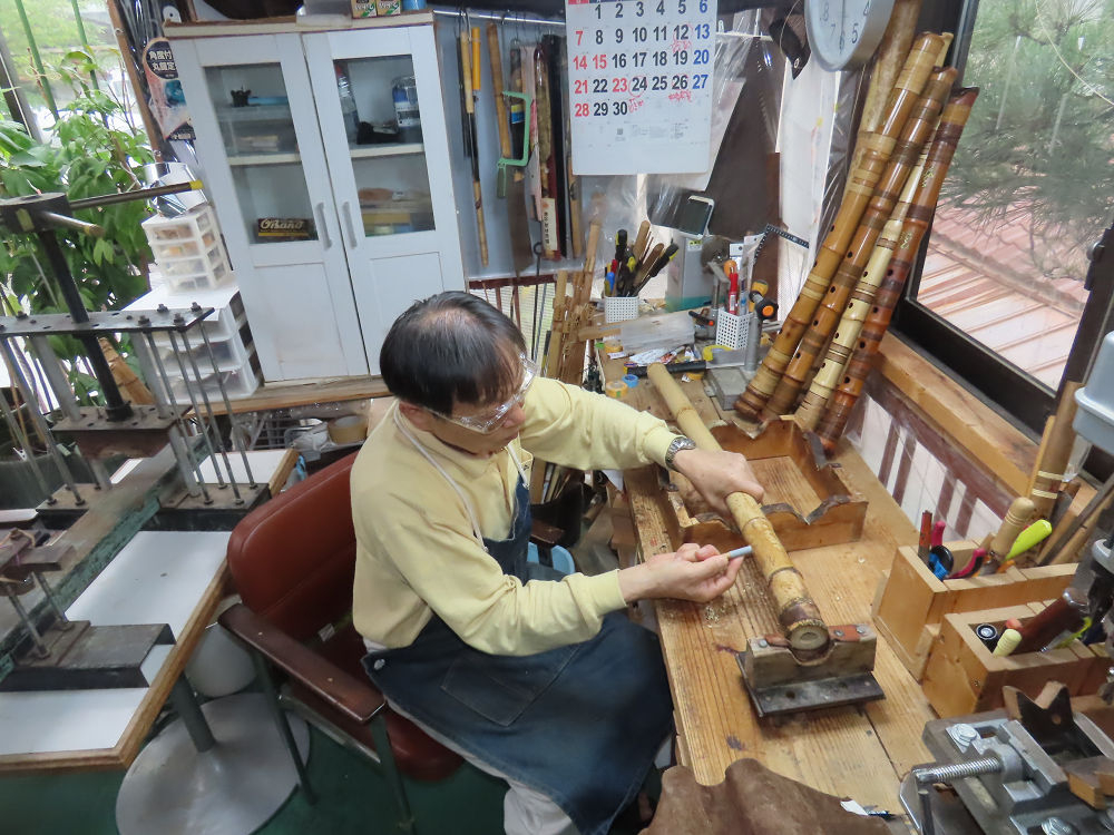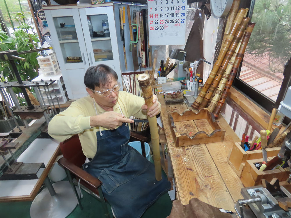 今朝は雨が上がり、高梁の街の周りの山々には、雲海が出ていました。作業を始めたときは長袖でしたが、10時を過ぎて作業場は30℃になり、半そでに着替えました。2尺1寸管の歌口仕上げの後、管尻内部に鼓加工をして、600グラムの2尺1寸管の下作りは完了しました。あまりに重くて、肉厚なので、内径は広くありません。若い頃、岡本竹外先生宅で稽古の時に、先生から太い竹の方が、細い竹より吹くのに楽であると、何度も聞きましたが、その当時は、まだ琴古流尺八で三曲合奏もしていて、吹く奏法なので、意味が理解出来ませんでした。後に琴古流をやめて、地無し尺八を丹田で鳴らす奏法になってから、初めて太い尺八の方が同じ息でも大きな音が出て、楽なことがわかりました。今回の重くて、中の狭い尺八は、歌口を吹く奏法には、良いですが、息受けが良くないので、同じ600グラムでも、太い2尺2寸管の方が、楽に鳴らせます。琴古流や都山流尺八を長年経験され、私に入門されたときに、みなさん細めの2尺3寸管を選ばれます。しかし5年ぐらい過ぎると、やっと太い尺八の方が大きな音が出て、楽であることを理解されます。その時に、太い尺八に交換をしてあげます。そうなると、細い尺八には戻れなくなります。