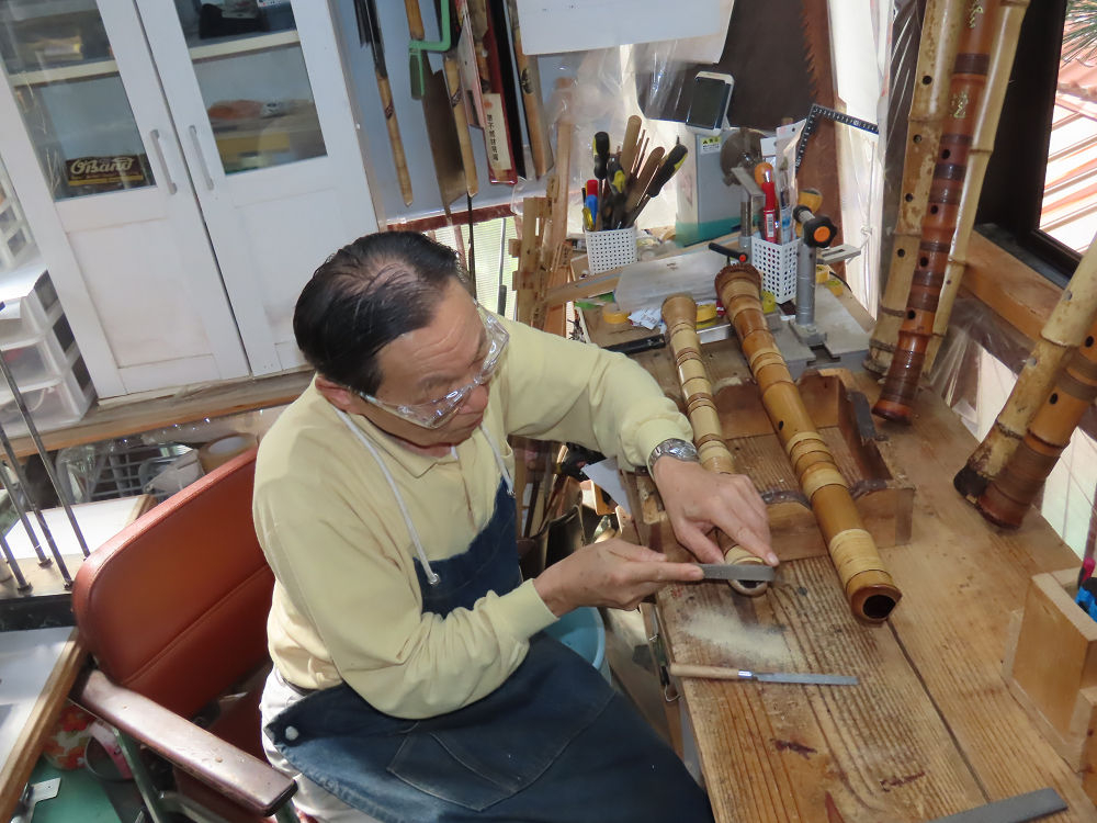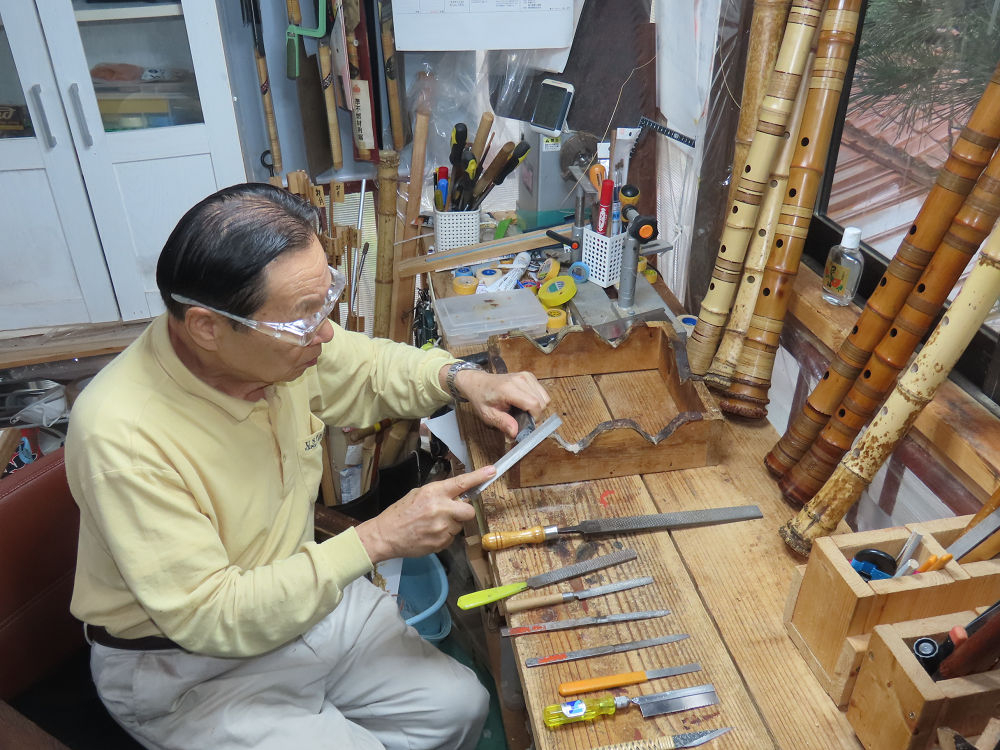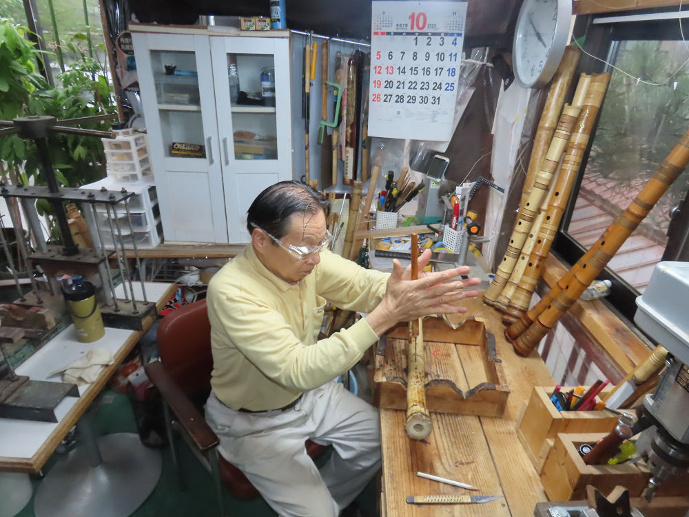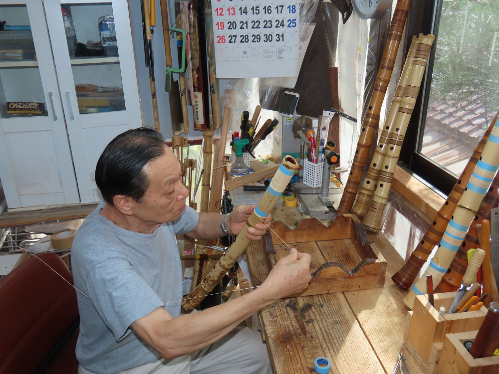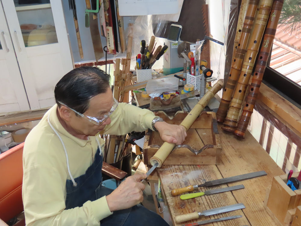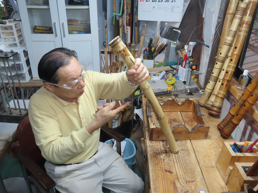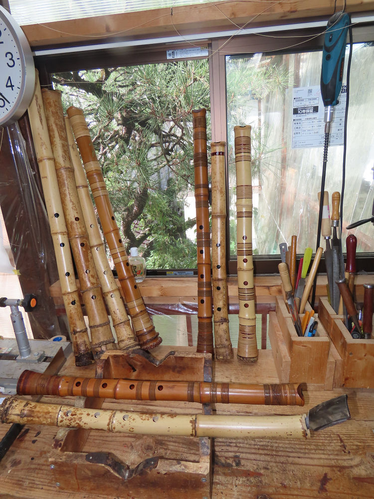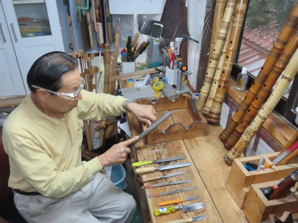 今朝は雨が上がり、高梁の街の周りの山々には、雲海が出ていました。作業を始めたときは長袖でしたが、10時を過ぎて作業場は30℃になり、半そでに着替えました。2尺1寸管の歌口仕上げの後、管尻内部に鼓加工をして、600グラムの2尺1寸管の下作りは完了しました。あまりに重くて、肉厚なので、内径は広くありません。若い頃、岡本竹外先生宅で稽古の時に、先生から太い竹の方が、細い竹より吹くのに楽であると、何度も聞きましたが、その当時は、まだ琴古流尺八で三曲合奏もしていて、吹く奏法なので、意味が理解出来ませんでした。後に琴古流をやめて、地無し尺八を丹田で鳴らす奏法になってから、初めて太い尺八の方が同じ息でも大きな音が出て、楽なことがわかりました。今回の重くて、中の狭い尺八は、歌口を吹く奏法には、良いですが、息受けが良くないので、同じ600グラムでも、太い2尺2寸管の方が、楽に鳴らせます。琴古流や都山流尺八を長年経験され、私に入門されたときに、みなさん細めの2尺3寸管を選ばれます。しかし5年ぐらい過ぎると、やっと太い尺八の方が大きな音が出て、楽であることを理解されます。その時に、太い尺八に交換をしてあげます。そうなると、細い尺八には戻れなくなります。