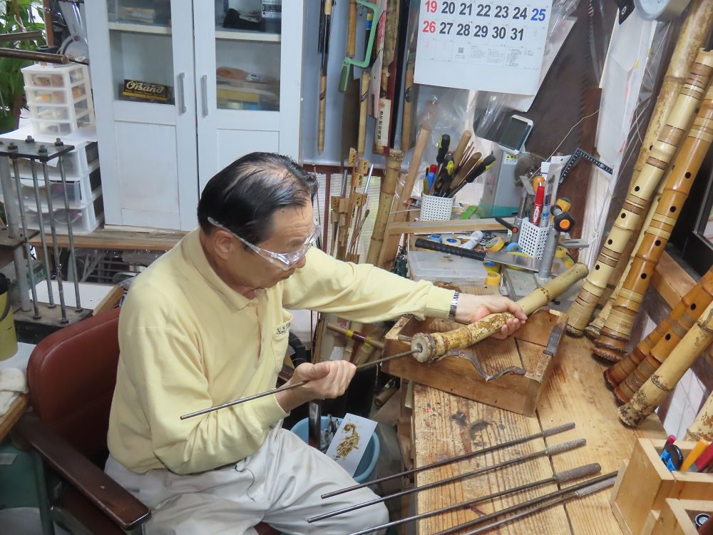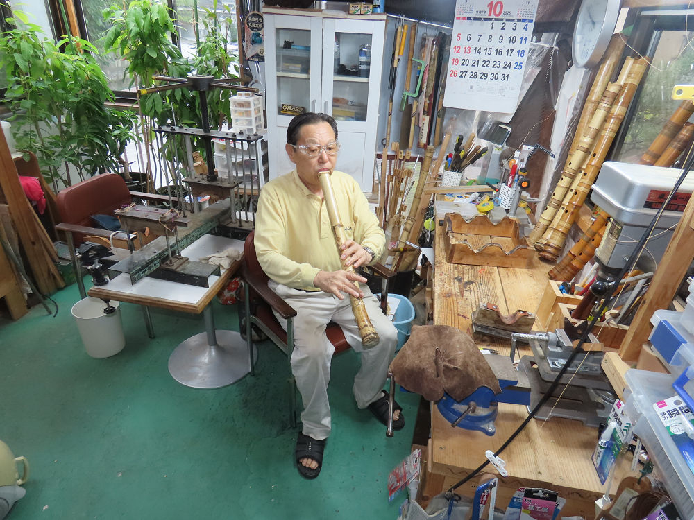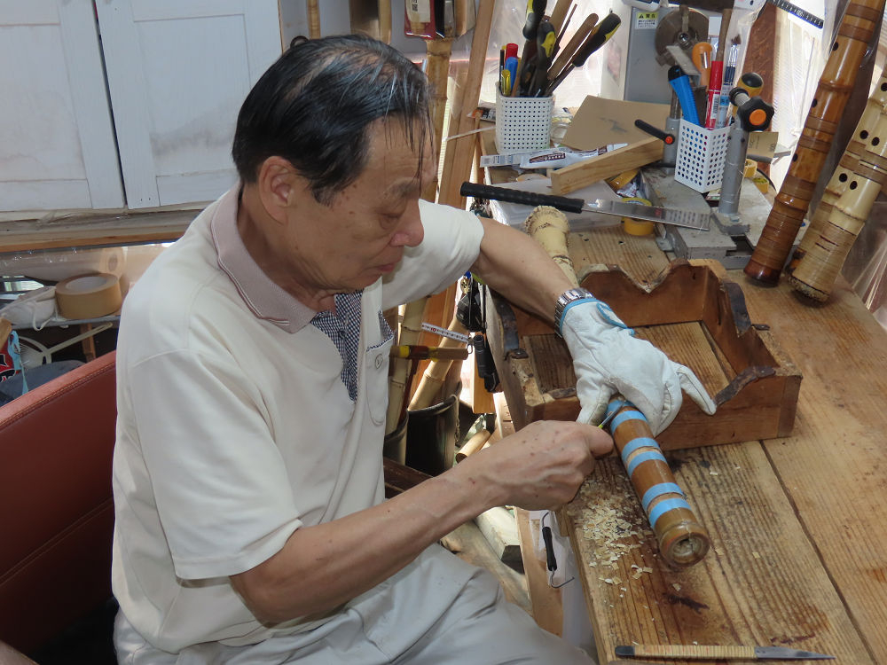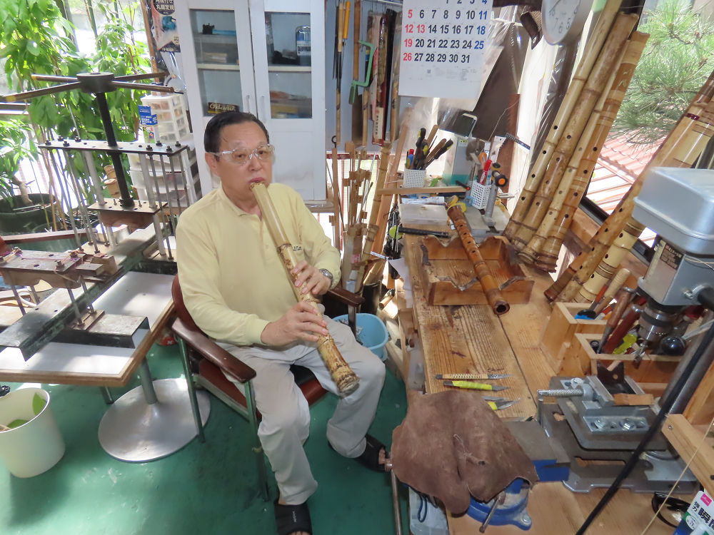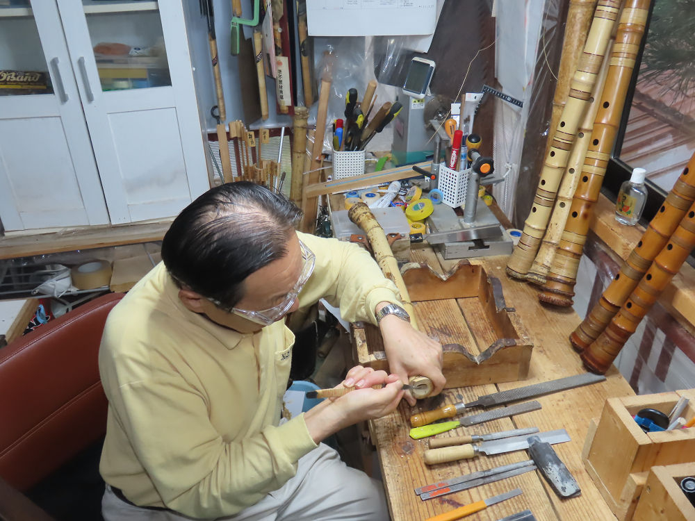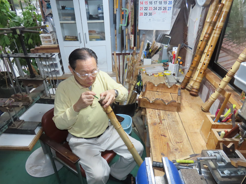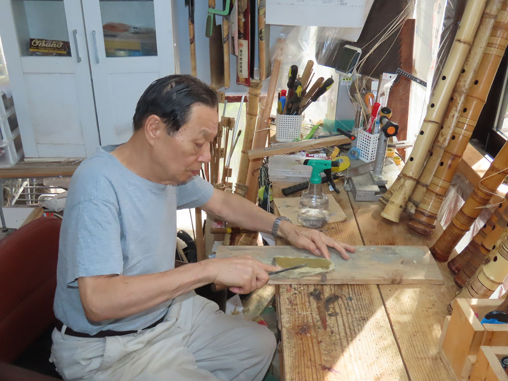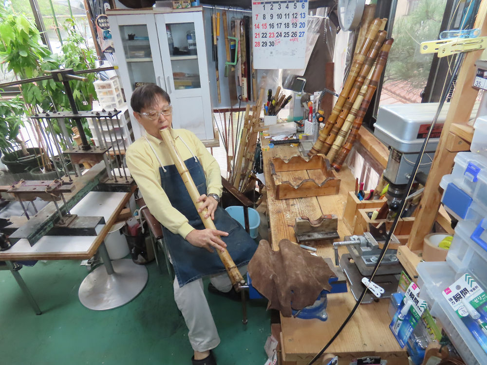 今朝は雨が上がり、高梁の街の周りの山々には、雲海が出ていました。作業を始めたときは長袖でしたが、10時を過ぎて作業場は30℃になり、半そでに着替えました。2尺1寸管の歌口仕上げの後、管尻内部に鼓加工をして、600グラムの2尺1寸管の下作りは完了しました。あまりに重くて、肉厚なので、内径は広くありません。若い頃、岡本竹外先生宅で稽古の時に、先生から太い竹の方が、細い竹より吹くのに楽であると、何度も聞きましたが、その当時は、まだ琴古流尺八で三曲合奏もしていて、吹く奏法なので、意味が理解出来ませんでした。後に琴古流をやめて、地無し尺八を丹田で鳴らす奏法になってから、初めて太い尺八の方が同じ息でも大きな音が出て、楽なことがわかりました。今回の重くて、中の狭い尺八は、歌口を吹く奏法には、良いですが、息受けが良くないので、同じ600グラムでも、太い2尺2寸管の方が、楽に鳴らせます。琴古流や都山流尺八を長年経験され、私に入門されたときに、みなさん細めの2尺3寸管を選ばれます。しかし5年ぐらい過ぎると、やっと太い尺八の方が大きな音が出て、楽であることを理解されます。その時に、太い尺八に交換をしてあげます。そうなると、細い尺八には戻れなくなります。