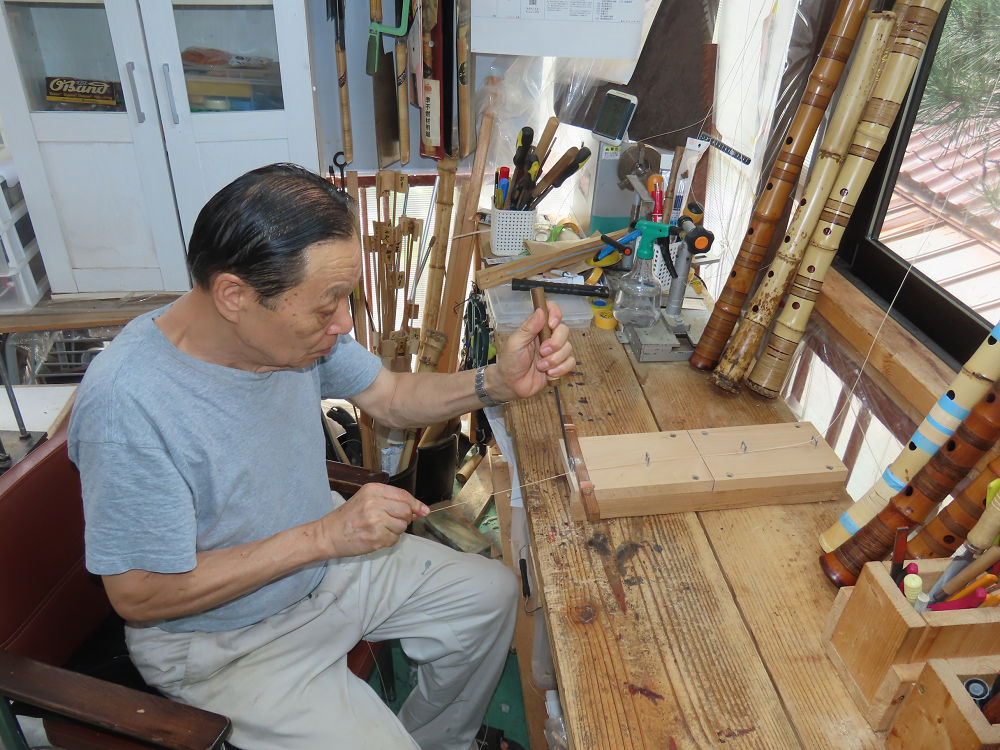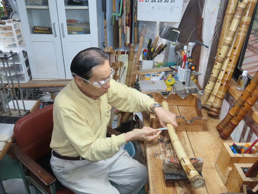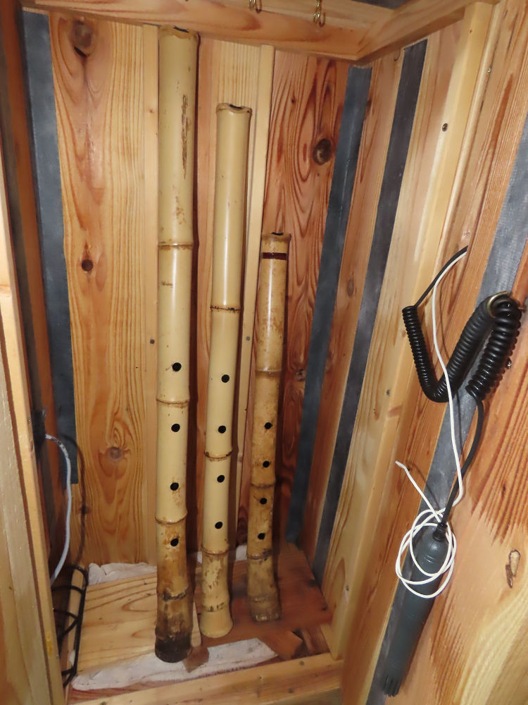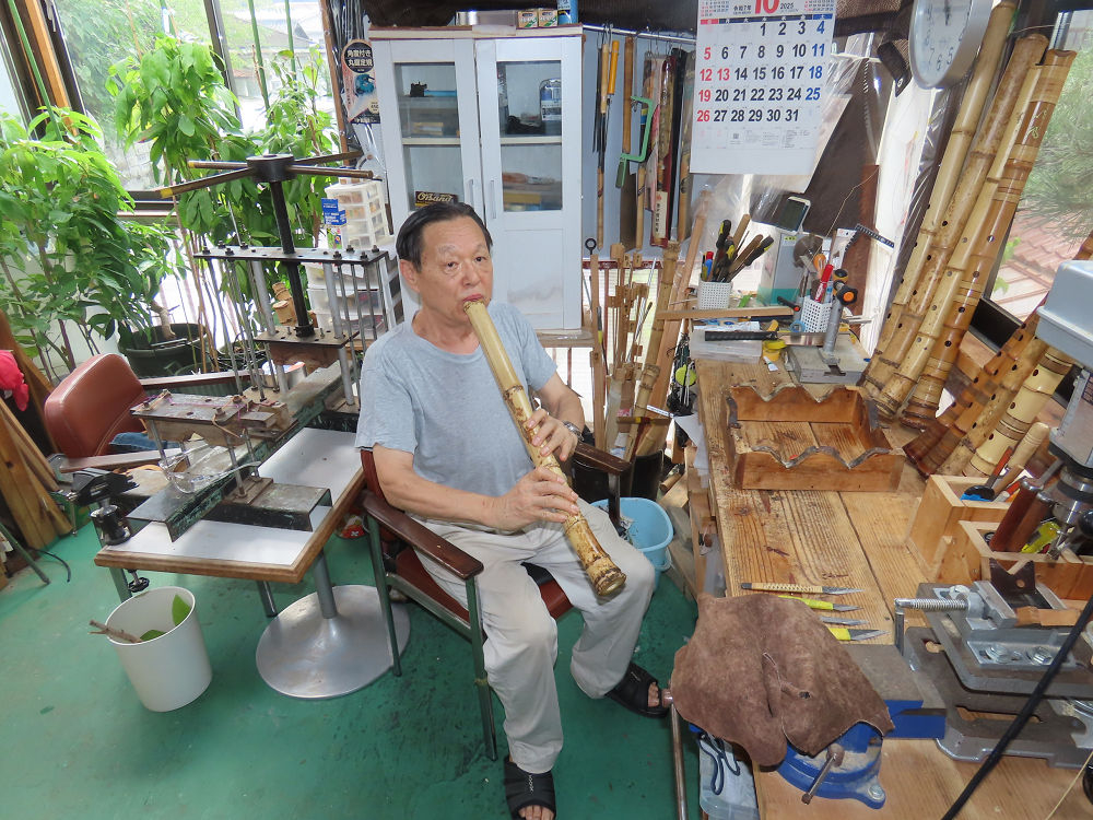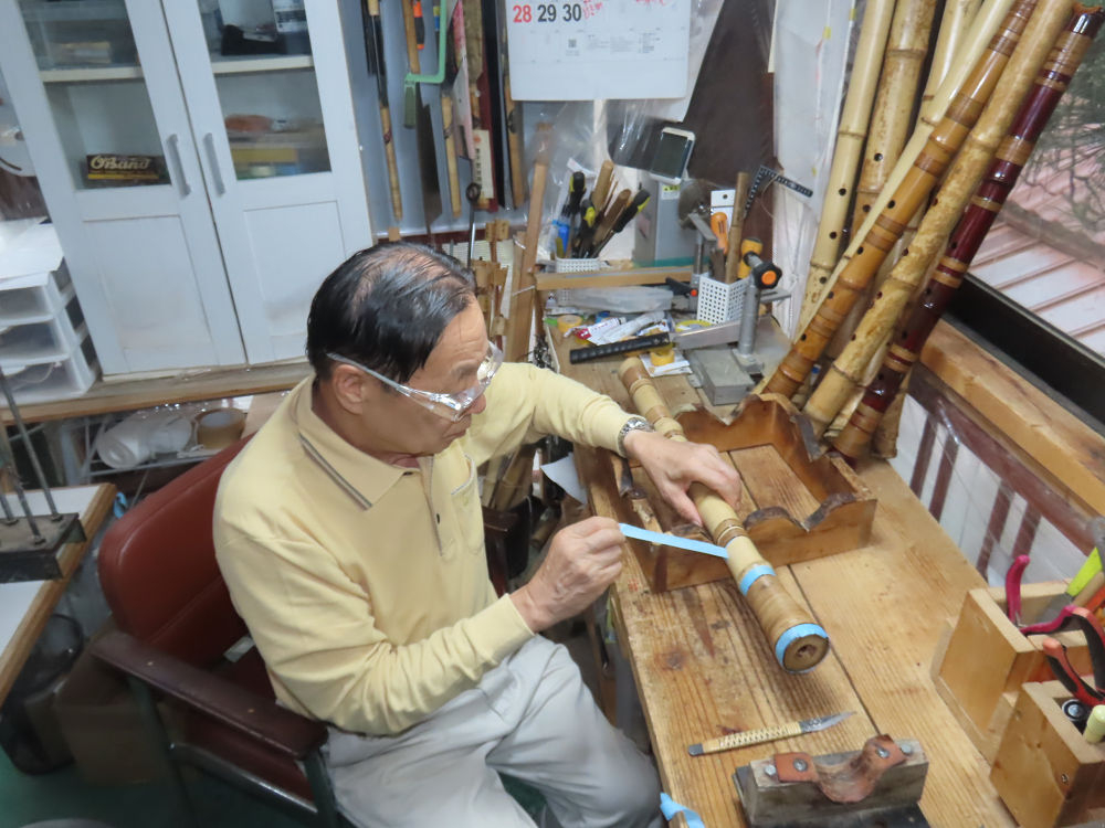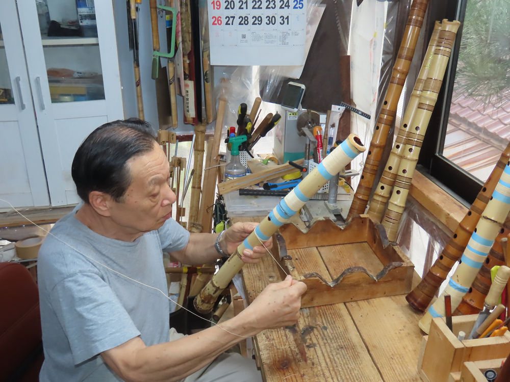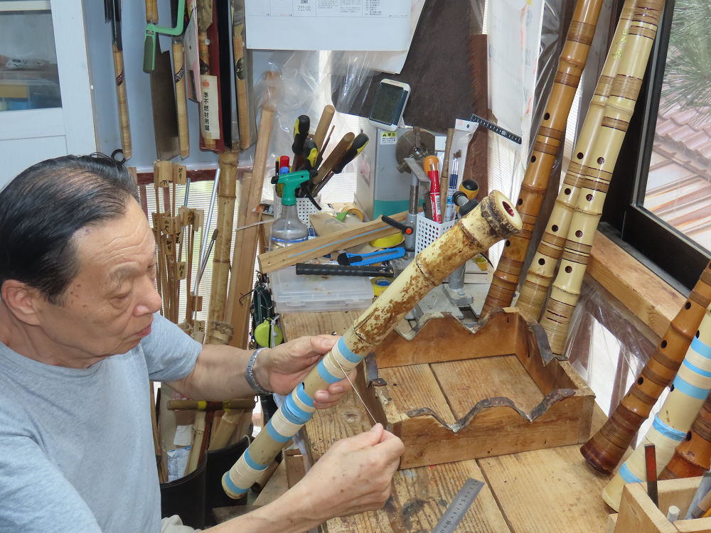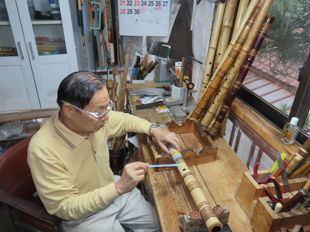 今朝は雨が上がり、高梁の街の周りの山々には、雲海が出ていました。作業を始めたときは長袖でしたが、10時を過ぎて作業場は30℃になり、半そでに着替えました。2尺1寸管の歌口仕上げの後、管尻内部に鼓加工をして、600グラムの2尺1寸管の下作りは完了しました。あまりに重くて、肉厚なので、内径は広くありません。若い頃、岡本竹外先生宅で稽古の時に、先生から太い竹の方が、細い竹より吹くのに楽であると、何度も聞きましたが、その当時は、まだ琴古流尺八で三曲合奏もしていて、吹く奏法なので、意味が理解出来ませんでした。後に琴古流をやめて、地無し尺八を丹田で鳴らす奏法になってから、初めて太い尺八の方が同じ息でも大きな音が出て、楽なことがわかりました。今回の重くて、中の狭い尺八は、歌口を吹く奏法には、良いですが、息受けが良くないので、同じ600グラムでも、太い2尺2寸管の方が、楽に鳴らせます。琴古流や都山流尺八を長年経験され、私に入門されたときに、みなさん細めの2尺3寸管を選ばれます。しかし5年ぐらい過ぎると、やっと太い尺八の方が大きな音が出て、楽であることを理解されます。その時に、太い尺八に交換をしてあげます。そうなると、細い尺八には戻れなくなります。