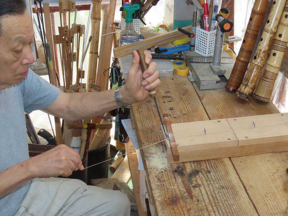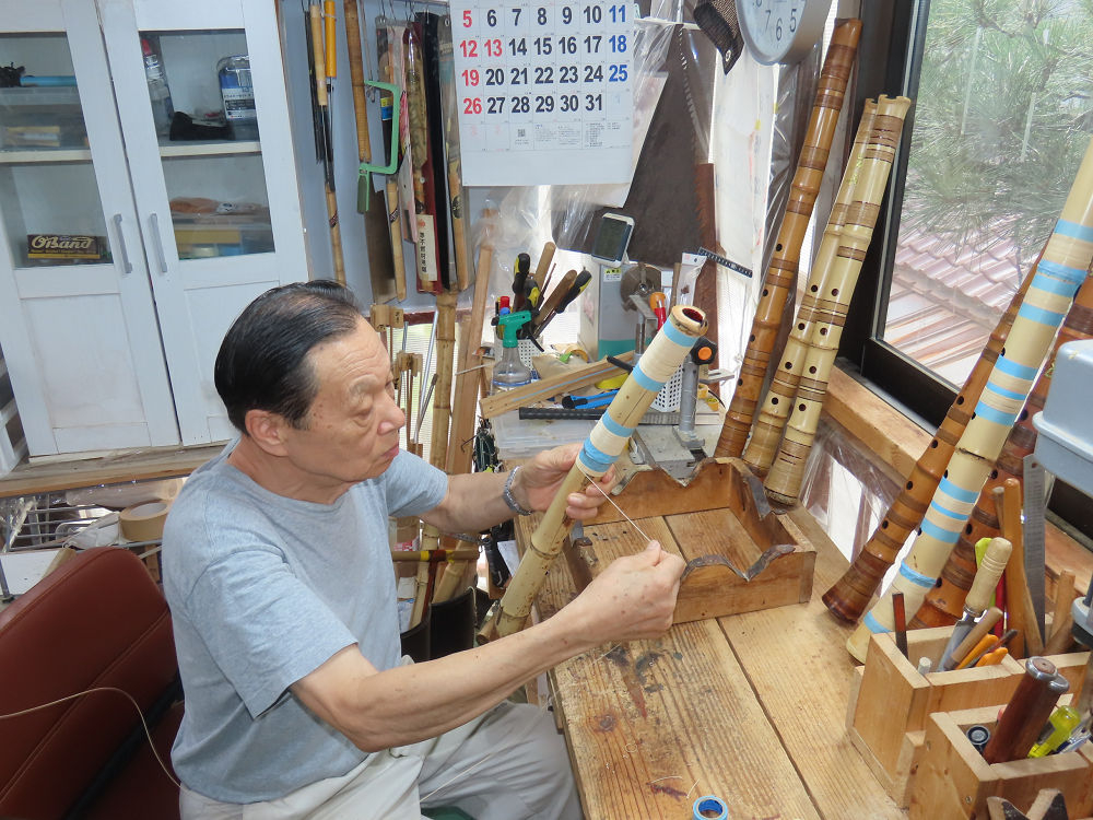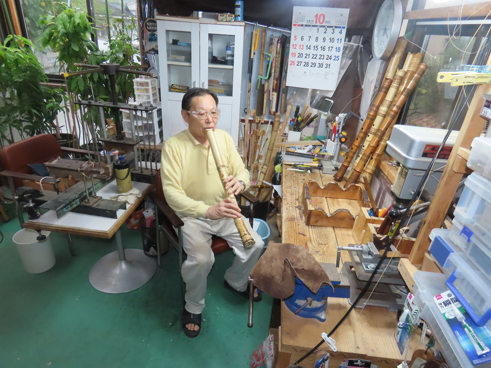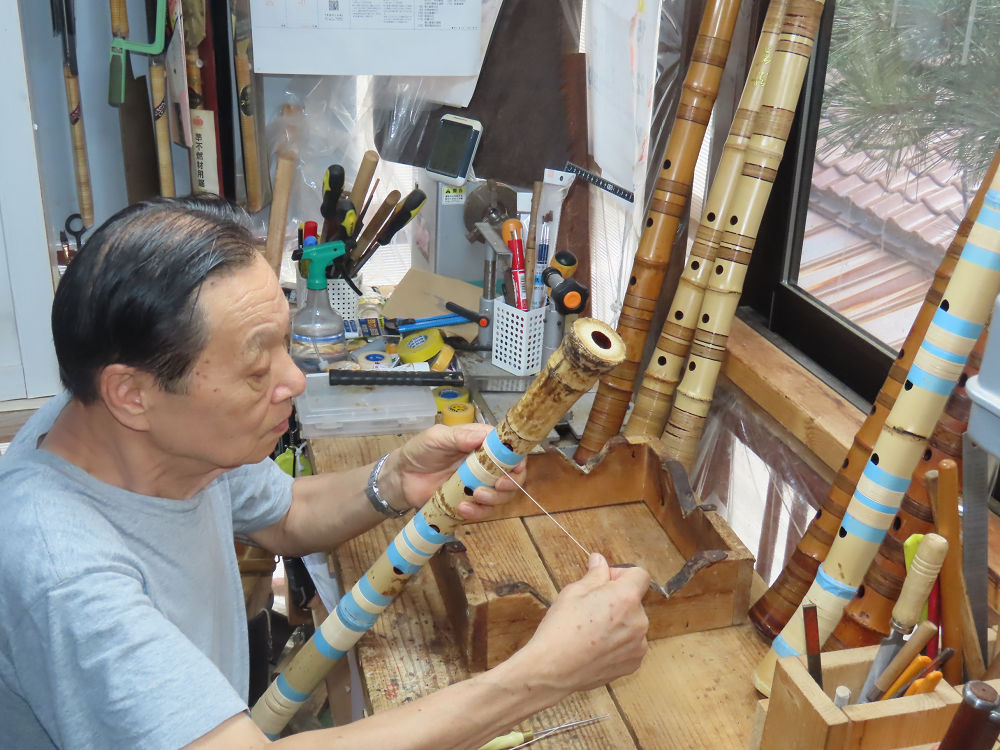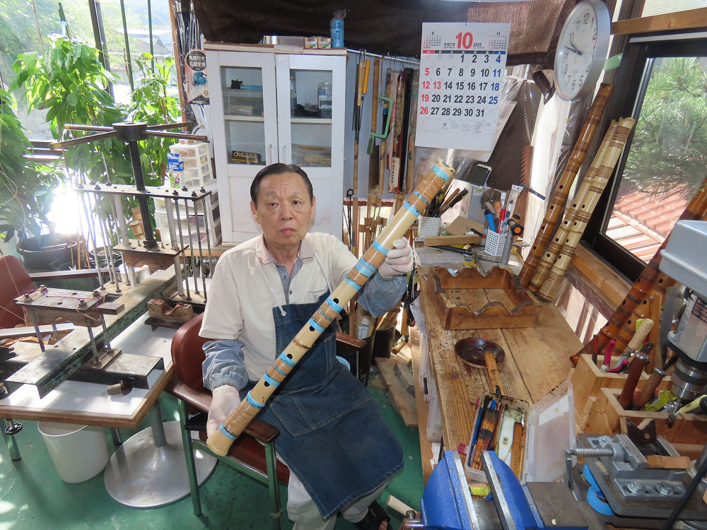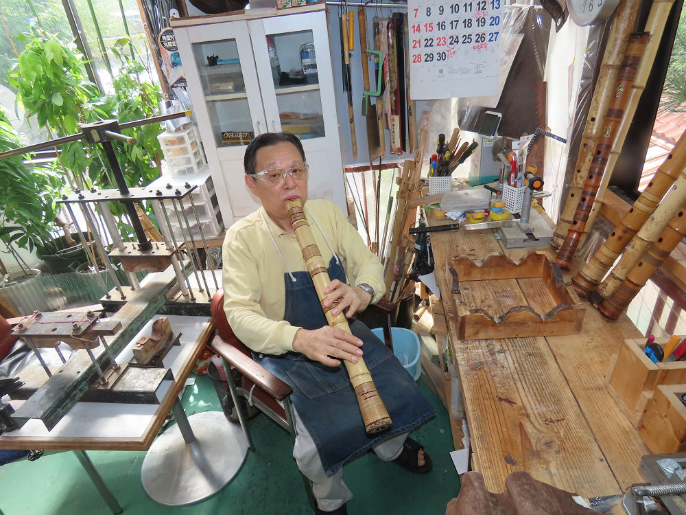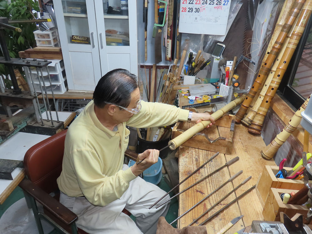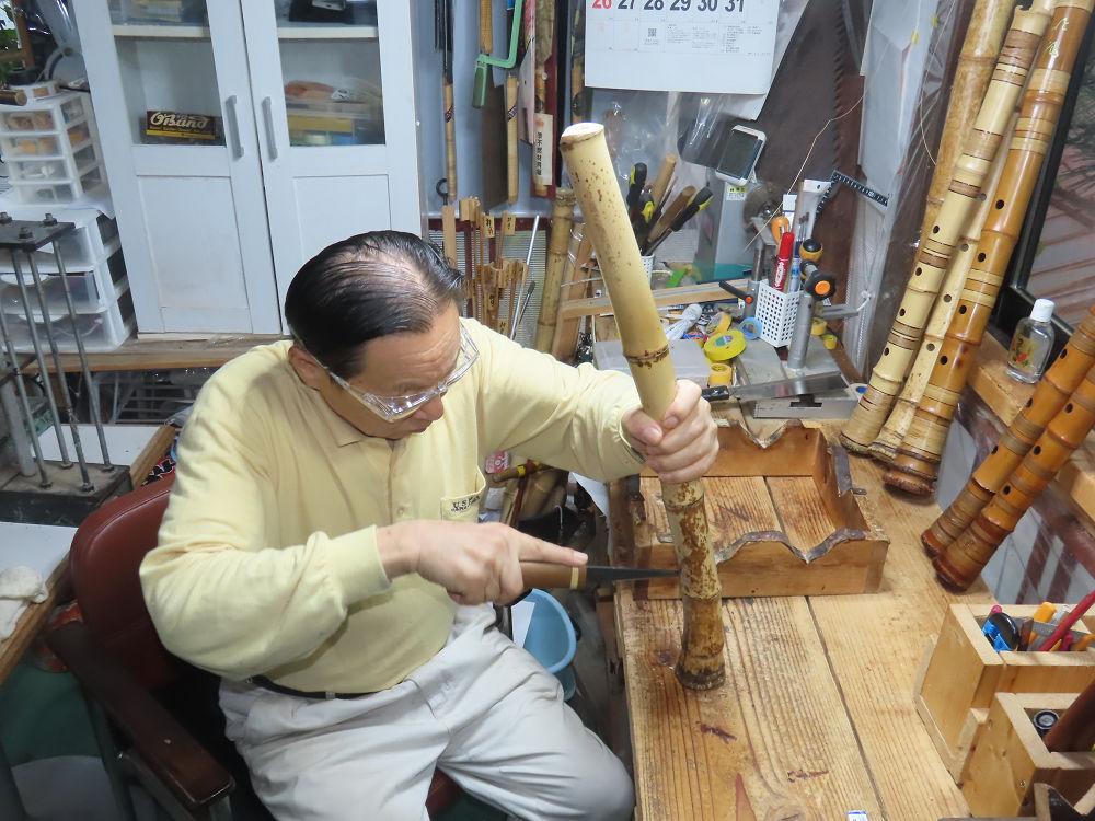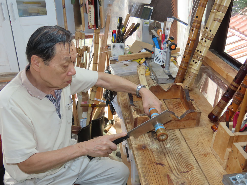 今朝は雨が上がり、高梁の街の周りの山々には、雲海が出ていました。作業を始めたときは長袖でしたが、10時を過ぎて作業場は30℃になり、半そでに着替えました。2尺1寸管の歌口仕上げの後、管尻内部に鼓加工をして、600グラムの2尺1寸管の下作りは完了しました。あまりに重くて、肉厚なので、内径は広くありません。若い頃、岡本竹外先生宅で稽古の時に、先生から太い竹の方が、細い竹より吹くのに楽であると、何度も聞きましたが、その当時は、まだ琴古流尺八で三曲合奏もしていて、吹く奏法なので、意味が理解出来ませんでした。後に琴古流をやめて、地無し尺八を丹田で鳴らす奏法になってから、初めて太い尺八の方が同じ息でも大きな音が出て、楽なことがわかりました。今回の重くて、中の狭い尺八は、歌口を吹く奏法には、良いですが、息受けが良くないので、同じ600グラムでも、太い2尺2寸管の方が、楽に鳴らせます。琴古流や都山流尺八を長年経験され、私に入門されたときに、みなさん細めの2尺3寸管を選ばれます。しかし5年ぐらい過ぎると、やっと太い尺八の方が大きな音が出て、楽であることを理解されます。その時に、太い尺八に交換をしてあげます。そうなると、細い尺八には戻れなくなります。