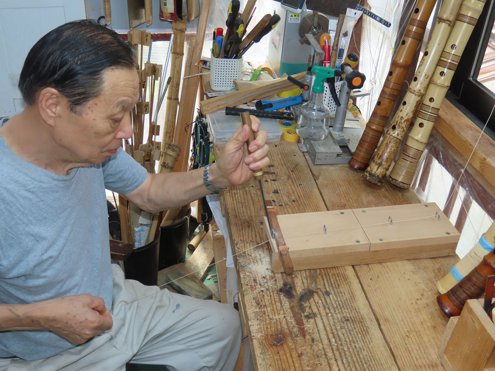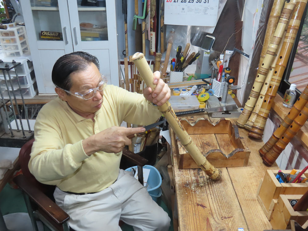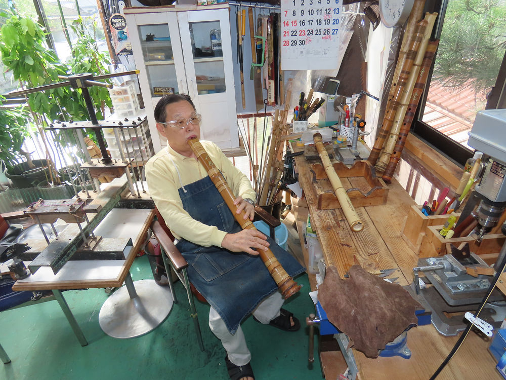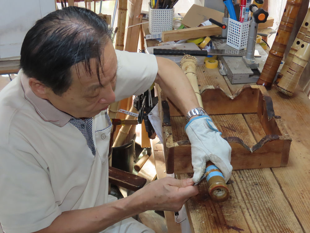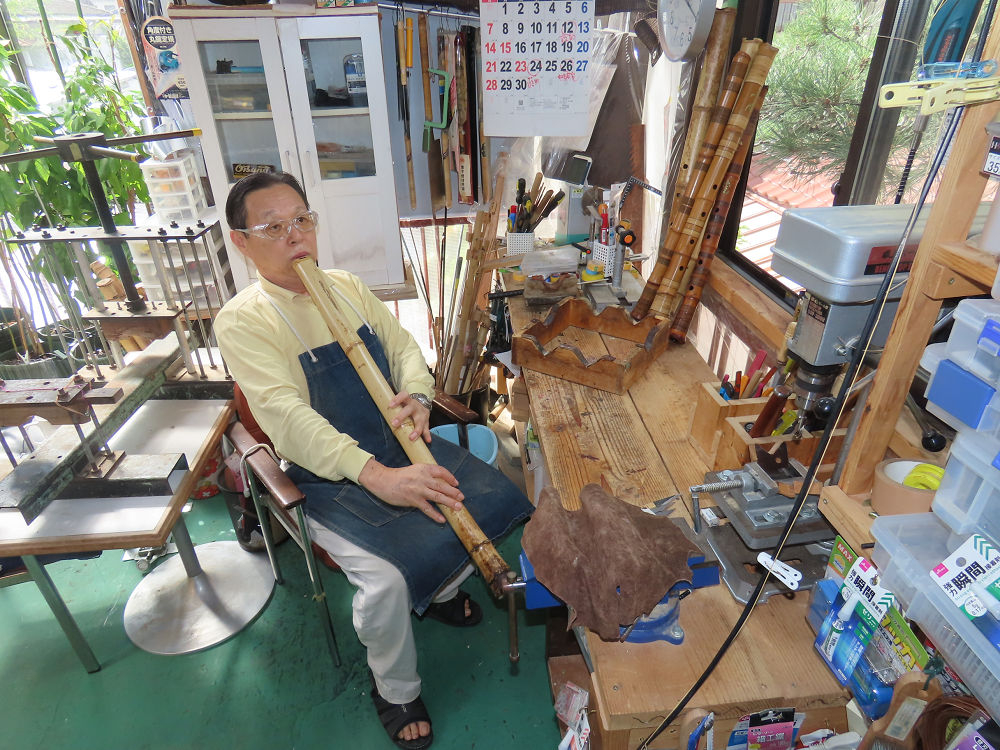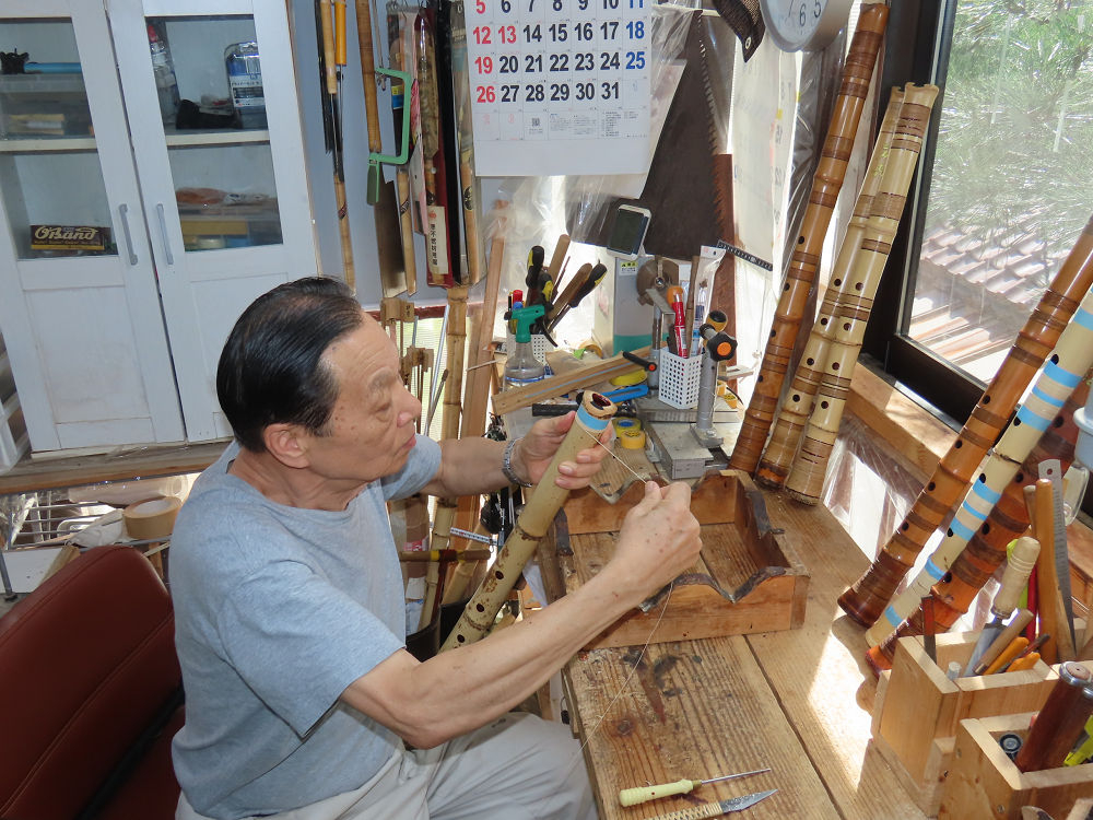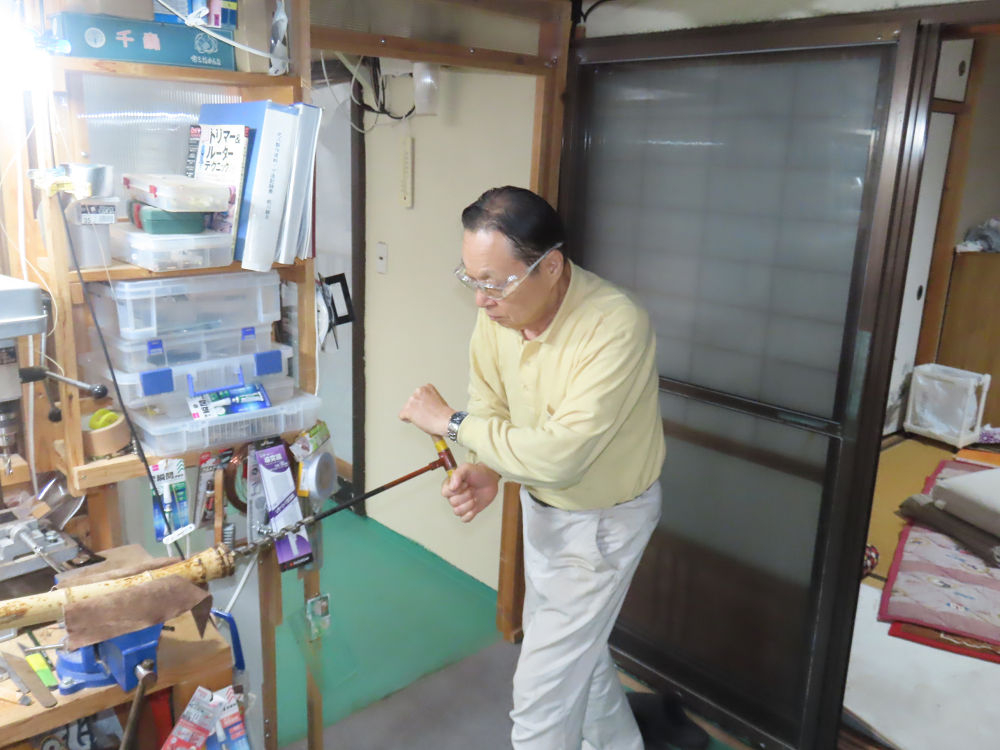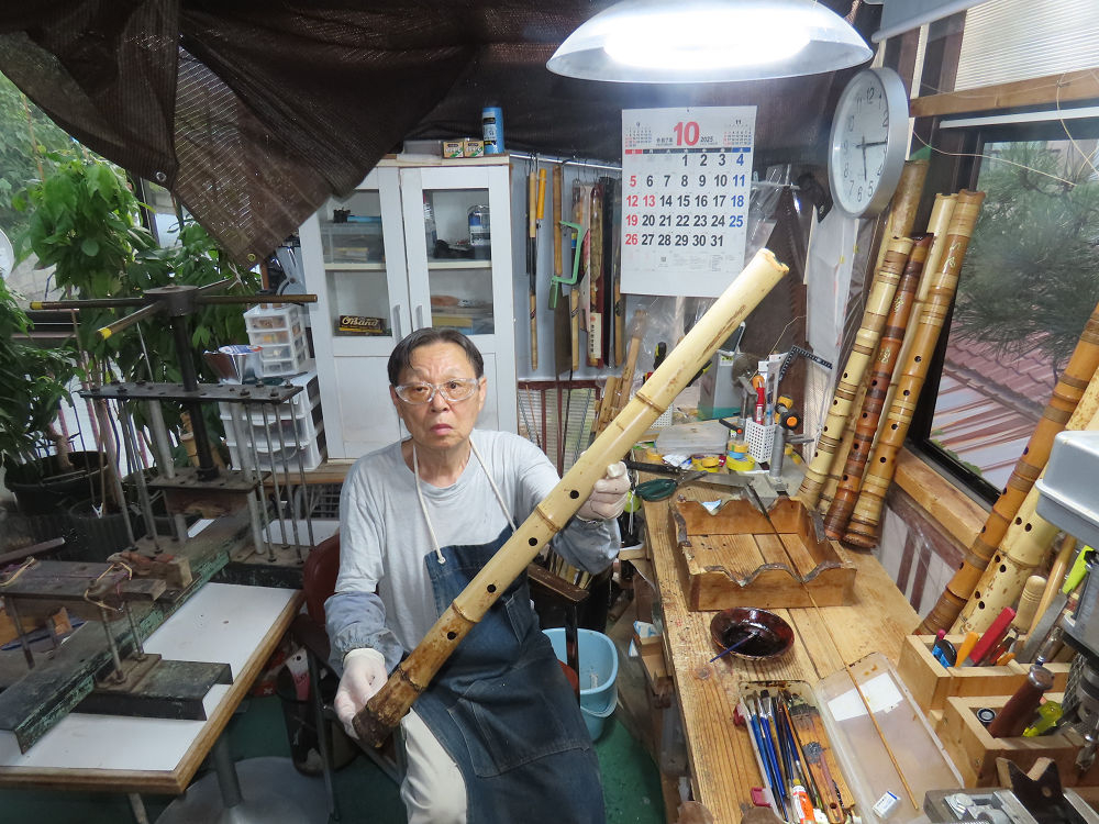 今朝は雨が上がり、高梁の街の周りの山々には、雲海が出ていました。作業を始めたときは長袖でしたが、10時を過ぎて作業場は30℃になり、半そでに着替えました。2尺1寸管の歌口仕上げの後、管尻内部に鼓加工をして、600グラムの2尺1寸管の下作りは完了しました。あまりに重くて、肉厚なので、内径は広くありません。若い頃、岡本竹外先生宅で稽古の時に、先生から太い竹の方が、細い竹より吹くのに楽であると、何度も聞きましたが、その当時は、まだ琴古流尺八で三曲合奏もしていて、吹く奏法なので、意味が理解出来ませんでした。後に琴古流をやめて、地無し尺八を丹田で鳴らす奏法になってから、初めて太い尺八の方が同じ息でも大きな音が出て、楽なことがわかりました。今回の重くて、中の狭い尺八は、歌口を吹く奏法には、良いですが、息受けが良くないので、同じ600グラムでも、太い2尺2寸管の方が、楽に鳴らせます。琴古流や都山流尺八を長年経験され、私に入門されたときに、みなさん細めの2尺3寸管を選ばれます。しかし5年ぐらい過ぎると、やっと太い尺八の方が大きな音が出て、楽であることを理解されます。その時に、太い尺八に交換をしてあげます。そうなると、細い尺八には戻れなくなります。