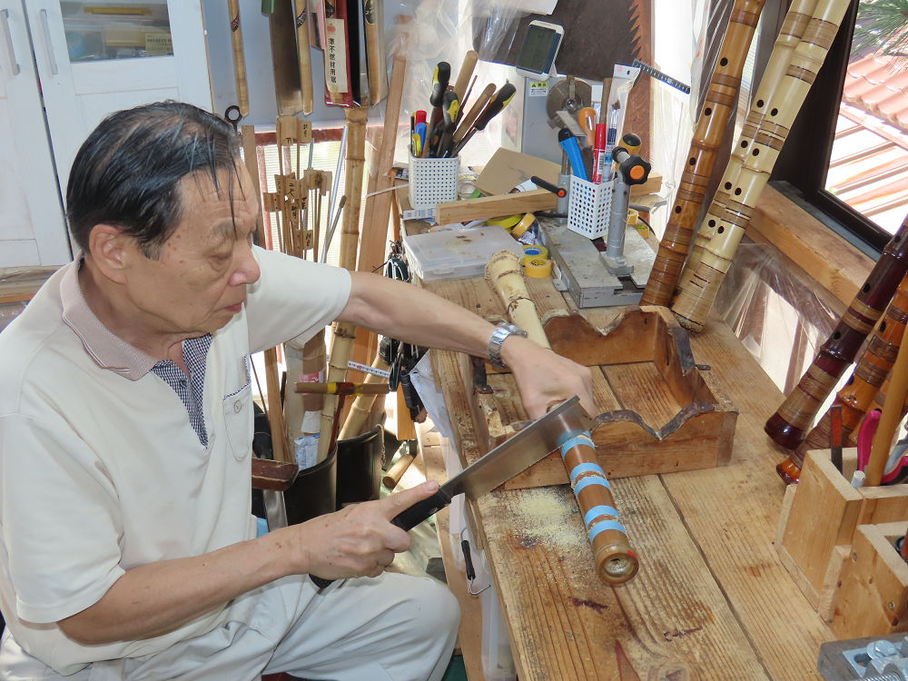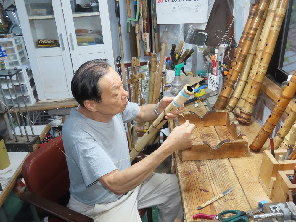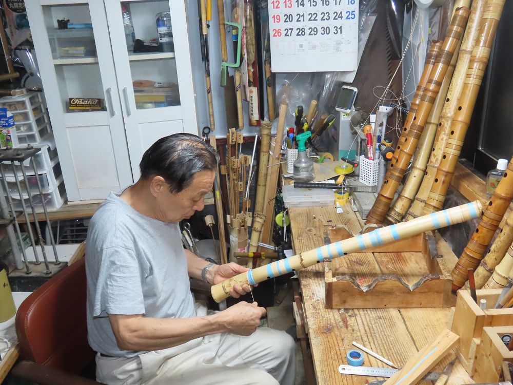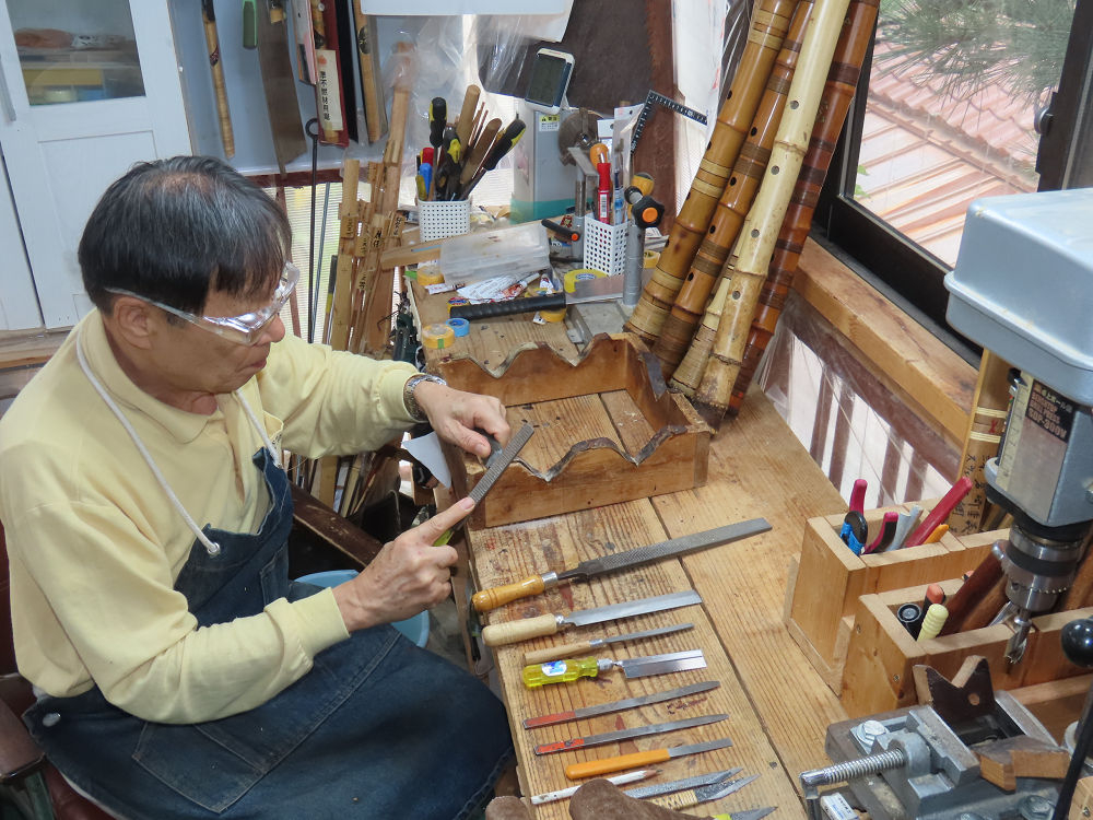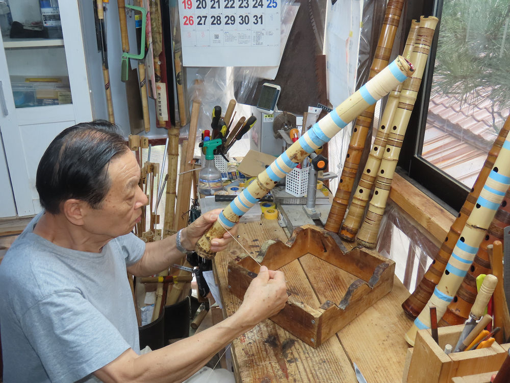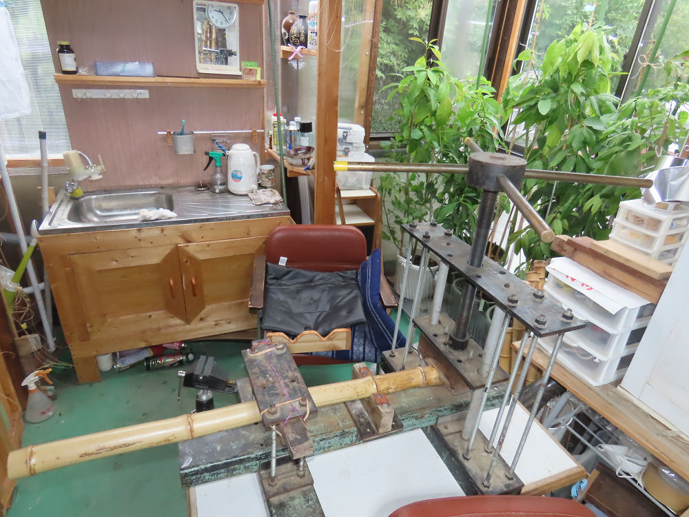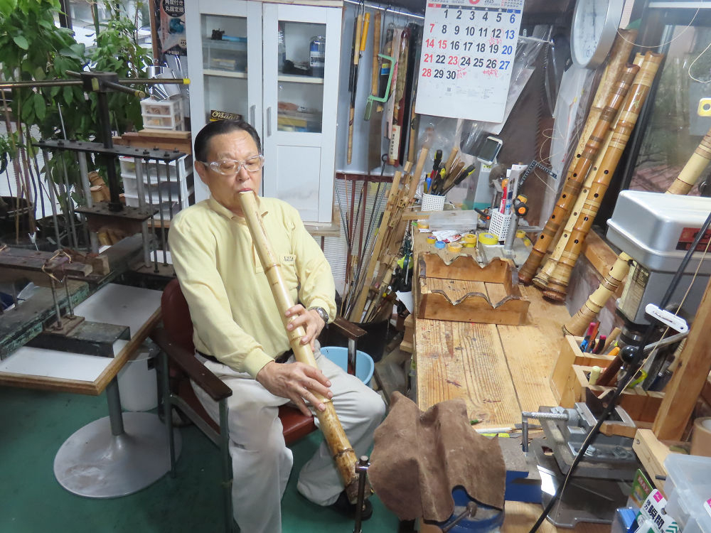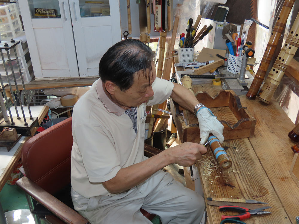 今朝は雨が上がり、高梁の街の周りの山々には、雲海が出ていました。作業を始めたときは長袖でしたが、10時を過ぎて作業場は30℃になり、半そでに着替えました。2尺1寸管の歌口仕上げの後、管尻内部に鼓加工をして、600グラムの2尺1寸管の下作りは完了しました。あまりに重くて、肉厚なので、内径は広くありません。若い頃、岡本竹外先生宅で稽古の時に、先生から太い竹の方が、細い竹より吹くのに楽であると、何度も聞きましたが、その当時は、まだ琴古流尺八で三曲合奏もしていて、吹く奏法なので、意味が理解出来ませんでした。後に琴古流をやめて、地無し尺八を丹田で鳴らす奏法になってから、初めて太い尺八の方が同じ息でも大きな音が出て、楽なことがわかりました。今回の重くて、中の狭い尺八は、歌口を吹く奏法には、良いですが、息受けが良くないので、同じ600グラムでも、太い2尺2寸管の方が、楽に鳴らせます。琴古流や都山流尺八を長年経験され、私に入門されたときに、みなさん細めの2尺3寸管を選ばれます。しかし5年ぐらい過ぎると、やっと太い尺八の方が大きな音が出て、楽であることを理解されます。その時に、太い尺八に交換をしてあげます。そうなると、細い尺八には戻れなくなります。
