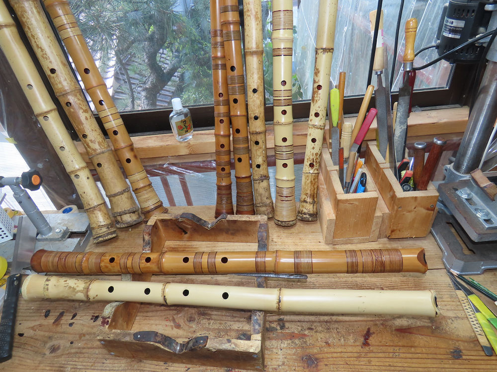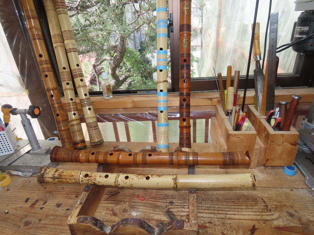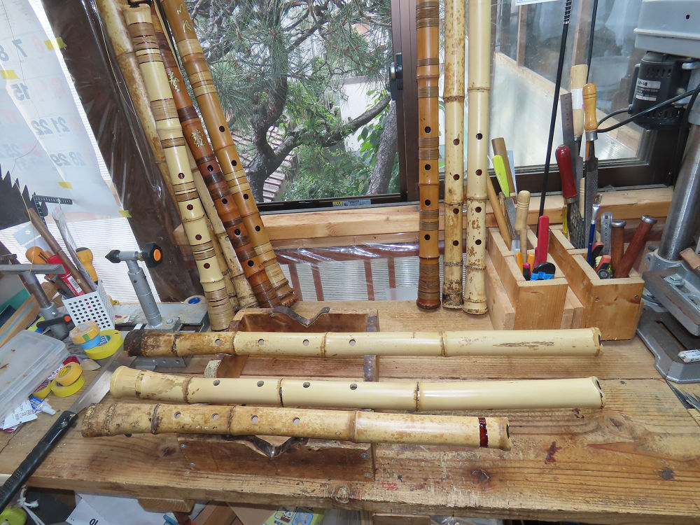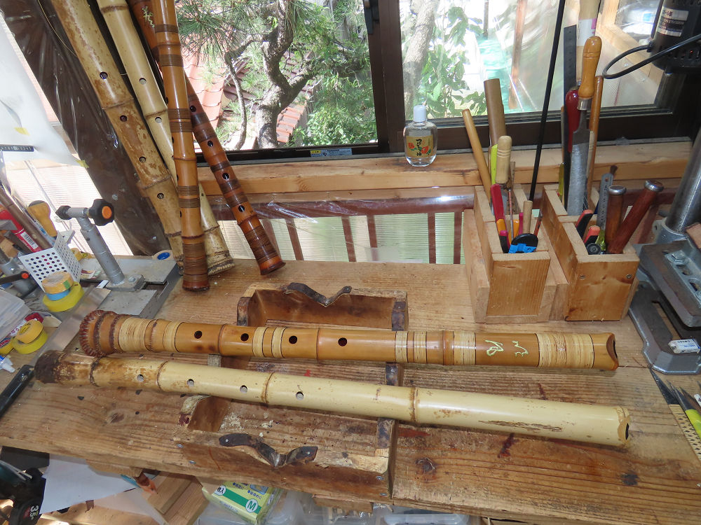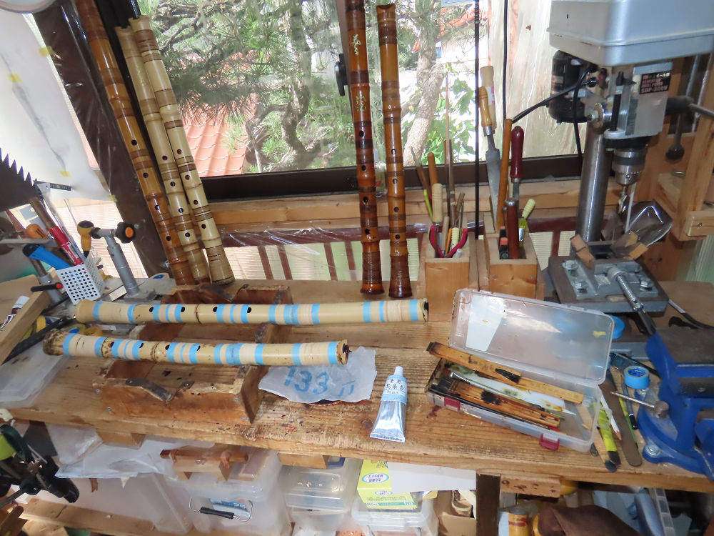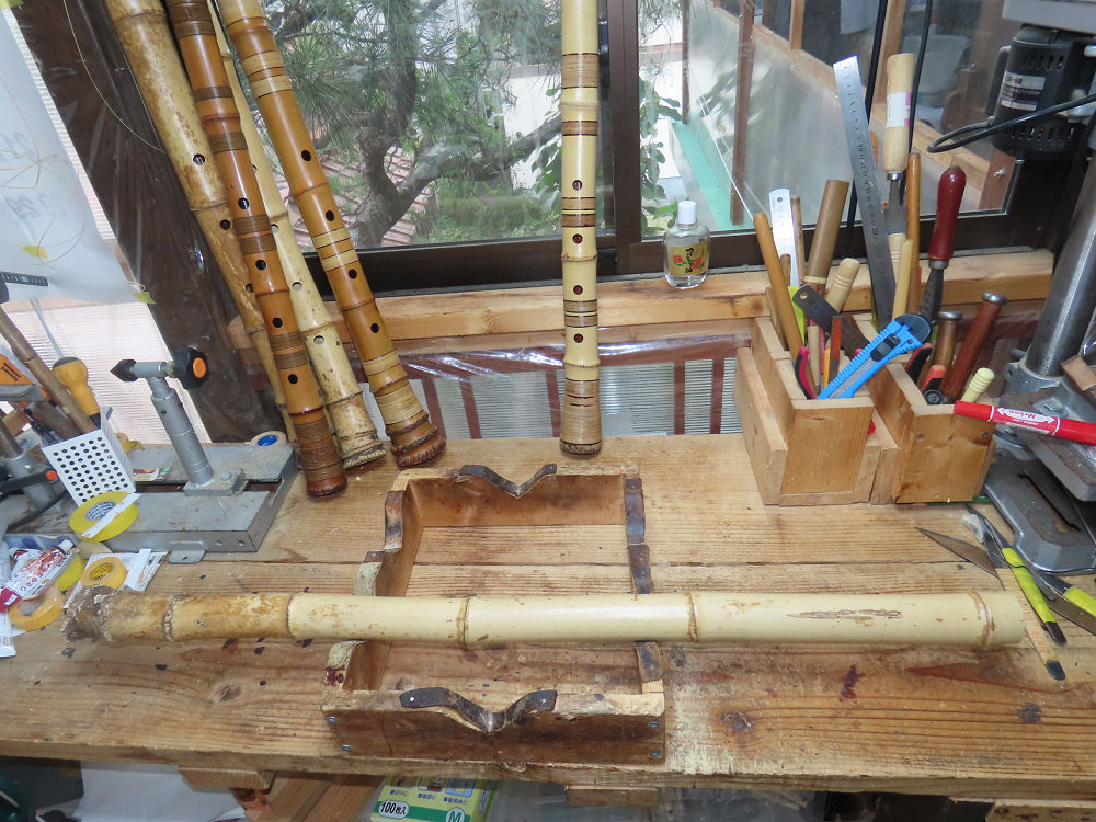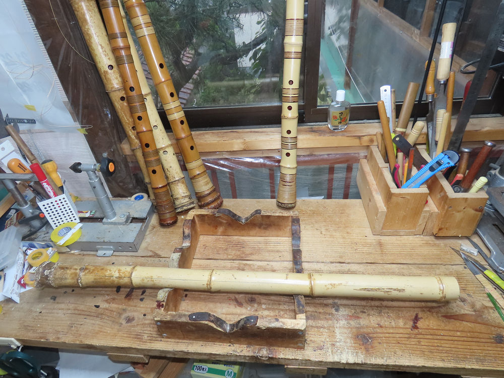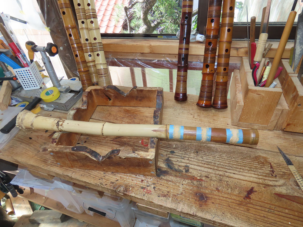 今日は、作業場の観葉植物の床部分のペンキが剥がれていたので、植物を移動して、コンクリート床の塗装をして、午後に乾燥したので、植物をもとに戻しました。その後、新規に2尺9寸管の竹材を用意して、ため直しをした後、節抜き作業、その後、手穴開けまでが完了しました。仕上がり重量が800グラムと、長い曲を吹くには腕が心配になります。門田笛空作の2尺6寸管と同じように、節マタギの尺八になります。みなさんに提供するものは、節間が良い見栄えの良いものを、私の吹き料は3尺をはじめ、節マタギばかりです。今回の2尺9寸も期待ができます。24日に白内障の手術も終わりましたが、まだ保護メガネを寝ているときも着用するようにと眼科医から言われています。幸いに、小さな文字も読めて、老眼鏡は必要ありません。
