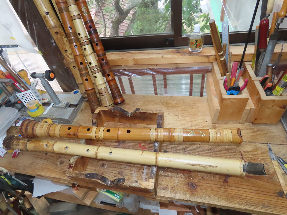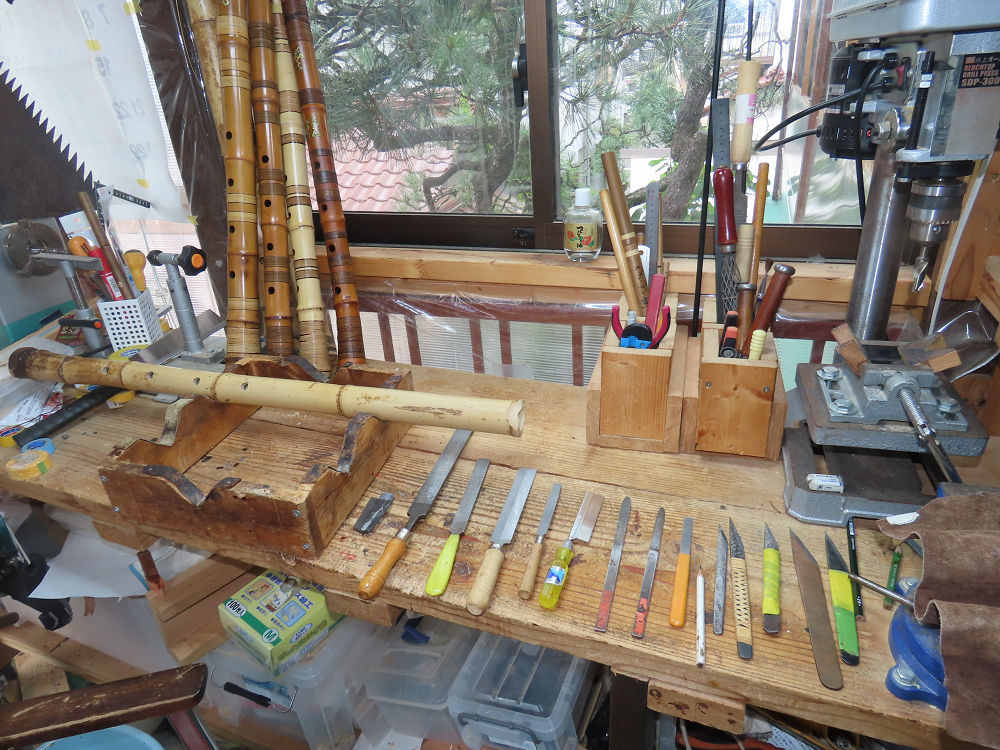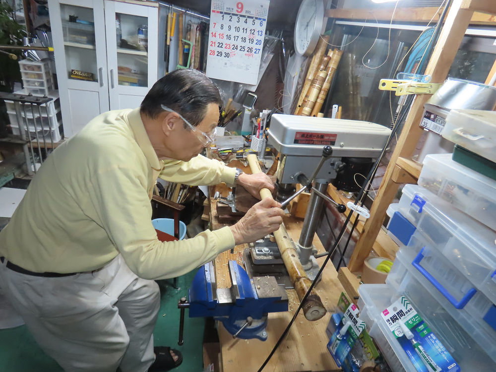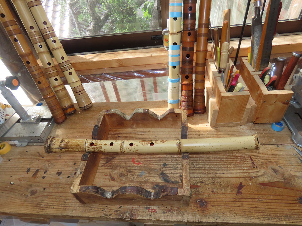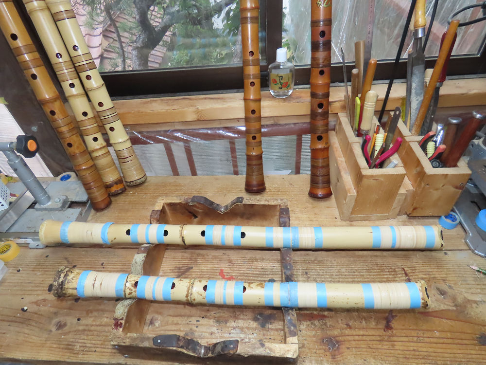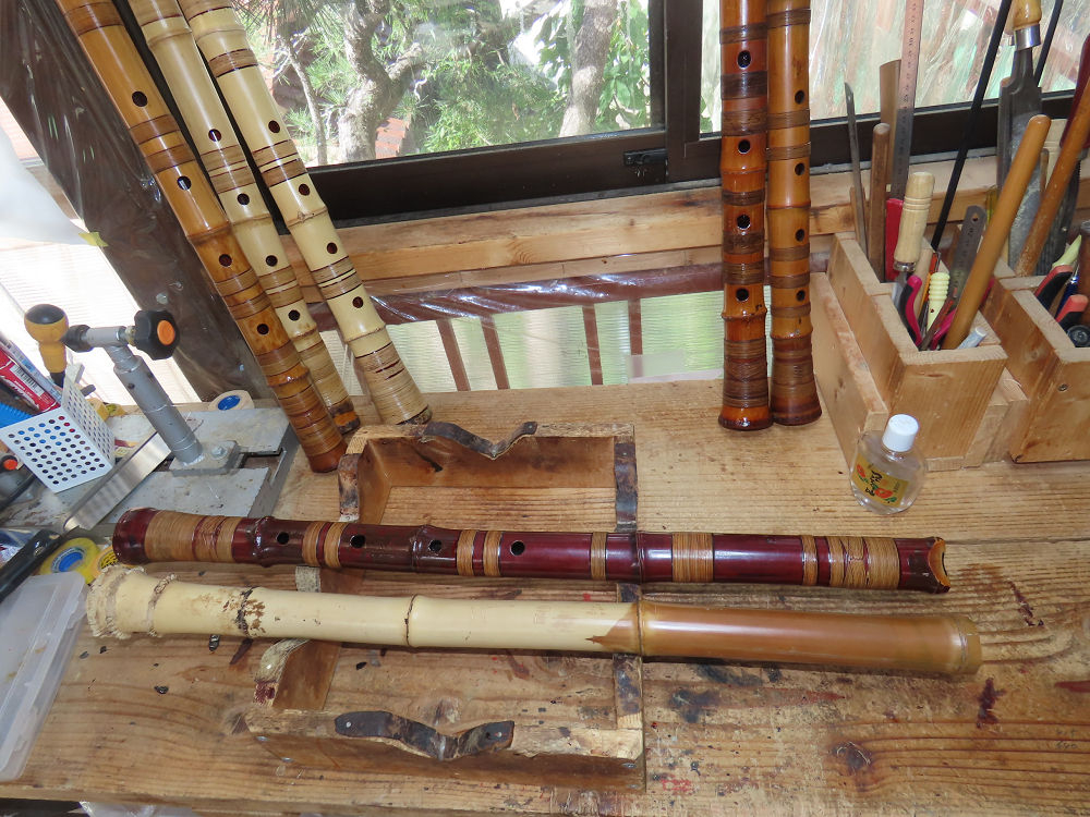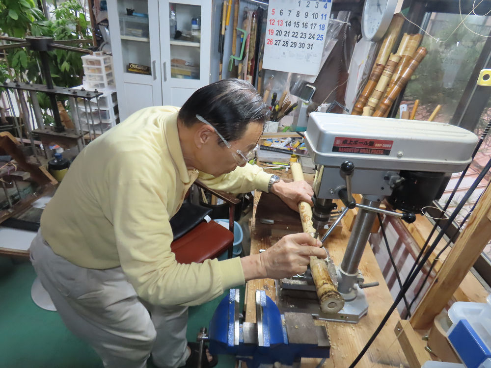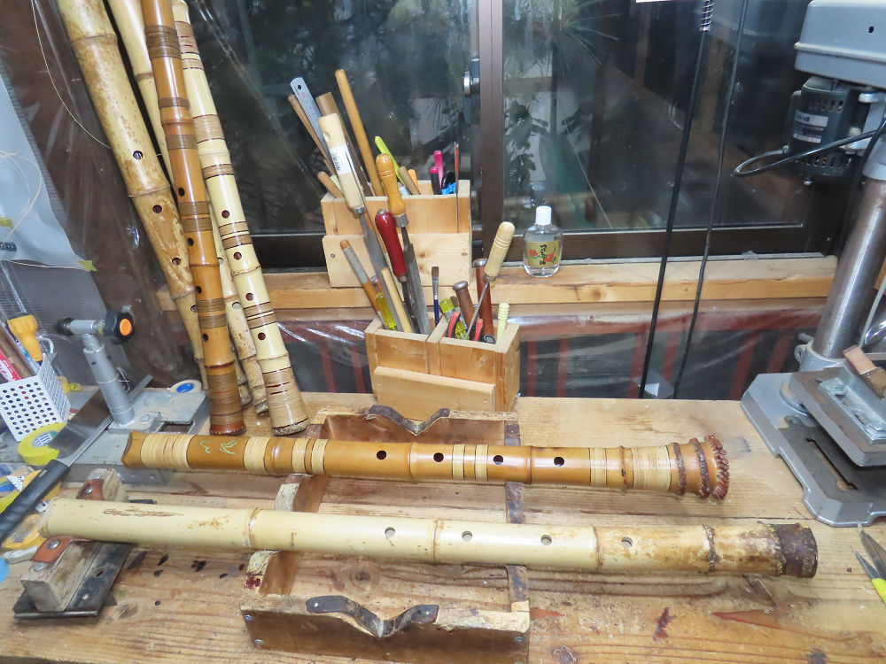 今日は、作業場の観葉植物の床部分のペンキが剥がれていたので、植物を移動して、コンクリート床の塗装をして、午後に乾燥したので、植物をもとに戻しました。その後、新規に2尺9寸管の竹材を用意して、ため直しをした後、節抜き作業、その後、手穴開けまでが完了しました。仕上がり重量が800グラムと、長い曲を吹くには腕が心配になります。門田笛空作の2尺6寸管と同じように、節マタギの尺八になります。みなさんに提供するものは、節間が良い見栄えの良いものを、私の吹き料は3尺をはじめ、節マタギばかりです。今回の2尺9寸も期待ができます。24日に白内障の手術も終わりましたが、まだ保護メガネを寝ているときも着用するようにと眼科医から言われています。幸いに、小さな文字も読めて、老眼鏡は必要ありません。