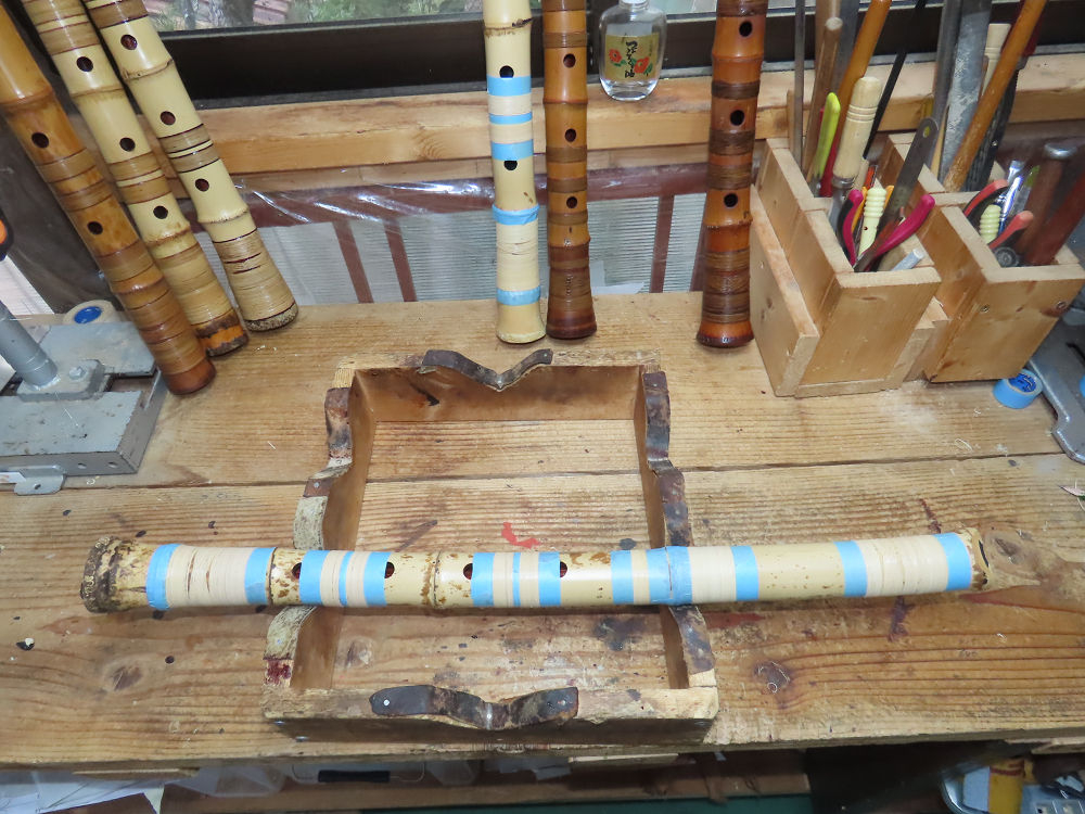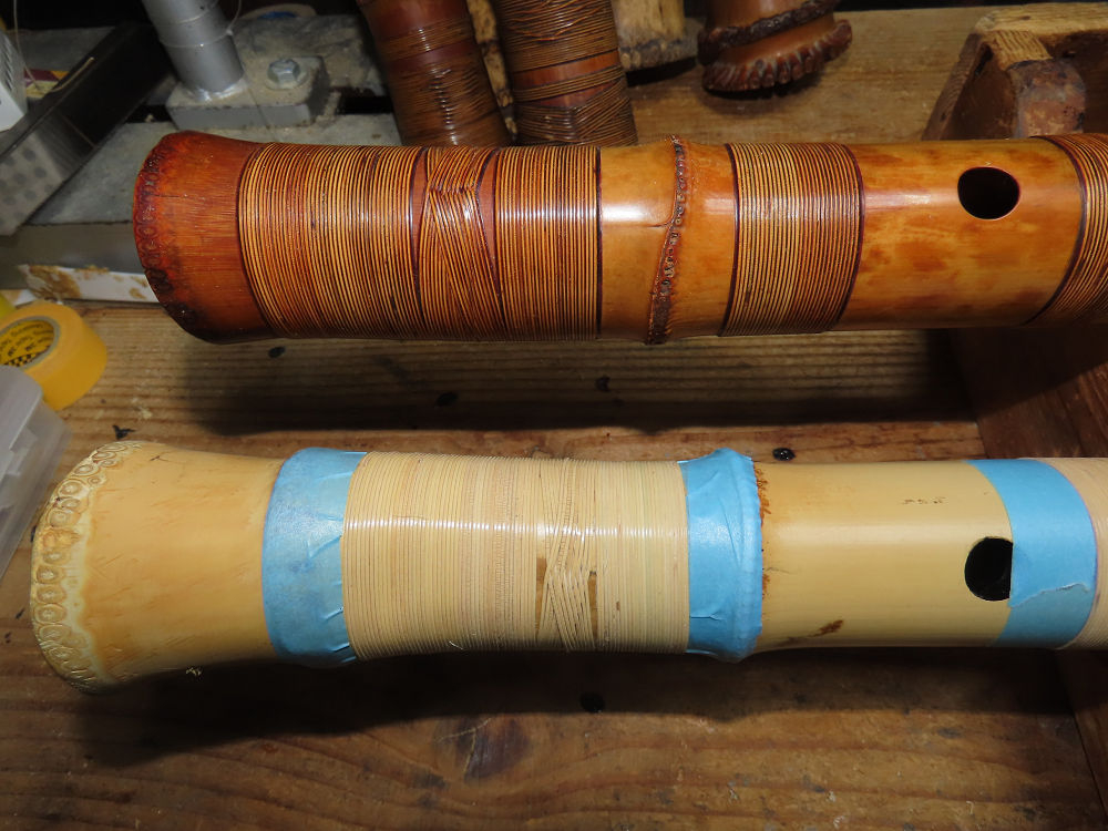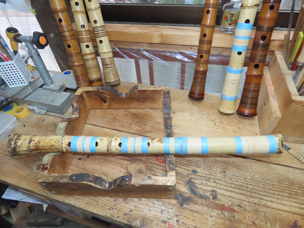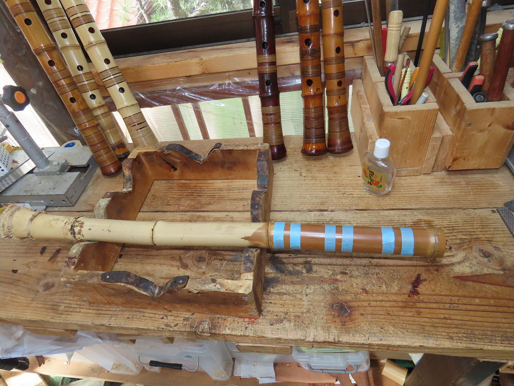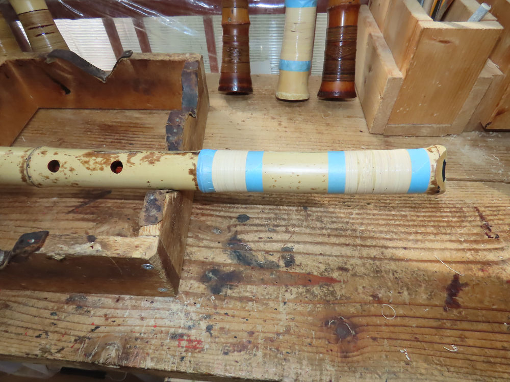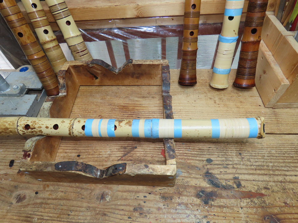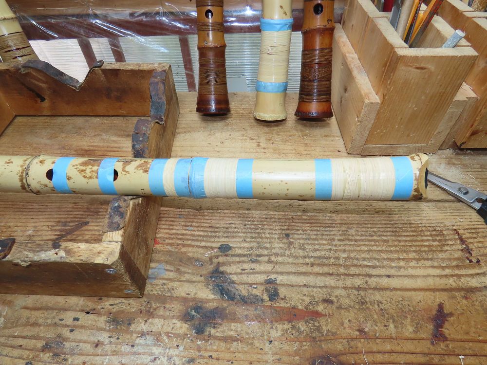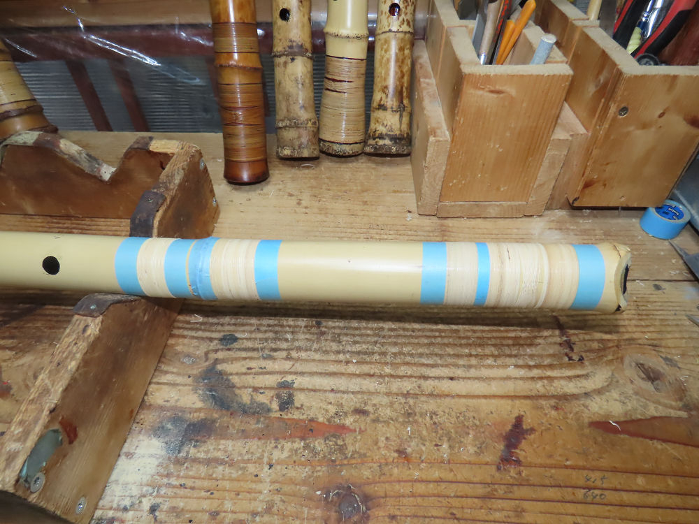 昨日、右目の白内障手術を受けて、眼科に泊まり、今朝の診察を受けてから帰宅しました。明日は、内科と眼科の通院で1日が終わりそうです。2尺2寸管の藤巻縁塗りが乾燥しました。養生テープを取り除きましたが、一か所、補修が必要なので、再度、漆塗りをして室箱に入れました。これが乾燥すれば、完成です。これまでの錦風流用の吹き料、2尺2寸管、どちらも560グラムでしたが、今回は600グラム、やはり重量が重い方が音味が良いです。