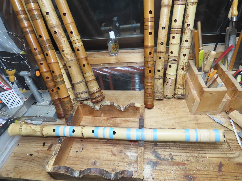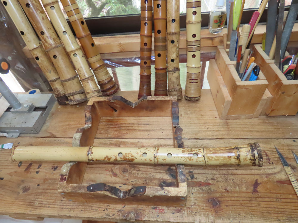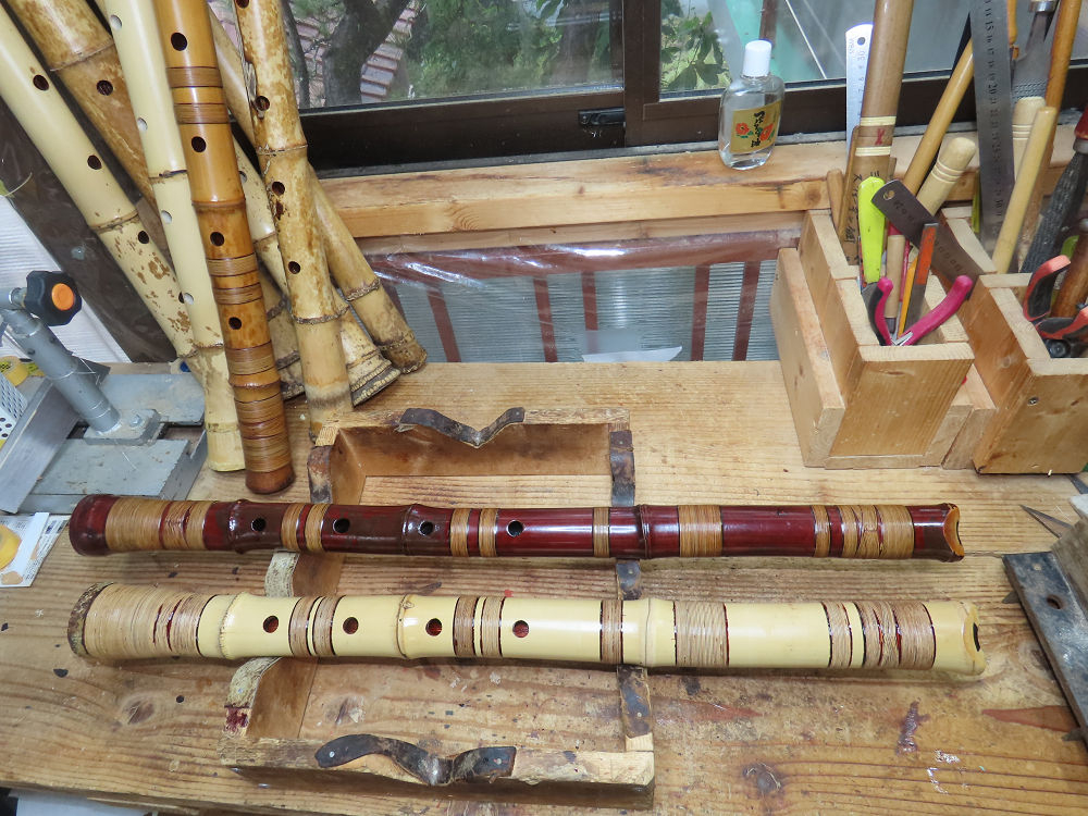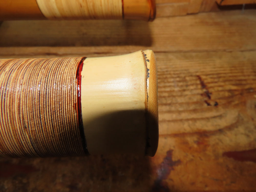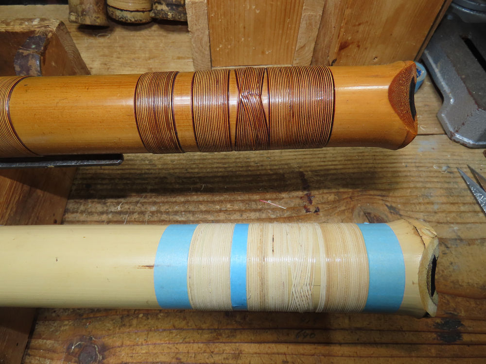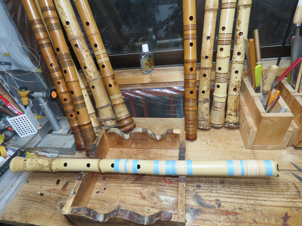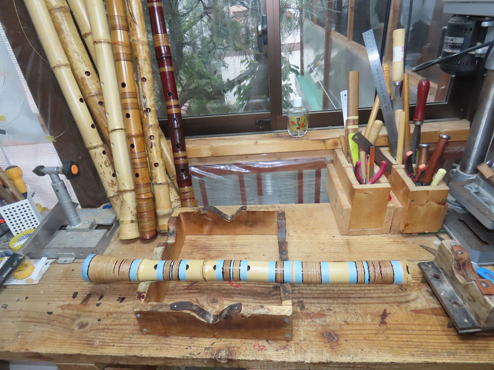 昨日、右目の白内障手術を受けて、眼科に泊まり、今朝の診察を受けてから帰宅しました。明日は、内科と眼科の通院で1日が終わりそうです。2尺2寸管の藤巻縁塗りが乾燥しました。養生テープを取り除きましたが、一か所、補修が必要なので、再度、漆塗りをして室箱に入れました。これが乾燥すれば、完成です。これまでの錦風流用の吹き料、2尺2寸管、どちらも560グラムでしたが、今回は600グラム、やはり重量が重い方が音味が良いです。