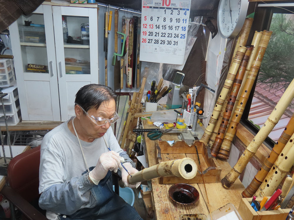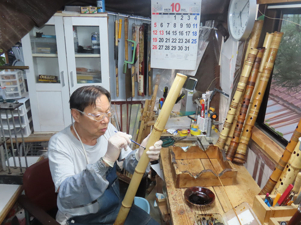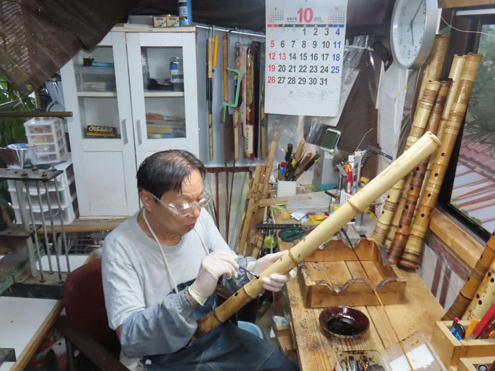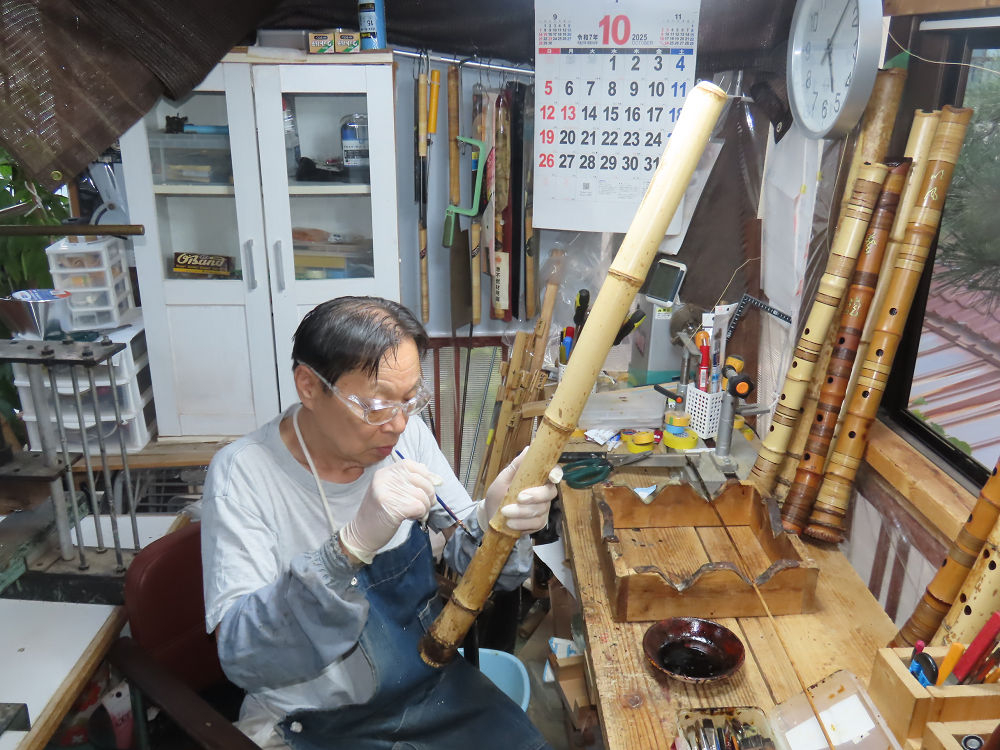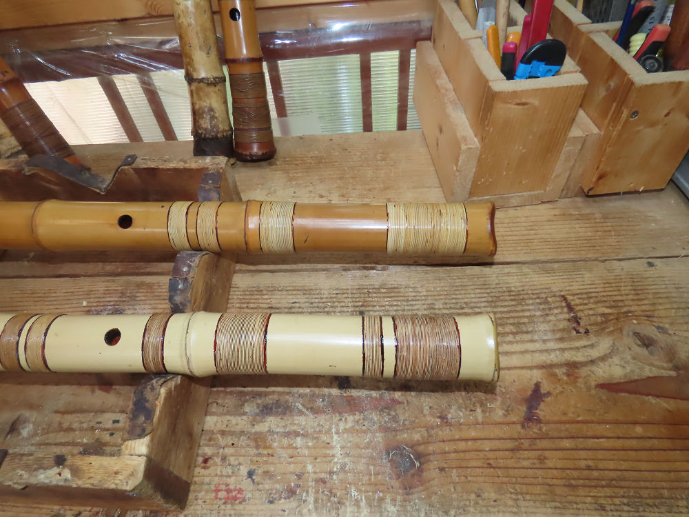 地無し尺八製作(その1)(2025.10.9)2本の尺八、藤巻表面漆塗り他作業